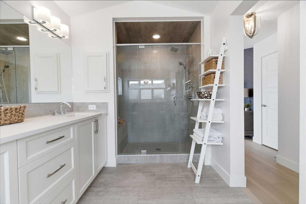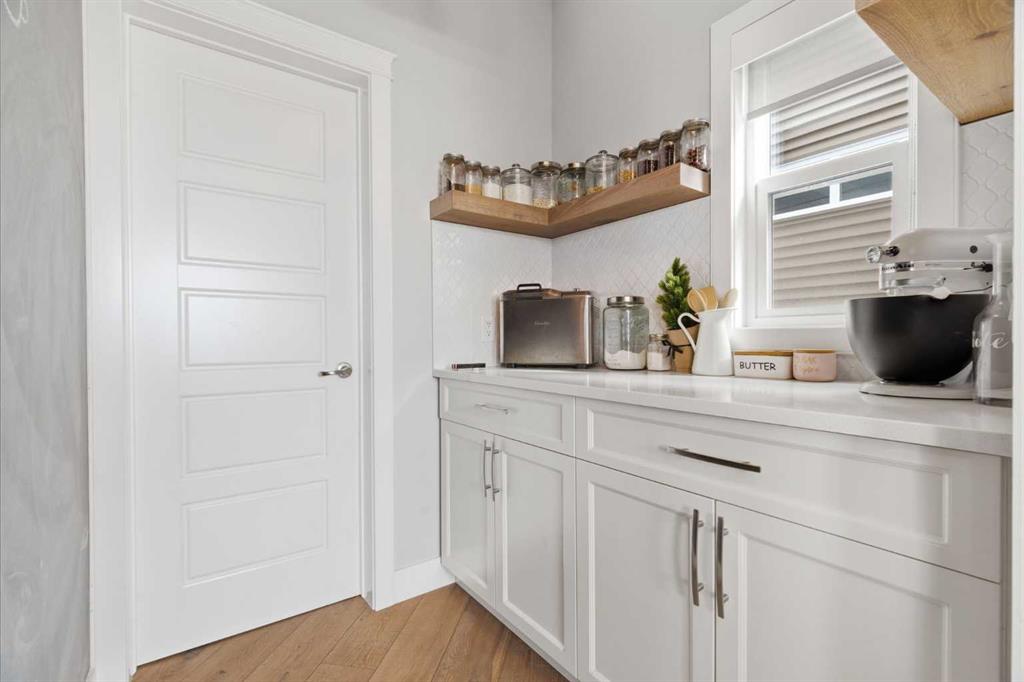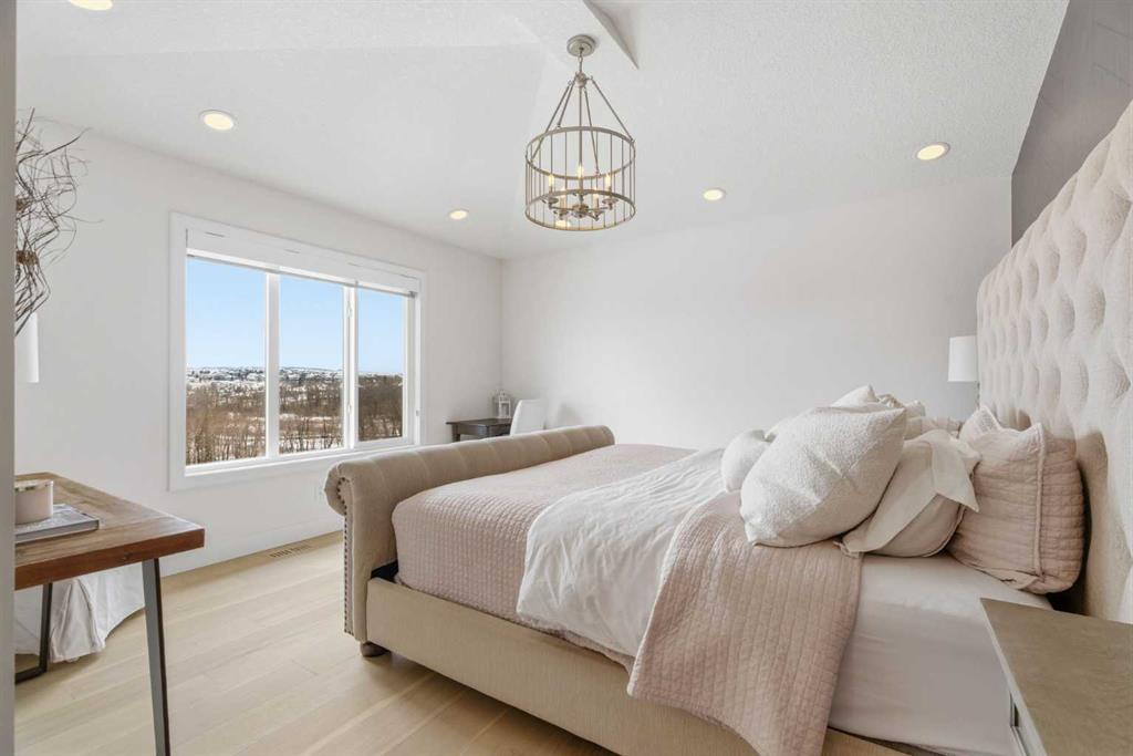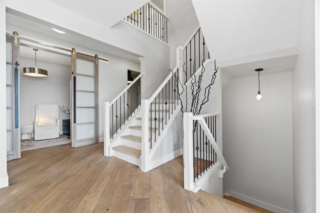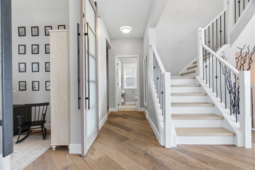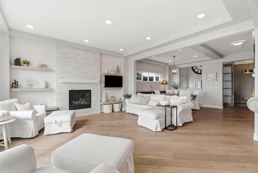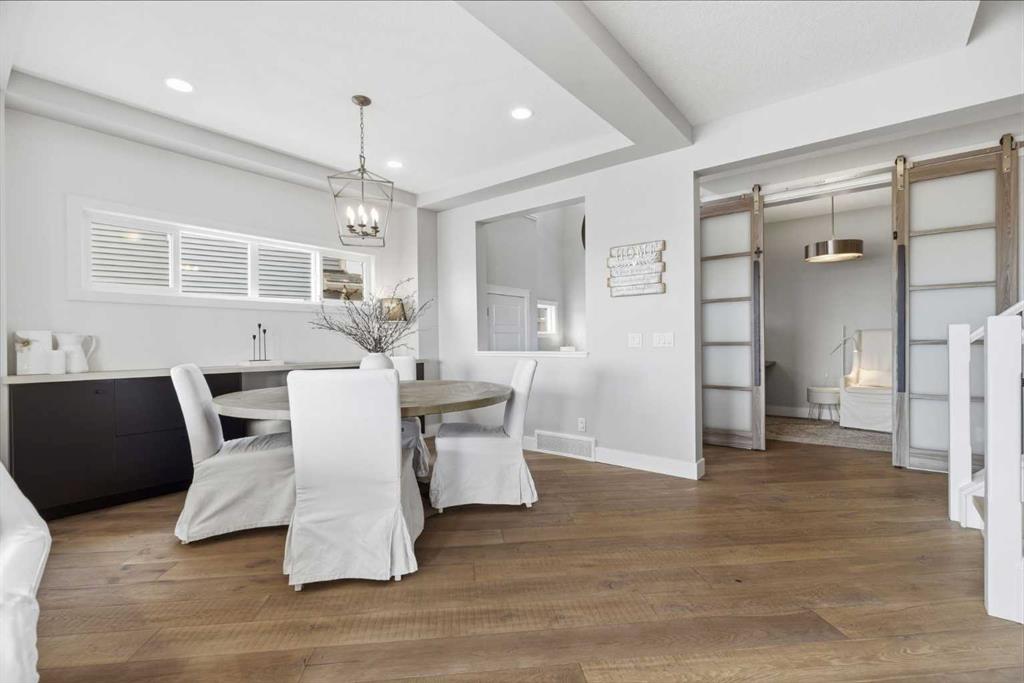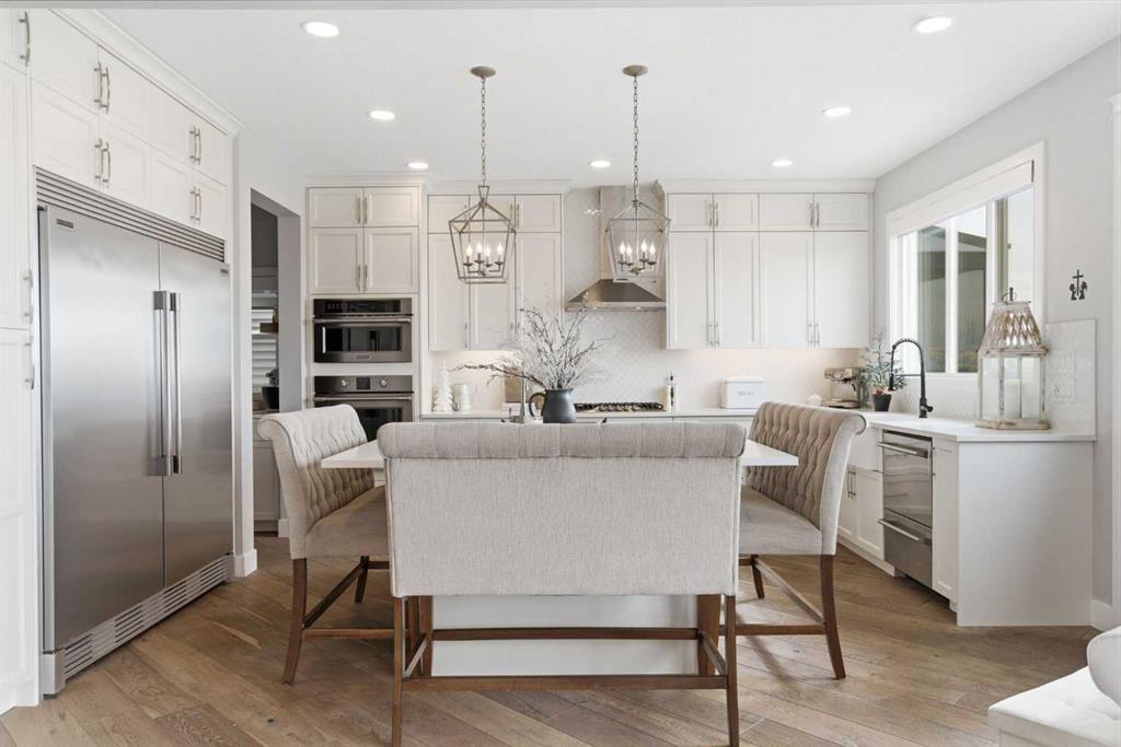 Perched on a sun-soaked south-facing ridge, this stunning home offers truly breathtaking MOUNTAIN and RIVER VALLEY views you’ll never tire of. With almost 3,700 sq ft of beautifully finished living space across three levels, this property blends high-end craftsmanship with thoughtful, functional design throughout. The main floor immediately impresses with upgraded hardwood flooring, tray ceilings, a dedicated home office, and a well-designed mudroom complete with custom built-ins and lockers. The open-concept layout is perfect for both everyday living and entertaining, featuring a spacious dining area with a built-in buffet and custom shelving that flows seamlessly into the inviting living room. Here, a gorgeous stone fireplace and expansive windows frame those unforgettable panoramic views. At the heart of the home is a truly show-stopping, award-winning kitchen. Designed for both style and performance, it features an industrial-sized fridge/freezer, built-in appliances, double dishwashers, and ceiling-height cabinetry with soft-close features. A walk-through butler’s pantry connects to a massive walk-in pantry for ultimate convenience. The oversized 38 sq ft island is perfect for gathering—comfortably seating the whole family while you take in sweeping 180-degree views over Okotoks. This kitchen is more than just functional—it’s a standout feature of the home. Upstairs, enjoy brand NEW HARDWOOD flooring. The thoughtfully placed family room creates separation between the children’s or guest wing and the impressive primary retreat. The primary suite is a sanctuary, with vaulted ceilings in both the bedroom and ensuite, elegant upgraded lighting, and incredible views of the Sheep River and Rocky Mountains that change beautifully with the seasons. A well-appointed laundry room on this level includes plenty of cabinetry, a sink, and built-in drying racks. The additional front bedrooms offer flexible space to suit your needs. The fully finished basement carries a modern loft-style feel with upgraded LVP flooring. This level offers incredible versatility with space for a home office or study area, a private gym with durable rubber flooring, an additional bedroom, and a spa-inspired 3-piece bathroom with heated floors. Smart design ensures plenty of storage throughout, along with custom barn doors to easily create privacy where needed. Step outside to your own private backyard retreat, designed for low-maintenance enjoyment year-round. Featuring zero-scaped landscaping, a custom herringbone deck, stone patio, and a built-in fireplace, this space is ideal for relaxing or entertaining. You’ll even have a front-row seat to local fireworks throughout the year. Located just steps from scenic walking paths, the Sheep River, and the charm of downtown Elizabeth Street, this home offers the perfect balance of peaceful small-town living with the convenience of being only 15 minutes from Calgary.