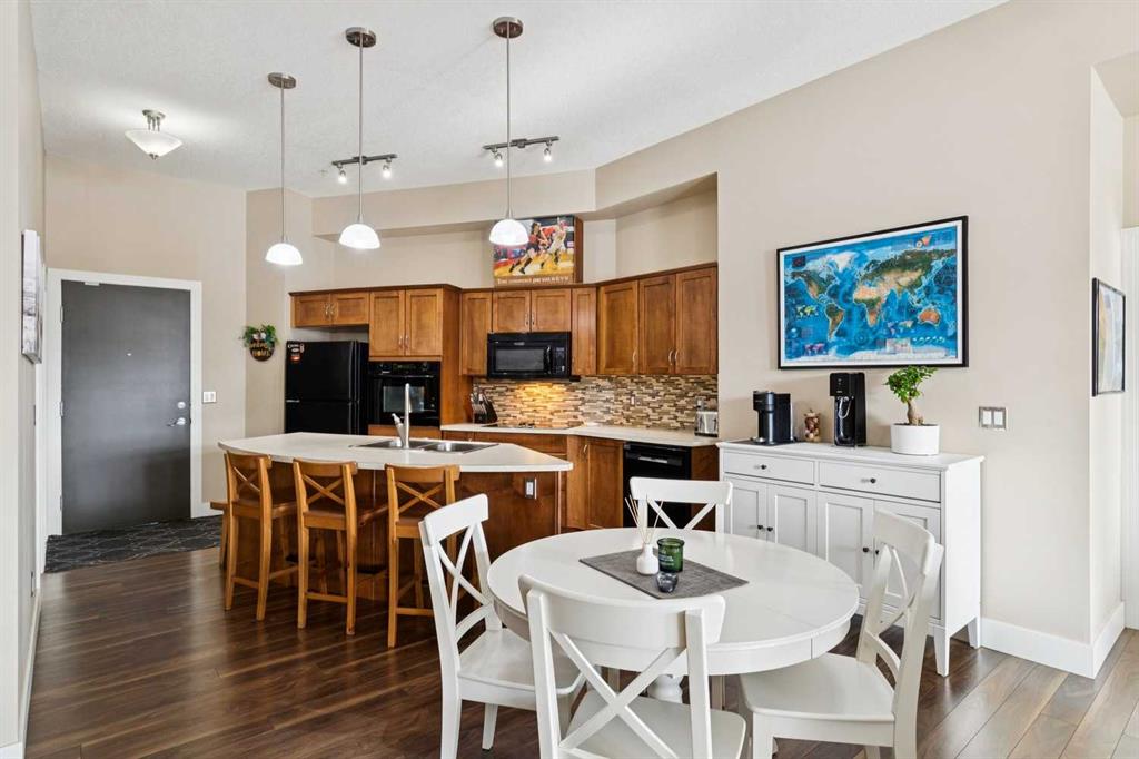 The interior features over $35,000 in premium upgrades, characterized by high ceilings and expansive windows that fill the open layout with natural light. Durable laminate flooring flows through the main living spaces and bedrooms, while the two ensuite bathrooms are finished with practical ceramic tile. The kitchen is a central highlight, equipped with medium-toned maple cabinetry, black appliances, and a curved island with seating for three. Nearby, a dedicated computer area with ample built-in storage provides an organized space for remote work or studying.