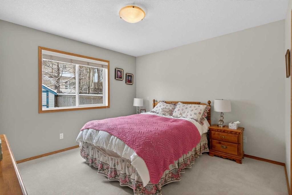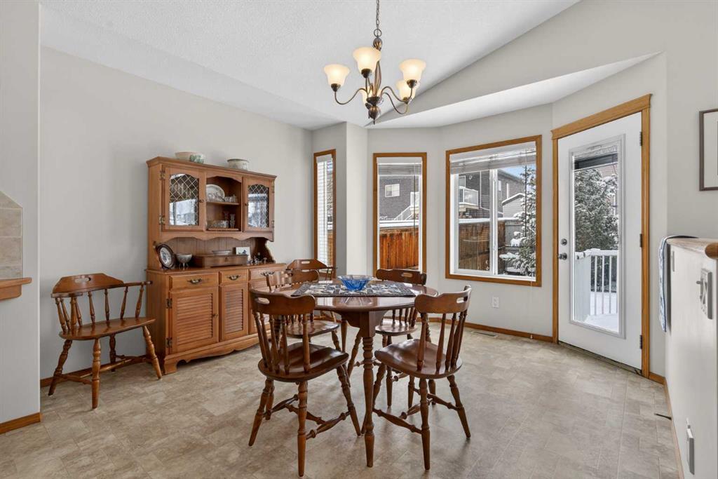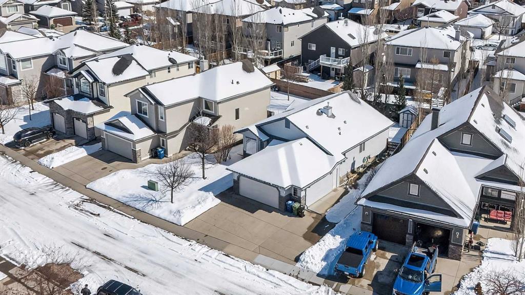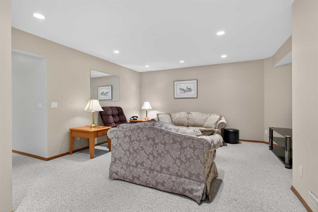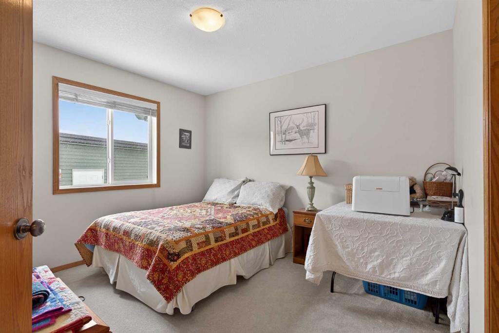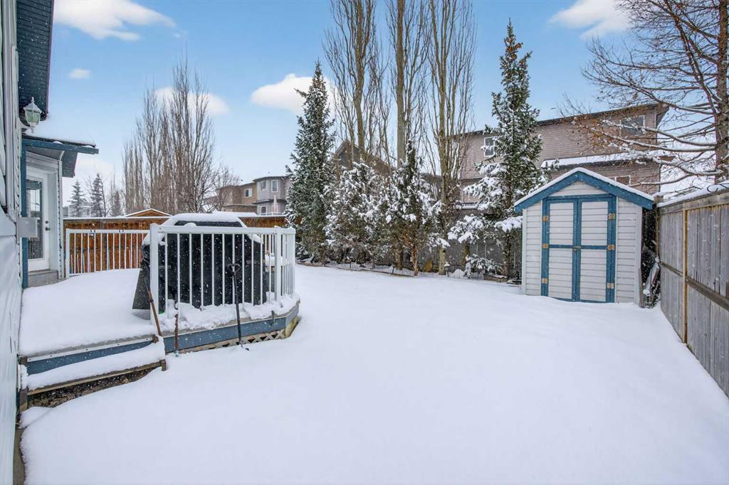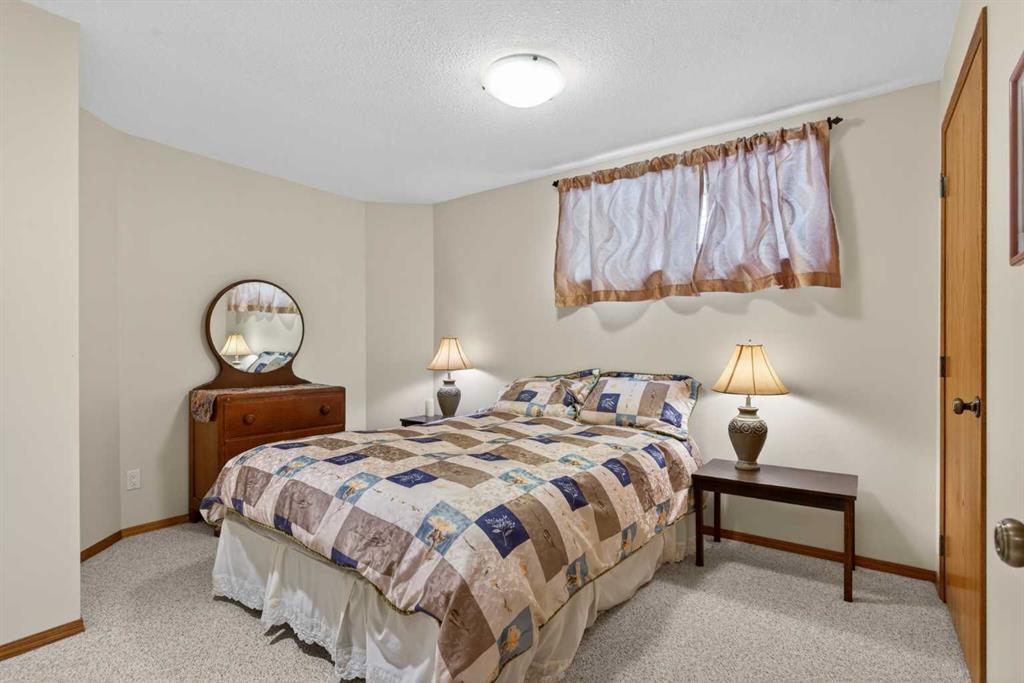 Welcome home! It’s rare to find an original owner bungalow of this size and value in Airdrie. From the moment you step into the spacious front entry, you’ll appreciate the thoughtful layout and inviting feel of this home. French doors lead you into a versatile front flex room, perfect for a home office, sitting area, or playroom, before opening into the bright, open concept main living space. The kitchen is truly the heart of the home, featuring a large eat up island, gleaming oak cabinetry with under mount lighting, select stainless steel appliances, a convenient corner pantry, and a skylight that fills the space with natural light. Just steps away, the generous family room offers a cozy gas fireplace, ideal for relaxing evenings, and large windows that overlook the backyard. The dining area flows seamlessly from the kitchen and provides direct access to the rear yard, making it perfect for entertaining. Outside, you’ll find a large deck with a natural gas BBQ hookup, a storage shed, and plenty of green space for kids and pets to enjoy. Down the hallway, you’ll find a conveniently located laundry room complete with a sink and direct access to the oversized, insulated double garage. The main floor also features a well sized second bedroom, a full four piece bathroom, and a spacious primary suite that easily accommodates a king sized bed. The primary retreat is complete with a walk in closet and a private four piece ensuite featuring a relaxing jetted tub. The fully finished lower level expands your living space with a massive recreation room, perfect for movie nights, games, or gatherings, along with two additional generously sized bedrooms, another full bathroom, and a dedicated storage area with a small workshop. Situated on a desirable, gently pie shaped lot, this home also offers a large driveway with room for two vehicles plus RV parking. Additional highlights include a high efficiency furnace and an unbeatable location, just steps from scenic walking and bike paths around the lake, within walking distance to schools, and close to shopping and everyday amenities.
