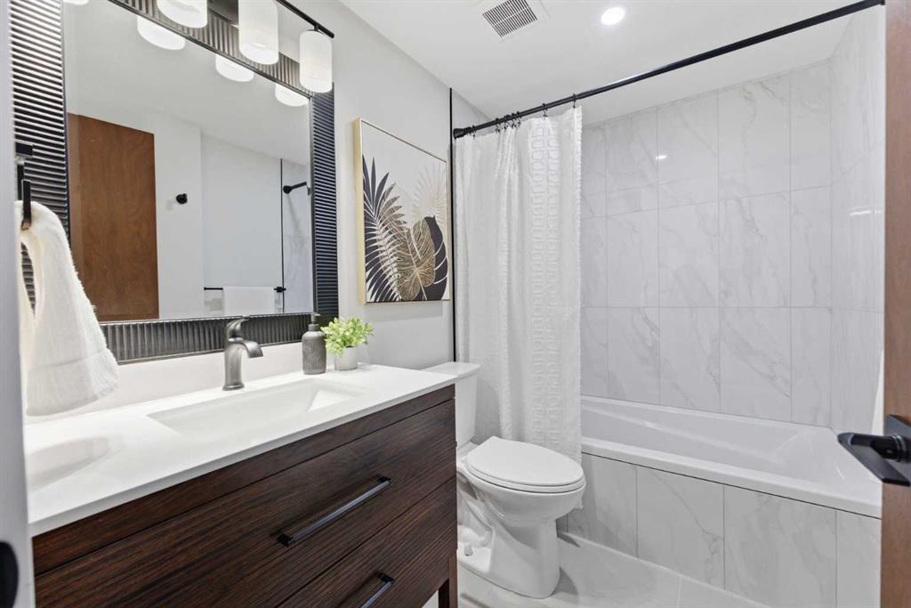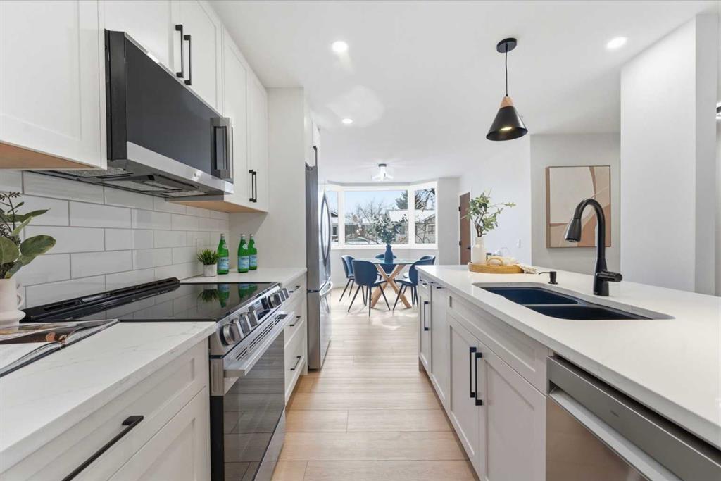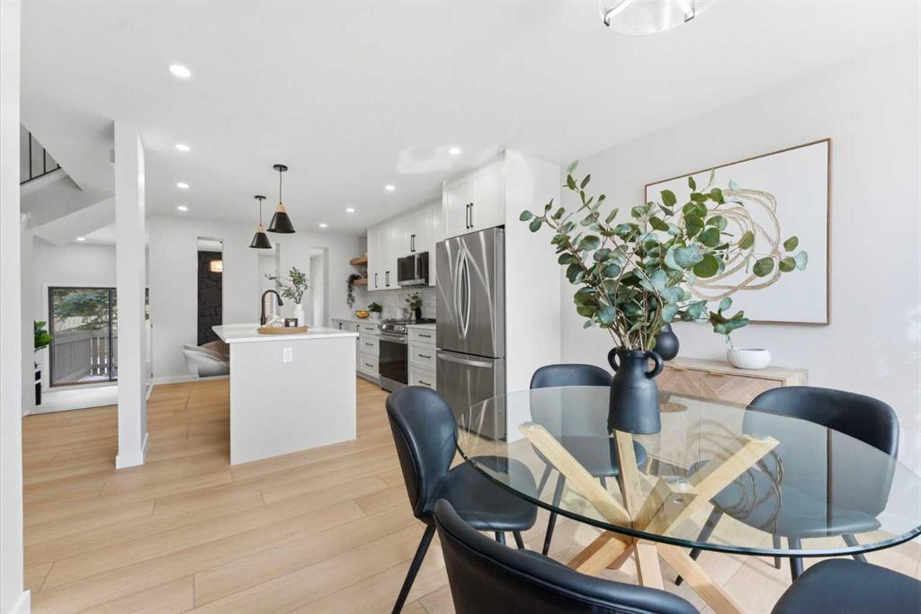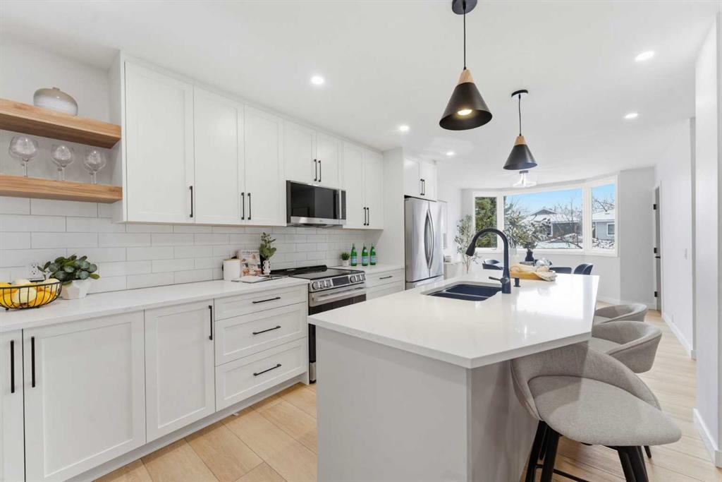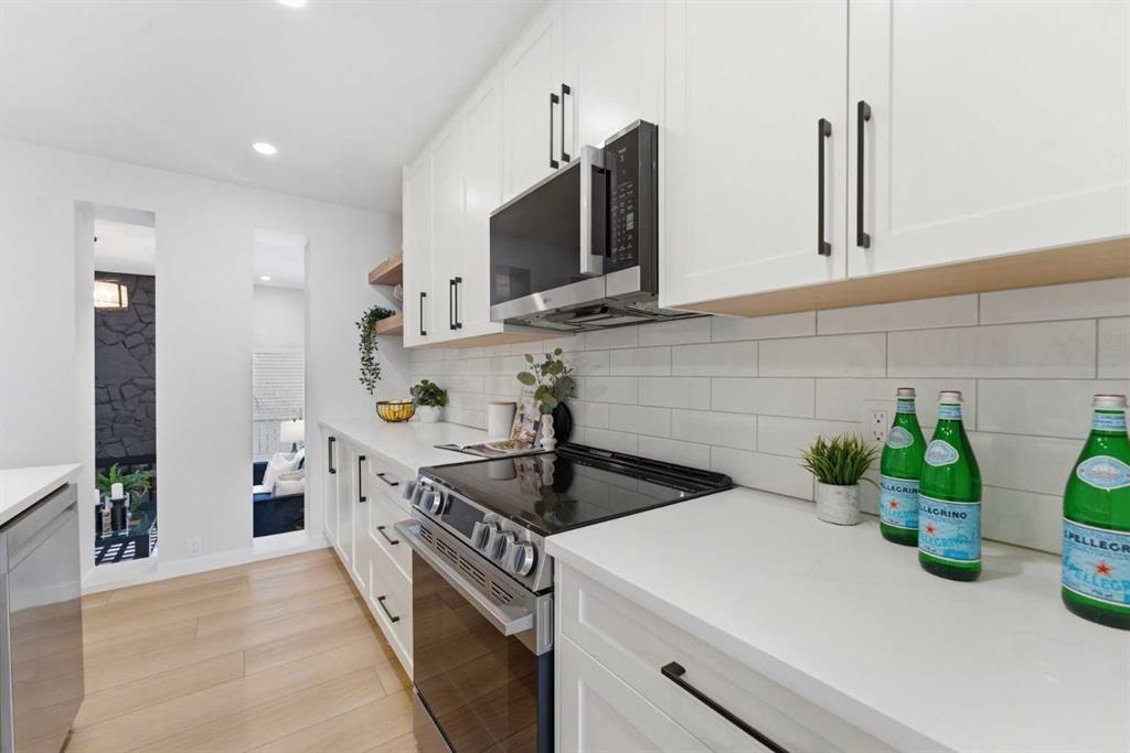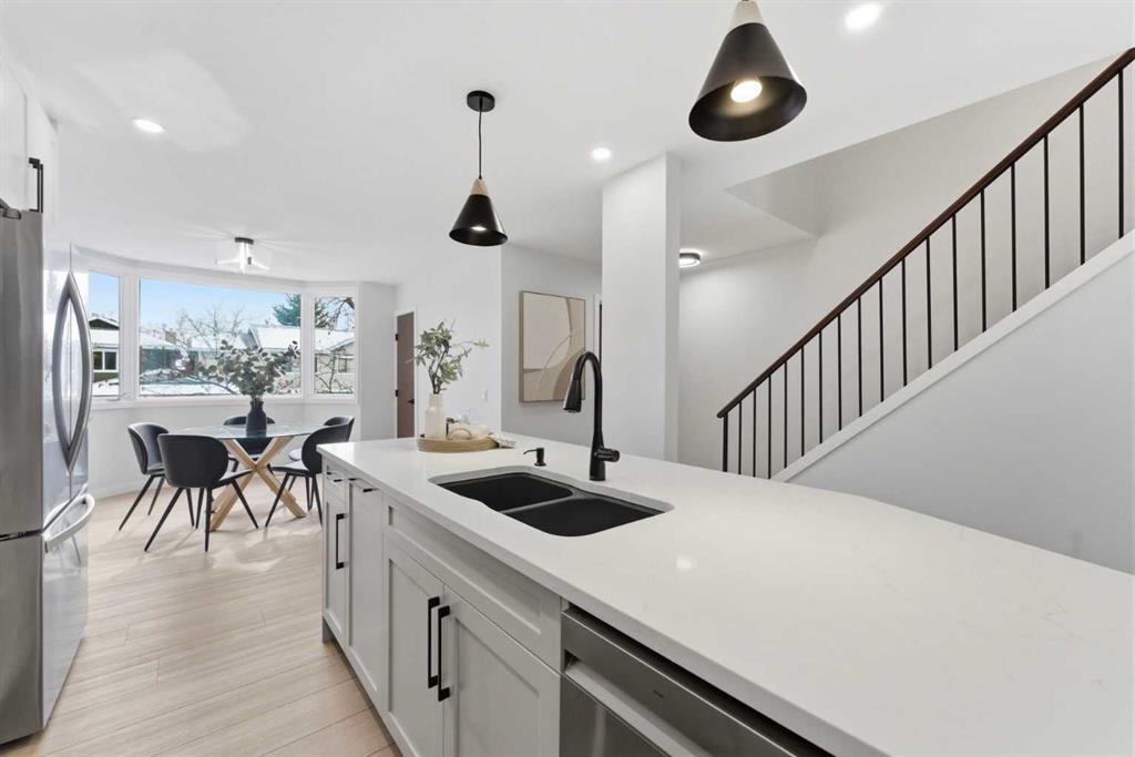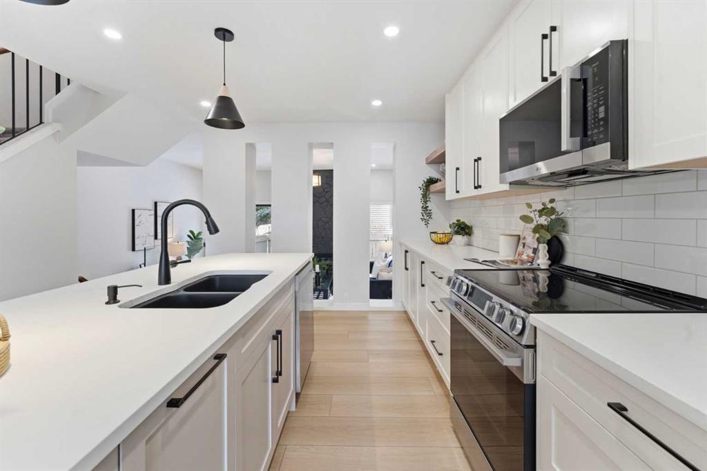 Infill luxury in a modern townhouse! Fully renovated and reimagined, this home stands out the moment you walk in. The main living space is elevated with vaulted ceilings, oversized windows, and a bold floor-to-ceiling stone fireplace that anchors the entire room. The expansive kitchen is bright, open and completely different from every other unit in this complex. It also has a full size island, a perfect gathering spot for guests & entertaining. The kitchen design features a modern look with two-toned organic colouring cabinetry, quartz countertops, new stainless steel appliances, tons of storage, and coffee nook with floating accent shelves. Flowing effortlessly into the dining area, it's gives enough space for a 6-8 person table and is surrounded by windows and natural light. Upstairs offers 3 well-sized bedrooms, including a spacious master bedroom and large walk in closet with custom built-ins. The laundry has also been moved from the basement to the second level for added convenience. The bathrooms have also been updated with modern vanities, tiled bathtub, and custom cabinetry. The basement provides extra space for you to use your imagination with, workout space, rec room, lots of potential! The backyard is fully fenced, private, and usable. It’s the kind of space you’ll actually use: morning coffee, letting the dog out, and enjoying the summer evenings. An attached garage, quiet complex, and a location that puts you close to everything without feeling busy. Fully renovated, luxury townhouse living in this desirable lake community—this one hits different!