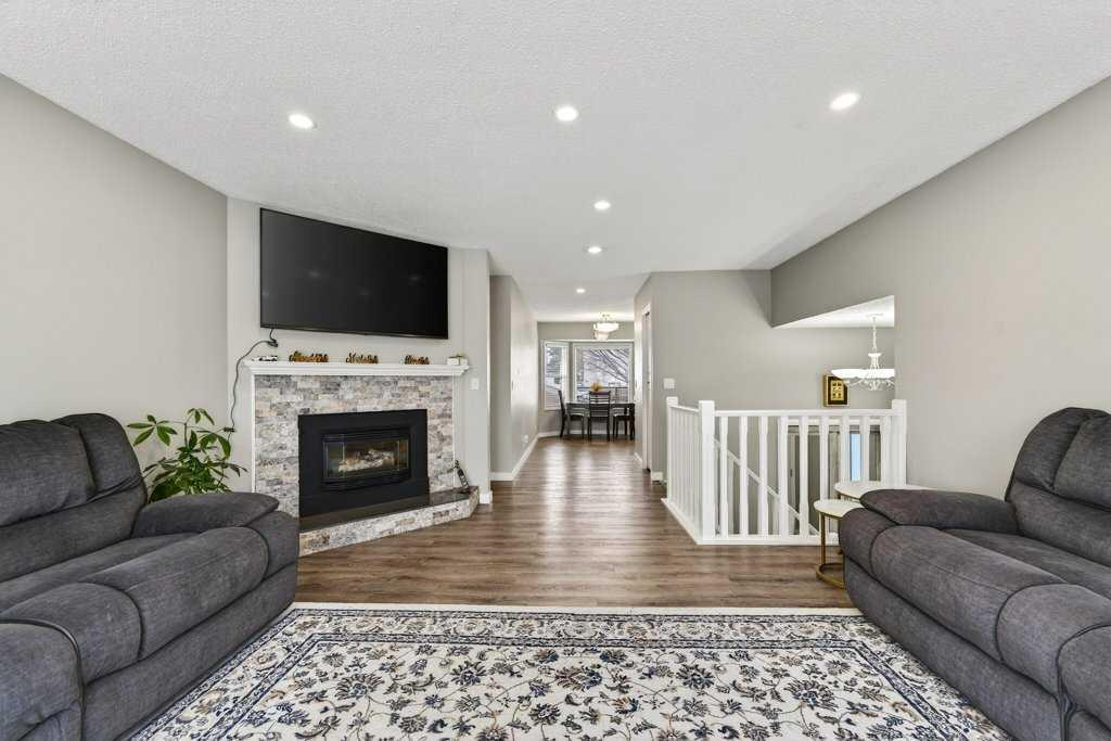 Poured concrete stairs lead you up to the front entrance, setting the tone before you even step inside. From the moment you walk in, the care and attention to detail are immediately clear. The main level is filled with natural light and opens into a warm, inviting living room anchored by a gas fireplace with a beautifully finished stone surround. From there, the space flows into a standout kitchen finished with custom cabinetry, quartz countertops, and stainless steel appliances. Luxury vinyl plank flooring runs throughout the main level and stairs, creating a seamless, modern finish, while newly installed pot lights brighten the entire upper floor.