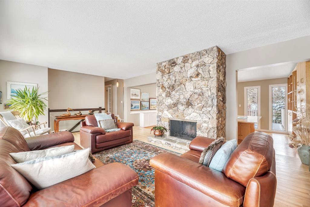 Upstairs features three bedrooms, including a spacious primary retreat with a walk-in closet and a beautifully updated ensuite complete with a steam shower. Positioned between the bedrooms is an additional sitting area that overlooks the lower sunroom, adding yet another bright and inviting space within the home. Two large bonus rooms on this level each open to their own expansive patio. One captures breathtaking ridge views over Fish Creek Park and features a wood-burning fireplace, an incredible place to unwind and take in the setting. The second overlooks the beautifully landscaped backyard, offering a more private and equally inviting outdoor retreat.