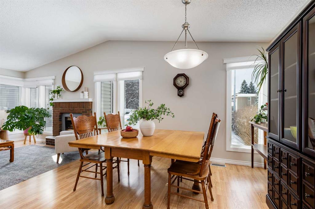 Inside, the home offers a functional and inviting four-level split layout with space for the whole family. The main floor welcomes you with vaulted ceilings and a bright, open-concept living and dining area, filled with natural light from large south-facing windows and anchored by a charming fireplace. The kitchen is both practical and welcoming, featuring a large skylight, ample cabinetry, and a cozy eat-in area perfect for morning coffee or casual meals.