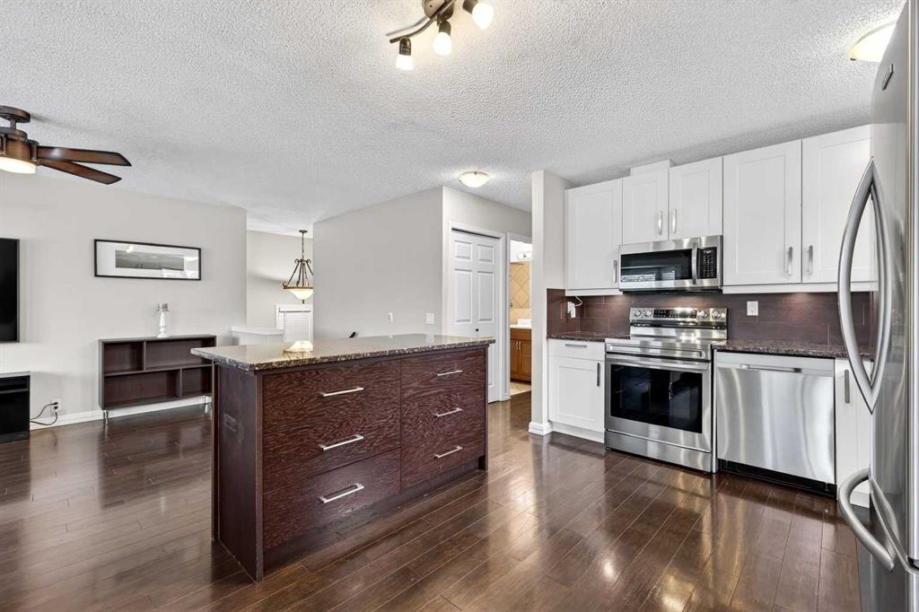 The main level features a bright open-concept layout finished in light contemporary colours and complemented by hardwood flooring throughout. The spacious kitchen offers ample white cabinetry, granite-topped island, counters and stainless steel appliances, opening onto a dining area surrounded by large windows that fill the space with natural light. The adjoining living room, complete with two white leather couches, creates a comfortable and inviting setting for everyday living. Three generously sized bedrooms complete this level, including a primary suite with a walk-in closet and a four-piece ensuite, along with an additional full bathroom.