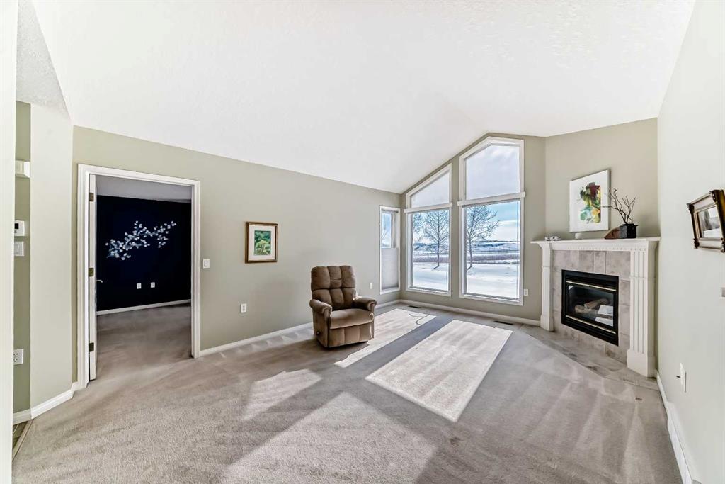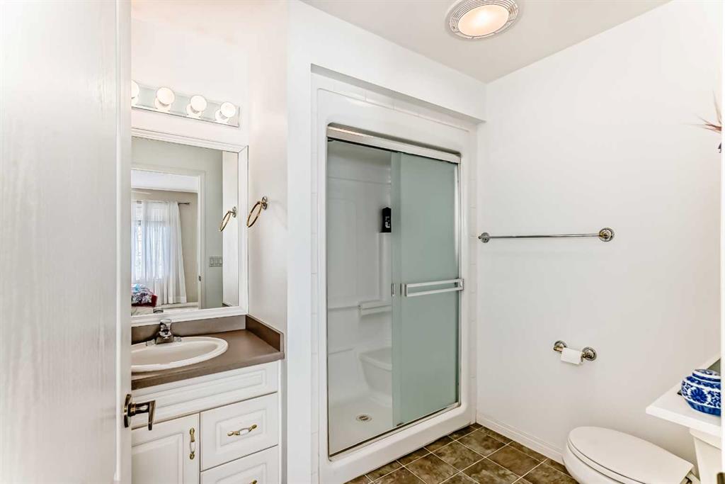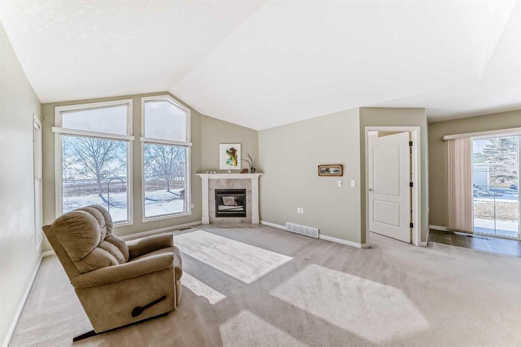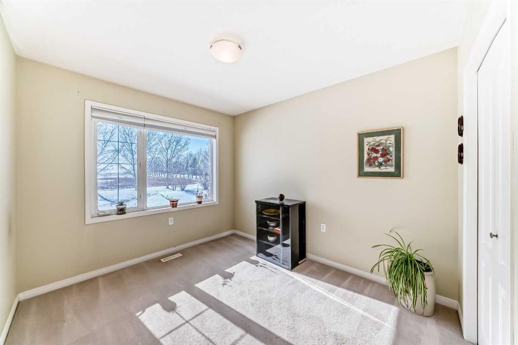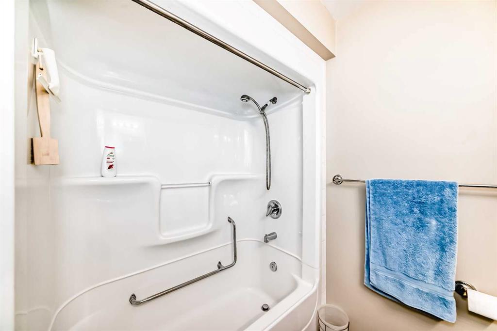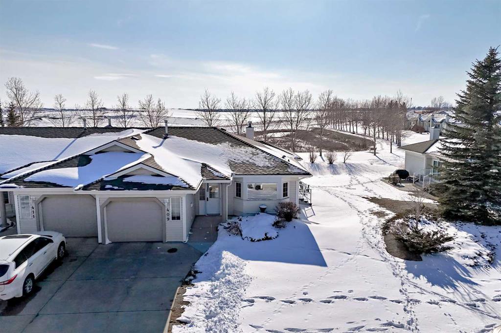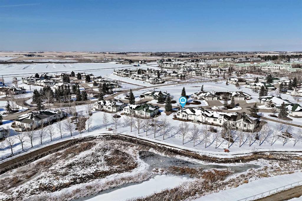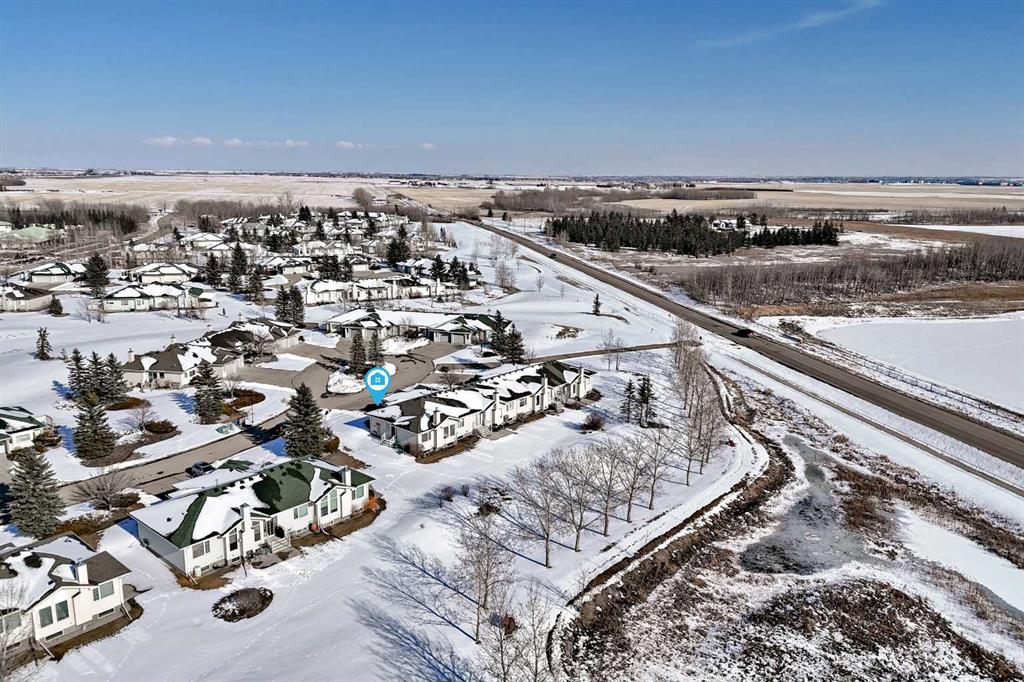 Welcome to quiet living in Prince of Peace Village. Country living beside the Calgary city limits. A 55+ adult complex with 175 bungalow villas, some times referred to as Calgary's Oasis. Close to shopping, restaurants and medical facilities etc. This bright 1168 sq.ft bungalow has 2 bedrooms, 2 full bathrooms, a spacious kitchen with plenty of cupboard space and built-ins, a bright dining room, a large living room with a gas fireplace, a laundry room, all on the main floor. A full basement, partially completed and RI plumbing for a full bathroom and a 3rd bedroom. The furnace, hot water tank and sump pump are all covered in the condo fees for repair and/or replacement. A single front drive garage has a long driveway for guest or additional parking. The location of this unit is unique in that it backs onto a natural pond and the entire village has miles of walking paths with resting benches along the way. This unit is easy to show and is available for quick possession
