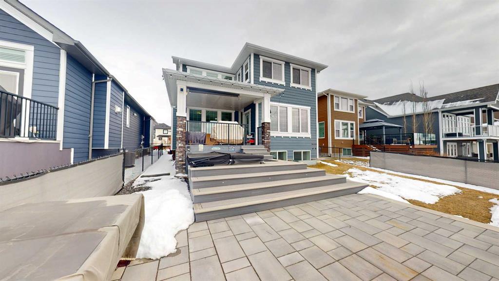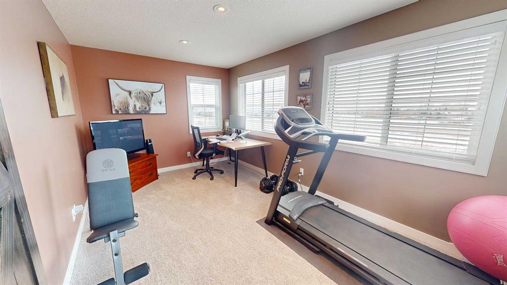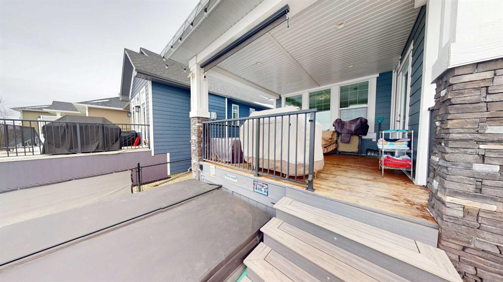 The main floor blends elegance and function with a full office (or a main floor bedroom), an additional flex room perfect for a music room, homework area or creative space, and a bright open-concept living area finished with beautiful hardwood flooring and a striking gas fireplace. The kitchen is designed to impress, with ceiling-height custom cabinetry, built-in appliances, a massive granite island, cooktop with hood fan, filtered water and even an ice machine for added convenience. A large walk-through pantry and dedicated laundry room with its own sink make everyday living effortless. Natural light pours through the many triple-pane windows, highlighting the 9-foot ceilings and creating bright, open sightlines throughout the home. The lower level is equally impressive, offering a gym space, a spacious rec room, an additional bedroom, and a full bathroom for guests or extended family. Outside, enjoy a beautifully landscaped west-facing backyard complete with a fully fenced yard, concrete pathway, custom stonework patio and maintenance free deck. The deck has a built in hot tub that is included and is the perfect place to relax and take in the views. Finished with durable Hardie board siding, two A/C units, Gemstone lights and an oversized Heated double garage with two single doors and extra storage space, this home delivers the perfect balance of luxury, comfort, and practicality.