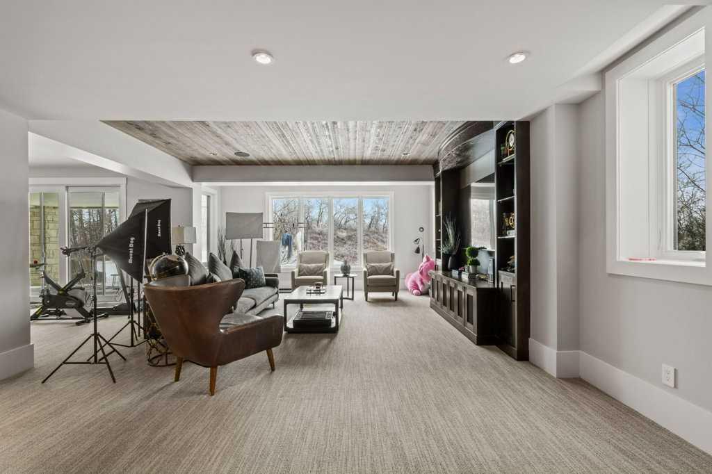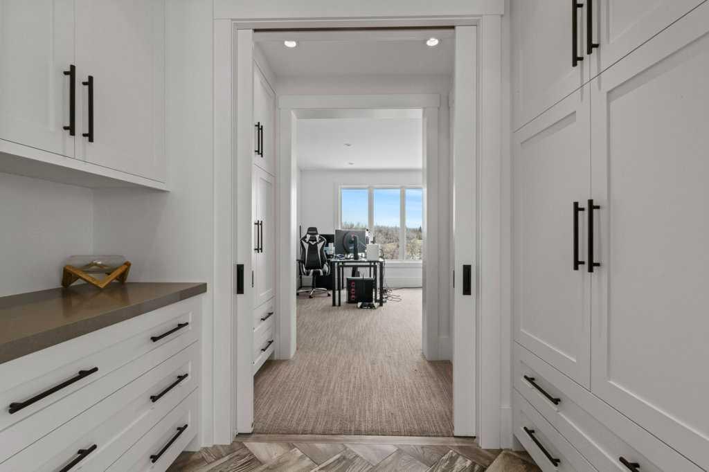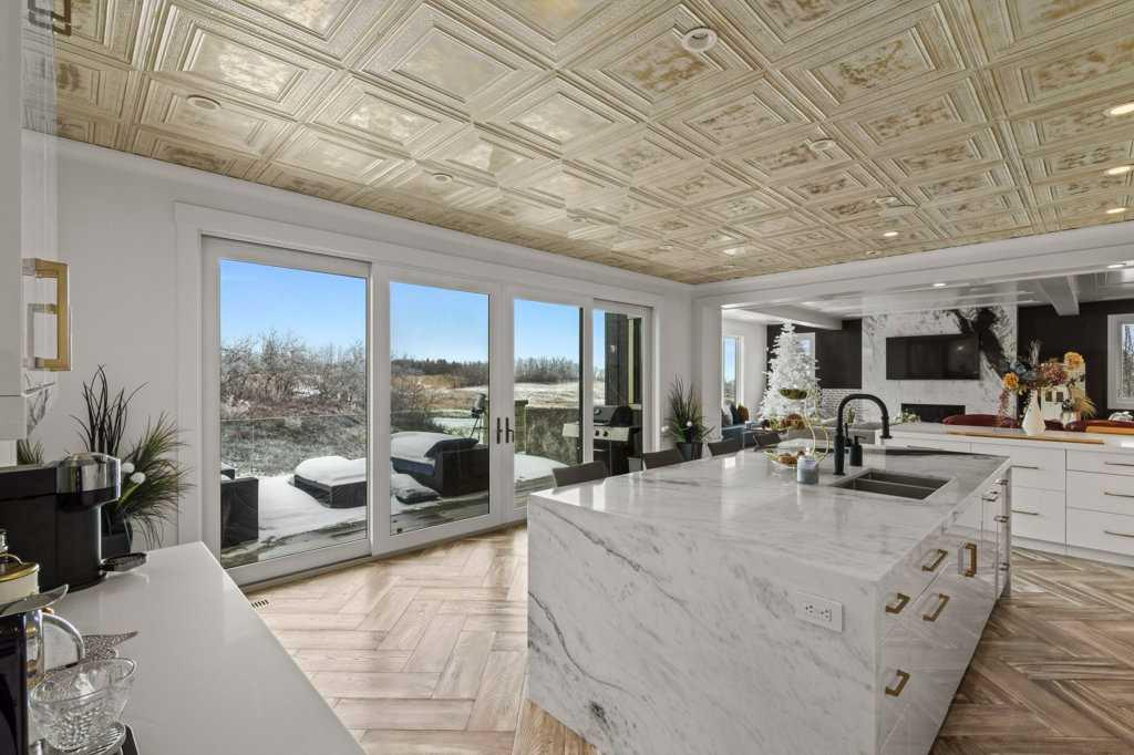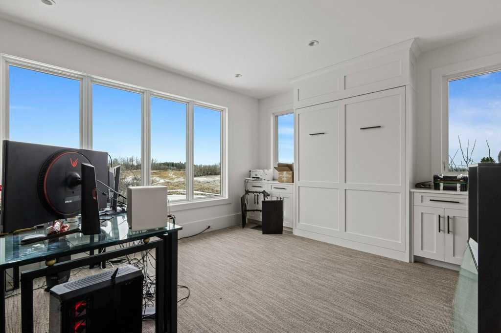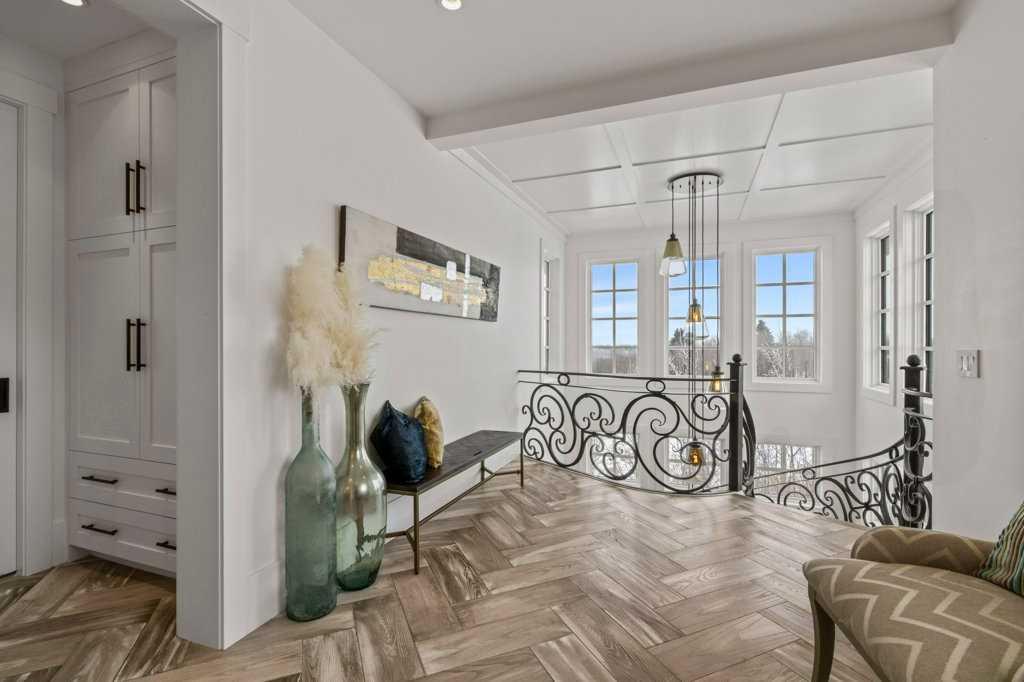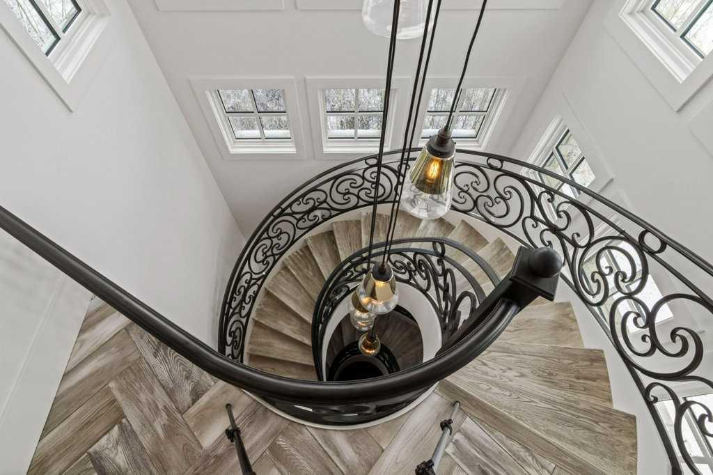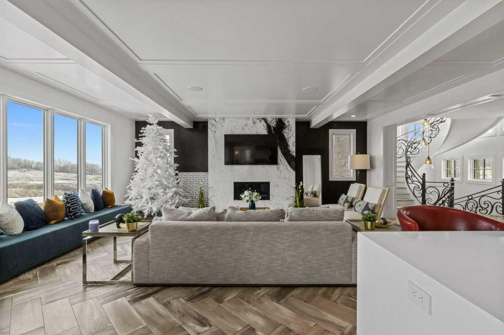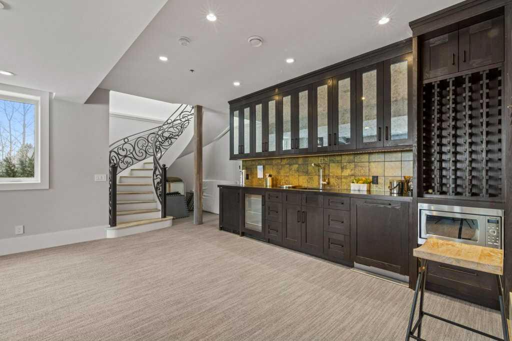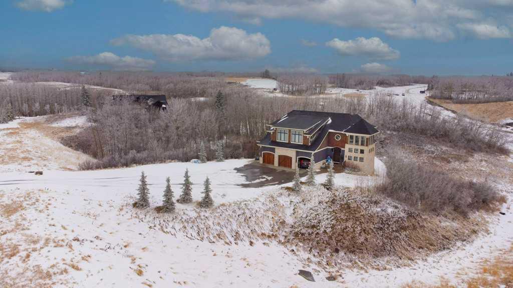 Welcome to The Vale, an architectural masterpiece by the renowned McKinley Masters. This one-owner, former show home represents a pinnacle of elegance, privacy, and superior craftsmanship. Situated within the prestigious Silverhorn community, the estate offers a perfect harmony of high-tech modern amenities and the tranquil beauty of Bearspaw’s rolling hills. From the moment you approach the elegant board-and-batten exterior—highlighted by full-bed sandstone, triple-glazed windows, and cedar garage doors—it is clear that every detail has been meticulously curated for the discerning homeowner. The grand entrance sets a tone of opulence, featuring a handcrafted front door with a forged iron canopy that opens into a foyer graced by a custom solid oak armoire. You are immediately captivated by the home's crown jewel: an award-winning circular staircase with bespoke iron railings. The main floor flows effortlessly through an open-concept layout, where custom herringbone wood floors lead you to a Great Room anchored by a marble feature wall and a built-in gas fireplace. Large windows throughout the level ensure that the breathtaking views of the surrounding treed areas and hills are always the centerpiece of your living space. For the culinary enthusiast, the kitchen is a dream come true. It artfully blends traditional and modern finishes, featuring an oversized marble waterfall island and a secondary prep station that subtly defines the space. ?This kitchen is designed for both high-end catering and intimate family breakfasts. The adjacent formal dining room provides a sophisticated atmosphere for hosting, while the nearby powder room exudes warmth with its custom floating vanity and wood-paneled walls. The upper level is a sanctuary of comfort, characterized by barrel ceilings, accent lighting, and custom iron chandeliers. The master retreat is a true "spa-at-home" experience, featuring floor-to-ceiling windows, a cozy sitting area, and a pop-up TV. The ensuite melts away the stress of the day with heated floors and a cedar-clad walk-in closet. This level also includes ?t?hree additional ?bedrooms? with walk in closets and a family sized laundry room. Steps away the oversized main bathroom is a standout feature in itself, boasting double floating vanities and an impressive private custom shower area. The walk-out basement is a bright and cheerful entertainment hub, complete with a custom bar? and a media area with barn board detailing. Even the functional spaces of this home are extraordinary; the mechanical room is a masterpiece of engineering, connected by a private staircase to an oversized garage. This garage is unlike any other, featuring epoxy-coated heated floors, ample built-in cabinetry, and designer accents. Life in Silverhorn offers a unique blend of nature and technology. With 50% of the surrounding landscape protected, you can enjoy the serenity of untouched beauty just minutes from Calgary.
