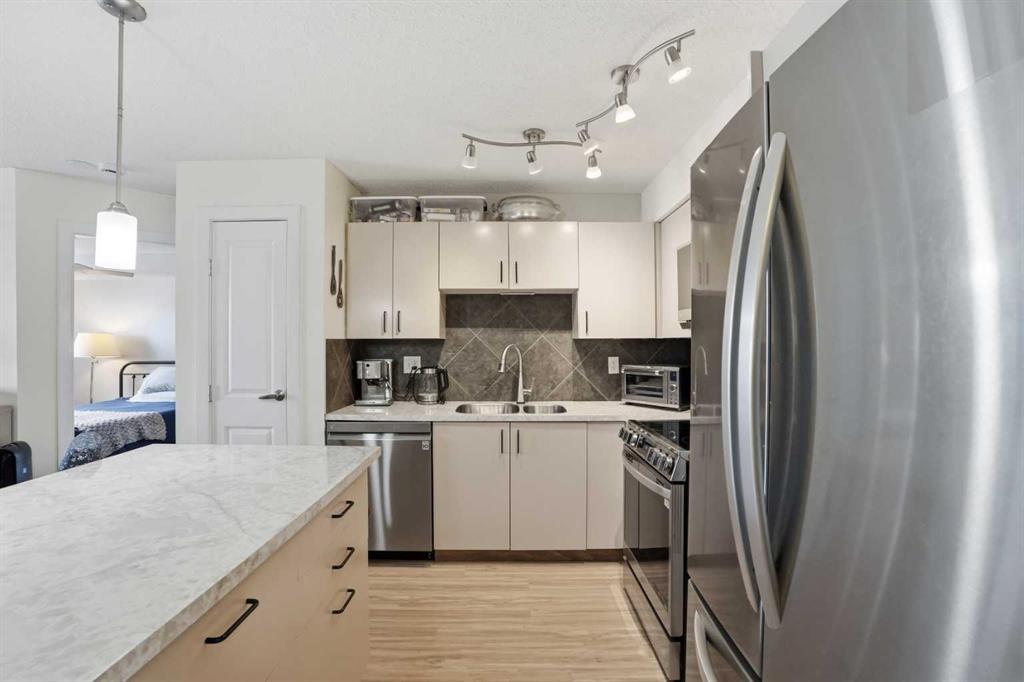 Additional highlights include recently updated luxury vinyl plank (LVP) flooring throughout, in-suite laundry with extra storage, and window coverings. Stay comfortable year-round with the included A/C unit, a valuable feature for warm summer months. Enjoy your private balcony with gas BBQ hookup, perfect for relaxing or entertaining.