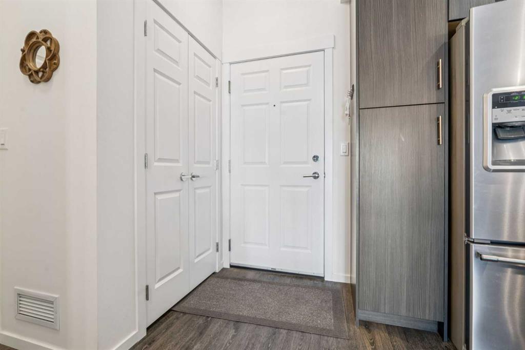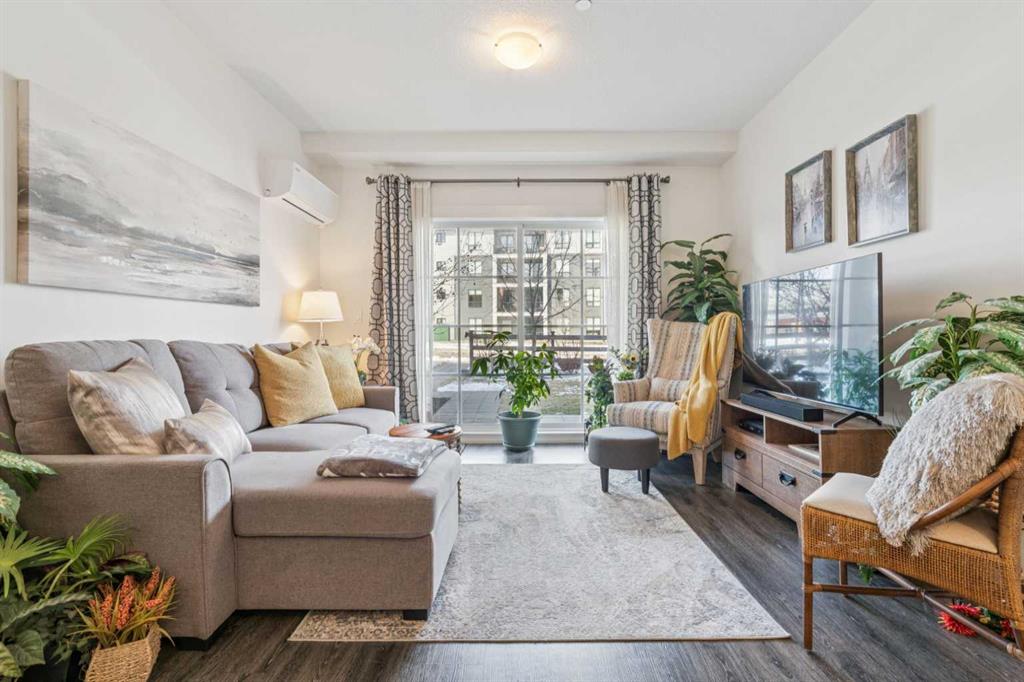 An absolutely gorgeous, move-in ready ground-floor apartment with two bedrooms and two connected bathrooms! This is a perfect set up for a first-time home buyer, including someone who would like a roommate, or a family that is looking for easy access to take a dog for a walk. The layout and location work for most situations! You will absolutely love the footprint of this home, including the ISLAND KITCHEN, which offers plenty of QUARTZ COUNTER TOPS, A HUGE EXTRA PANTRY for storage, and UPGRADED STAINLESS STEEL APPLIANCES including a fridge with water and ice dispenser and a ceramic top-stove. Plus there's UPGRADED KITCHEN BACK SPLASH as well as TWO-TONED KITCHEN CABINETRY! Other features of this AMAZING HOME include 9-FOOT CEILINGS, AIR CONDITIONING, VINYL PLANK FLOORING in the kitchen and living room, UPGRADED LIGHTING, MORE QUARTZ COUNTERS IN BOTH BATHROOMS, and DOUBLE SINKS IN THE PRIMARY BATHROOM. You'll also enjoy a ceiling fan with a remote control, a kitchen breakfast bar, in suite laundry, titled underground parking, an assigned storage locker and a spacious west-facing patio that faces out to a beautifully maintained lawn and mature trees -giving you the feeling of even more space. All utilities, except electricity, are covered in the condo fees, and the current tenant says her electric bill runs about $100.00 a month. This unit is extremely clean and well maintained. Possession is available anytime starting in May. An absolute pleasure to show-Just move in and enjoy!