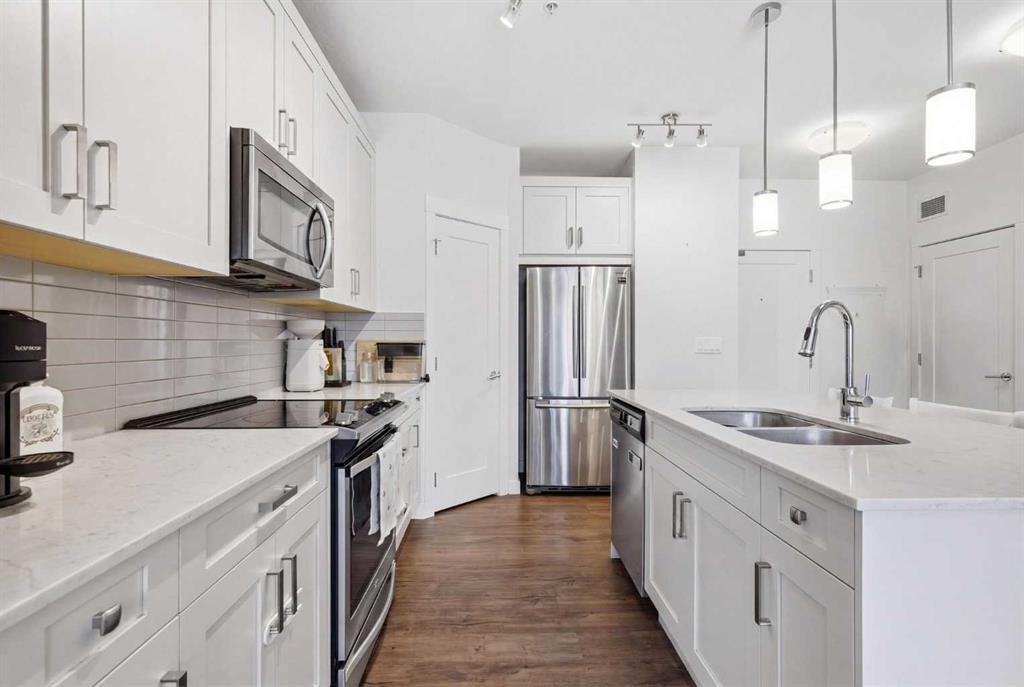 2 BEDROOMS | 2 BATHROOMS | MAIN FLOOR UNIT | 759 SQFT | TITLED UNDERGROUND PARKING | LARGE PATIO | AIR CONDITIONING | Welcome to this beautifully maintained main floor unit in the desirable community of Walden, offering 759 sqft of thoughtfully designed living space with 2 bedrooms and 2 full bathrooms. This bright and modern condo is perfect for first-time buyers, investors, or anyone looking for low-maintenance living in a prime location. Step inside to a spacious open-concept layout featuring 9-foot ceilings and luxury vinyl plank flooring throughout the main living areas. The chef-inspired kitchen is the heart of the home, complete with quartz countertops, soft-close cabinetry, a stylish tile backsplash, a large island with seating, and a pantry, perfect for both everyday living and entertaining. The kitchen flows seamlessly into the living areas creating a warm and inviting space. The primary bedroom offers a comfortable retreat with a walk-in closet featuring closet organizers and a 4-piece ensuite with dual vanities and an oversized shower. A second bedroom provides flexibility for guests, a roommate, or a home office and is complemented by an additional 4-piece bathroom. One of the standout features of this home is the large patio with BBQ gas line, offering plenty of space to relax and enjoy the outdoors, along with convenient street access just steps away. Additional highlights include in-suite laundry, air conditioning, and ample storage throughout. This unit also includes a titled underground parking stall and a storage locker, adding both convenience and value. Located within walking distance to shopping, restaurants, pubs, parks, and pathways, and with easy access to major routes and transit, this home offers the perfect balance of lifestyle and convenience. Perfect as your first home or for a growing investment portfolio, this move-in ready condo is a fantastic opportunity. Book your showing today!