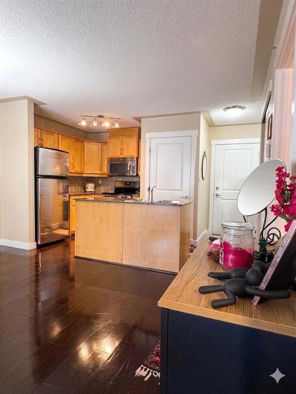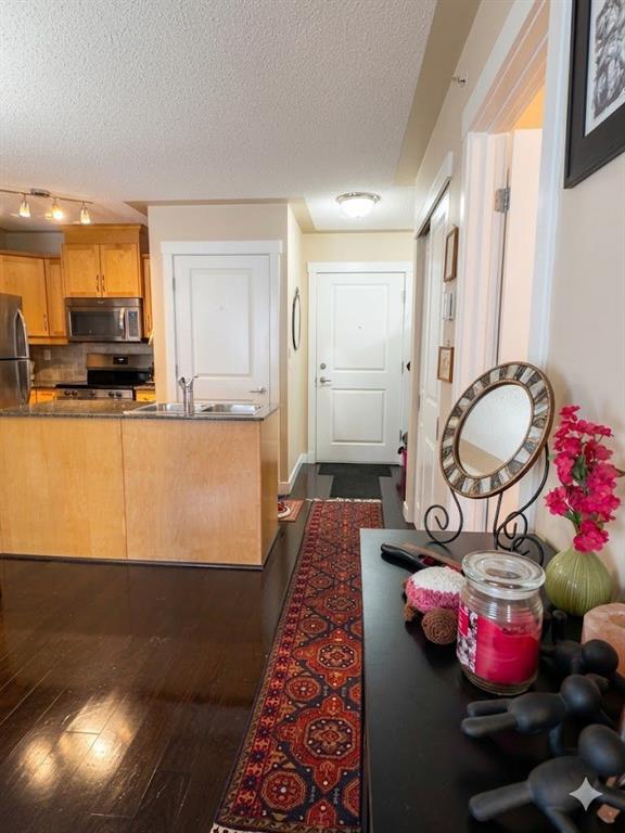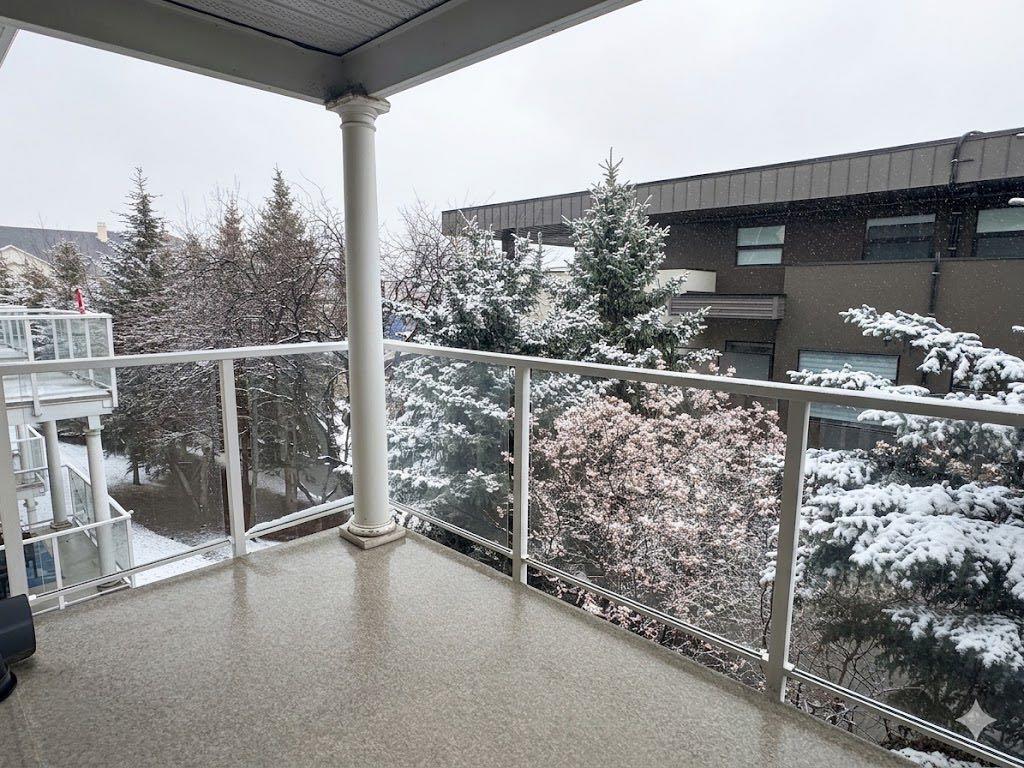 Welcome to the Gateway Garrison Woods in the highly sought-after community of Marda Loop. Discover this well-cared-for 3rd floor condo featuring hardwood flooring, a sunny east-facing balcony and a titled underground parking, Thoughtfully designed, the one-bedroom plus den layout offers a bright, functional space that is truly move-in ready. The kitchen is both stylish and practical, complete with generous cabinet space, granite countertops, and stainless-steel appliances, flowing effortlessly into the dining area. Natural light fills the living room, creating a warm and comfortable atmosphere, while patio doors lead to your private balcony—perfect for relaxing or grilling with the convenience of a built-in gas line. Near the entrance, a versatile flex space provides the ideal spot for a home office, reading nook, or additional storage. In-suite laundry adds everyday convenience. IDEALLY SITUATED IN A PREMIUM LOCATION within the building, this unit is just STEPS AWAY FROM THE ELEVATOR offering quick direct access to the underground parkade, all within a quiet low traffic setting. Enjoy the benefits of a well-managed, pet-friendly building (subject to condo approval) that includes underground visitor parking, secure bike storage, and a third-floor Owner's Lounge with an expansive outdoor balcony for your enjoyment. Condo fees are reasonable and cover all utilities, including gas, electricity, water, and sewer. Unbeatable walkability—enjoy cafes, dining, groceries, banking, and everyday essentials just steps from your door in this vibrant, trendy neighbourhood.