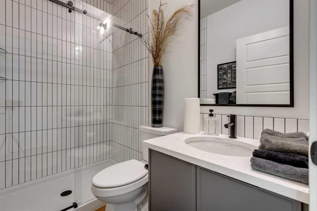Experience the benefits of living in a former show home, complete with premium upgrades, professional design touches, and a fully developed legal 1-bedroom basement suite—perfect for additional living space. The executive kitchen showcases a waterfall island, upgraded quartz throughout (including backsplash), black fixtures, pendant lighting, and a separate spice kitchen. The main floor features a bedroom and full bath, an eye-catching fireplace with wall detail, and a functional mudroom with built-in locker system. Upstairs offers 3 bedrooms, a vaulted bonus room, and an open-to-below great room, along with a luxurious primary bedroom boasting a tray ceiling, feature wall, and ensuite with tiled shower and bench. Additional highlights include paint grade iron spindle railing, upper laundry with quartz counter, finished basement stairs, air conditioning, a vinyl rear deck with BBQ gas line, exterior trim lighting, landscaping, and irrigation rough-in.