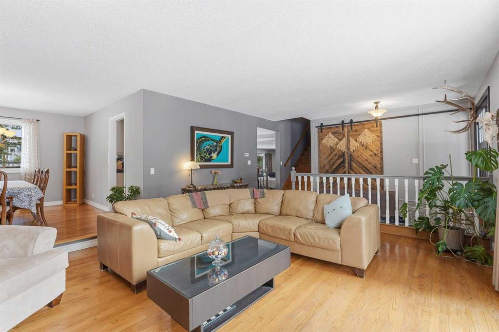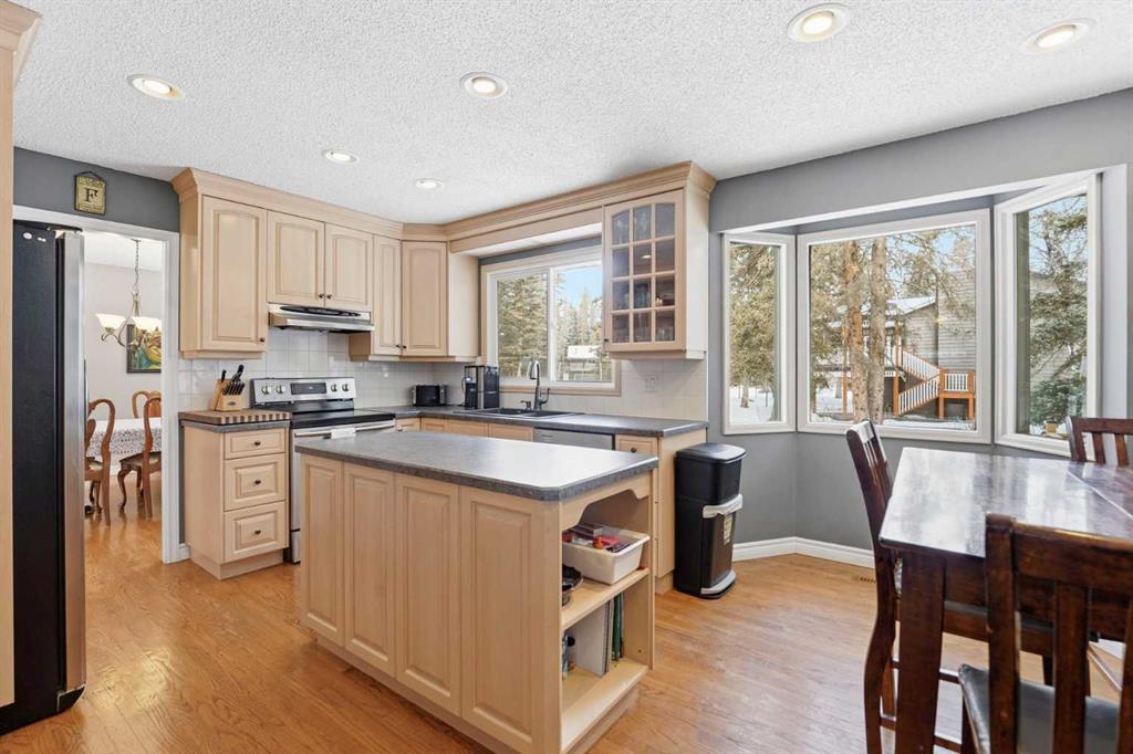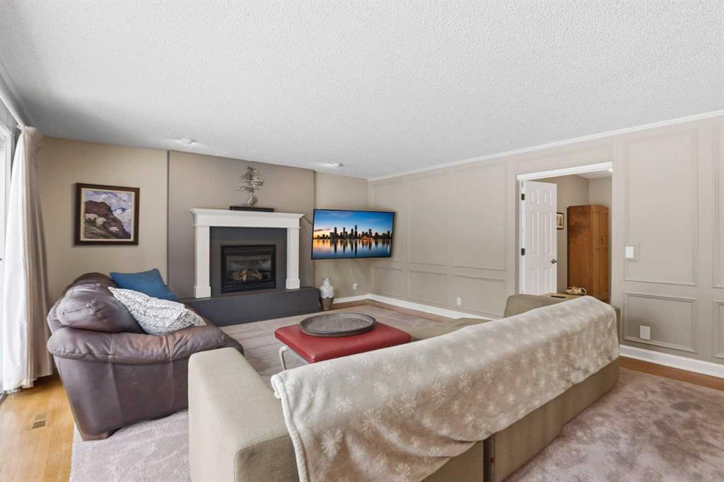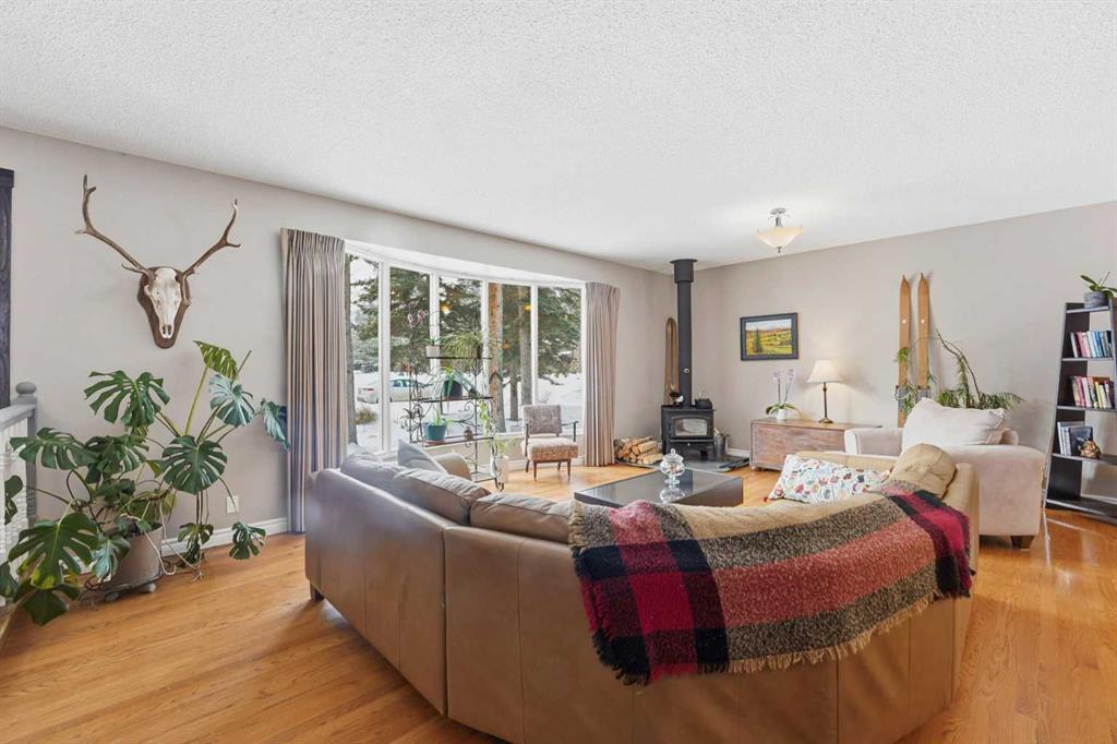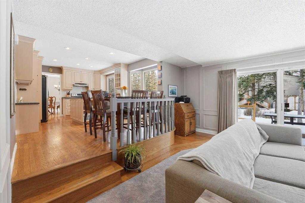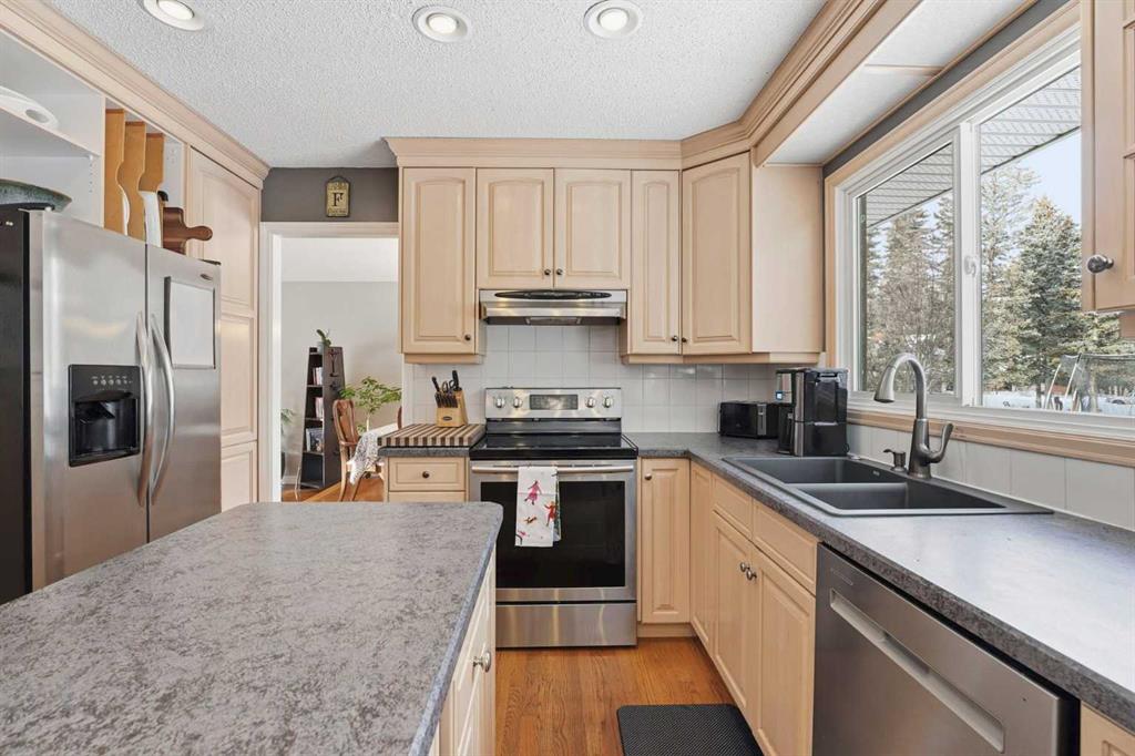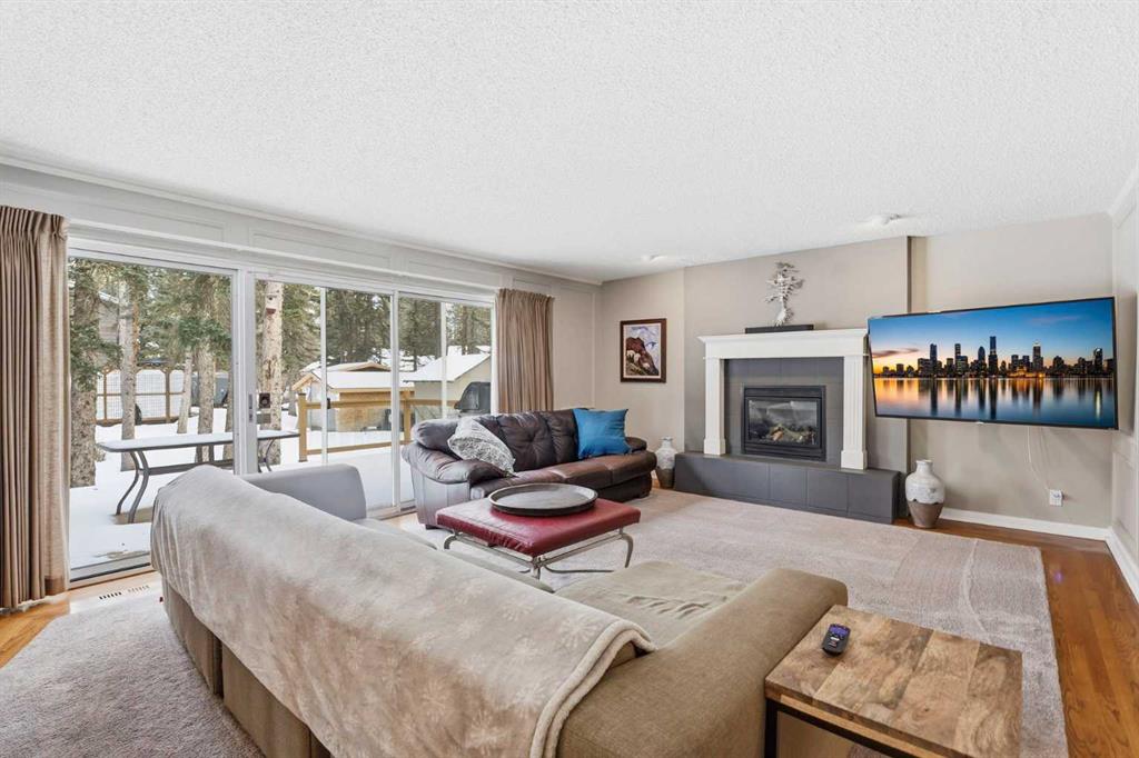 Inside, the home offers over 3,300 sq ft of developed living space with a layout that adapts easily to family life. The main floor is anchored by multiple gathering spaces, including a sunken great room with a gas fireplace and a separate living area with a wood burning fireplace, creating warm, comfortable spaces to unwind after a day outside. The kitchen and dining areas overlook the backyard, keeping you connected to the landscape year round.