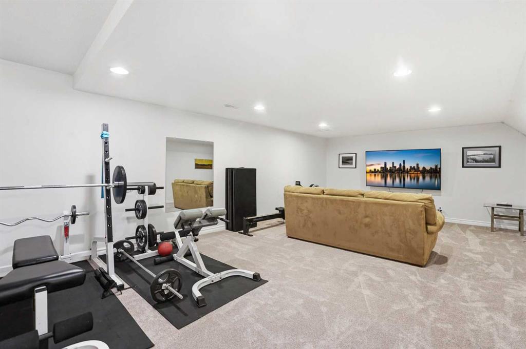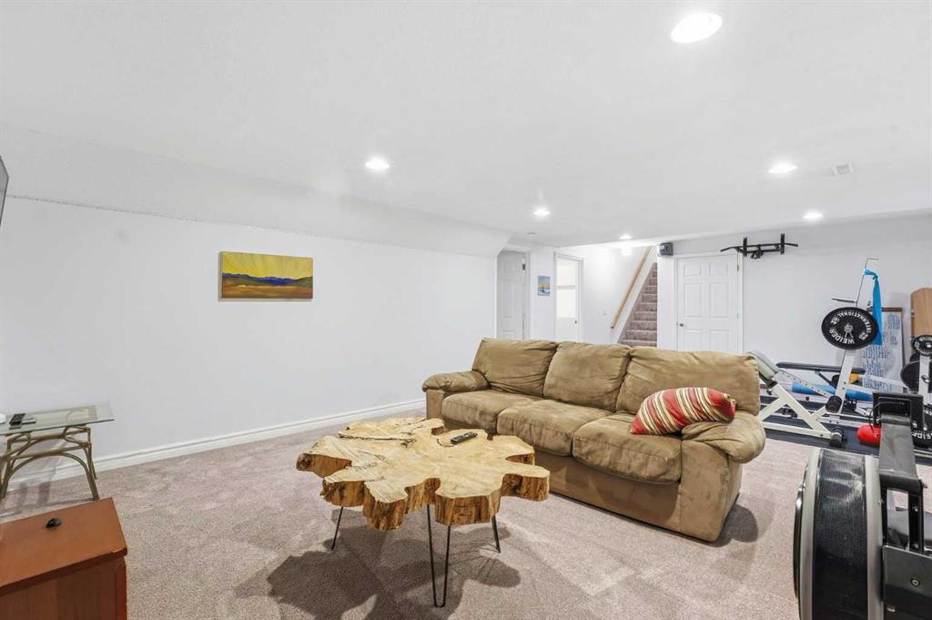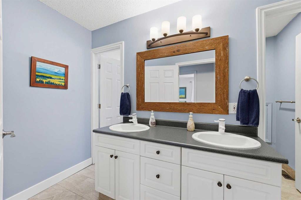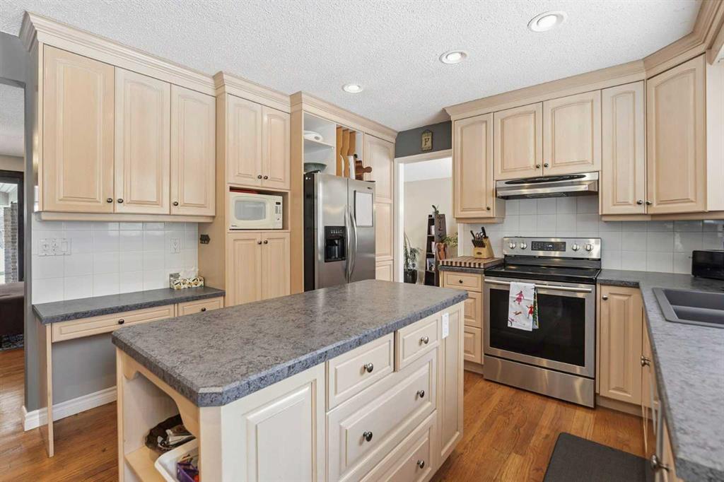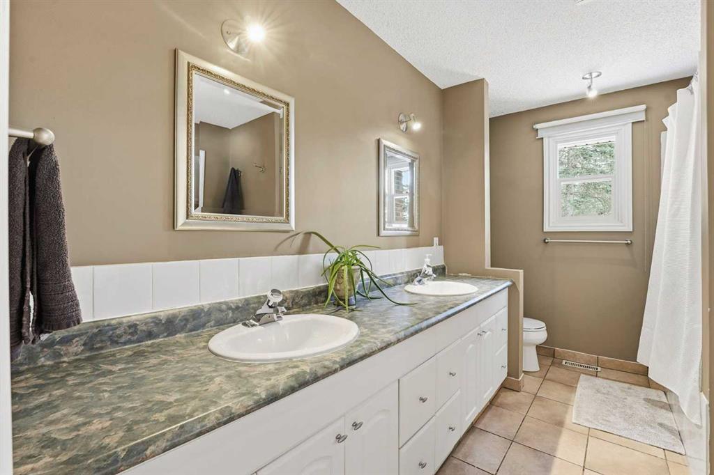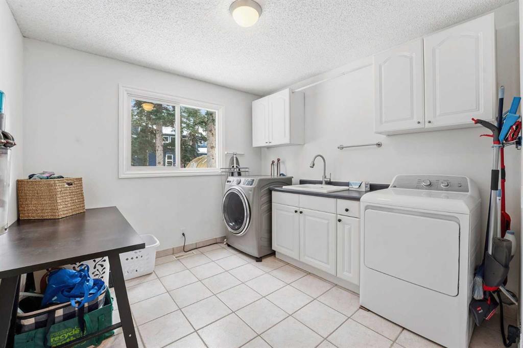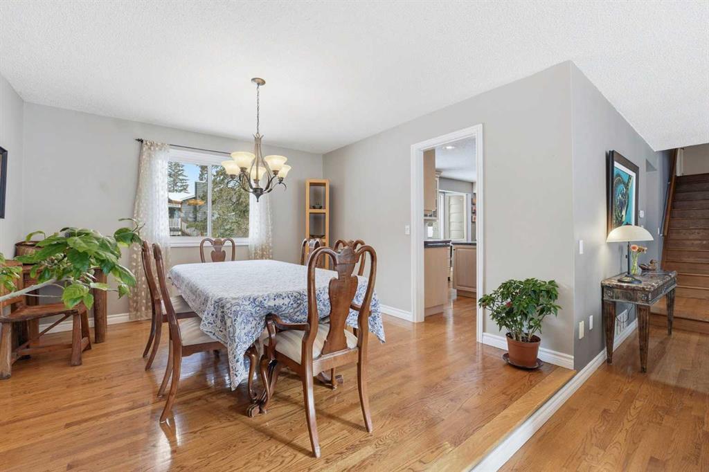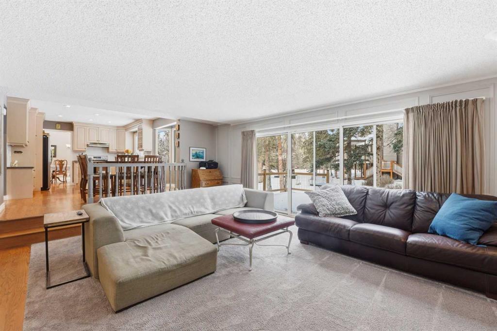 Inside, the home offers over 3,300 sq ft of developed living space with a layout that adapts easily to family life. The main floor is anchored by multiple gathering spaces, including a sunken great room with a gas fireplace and a separate living area with a wood burning fireplace, creating warm, comfortable spaces to unwind after a day outside. The kitchen and dining areas overlook the backyard, keeping you connected to the landscape year round.