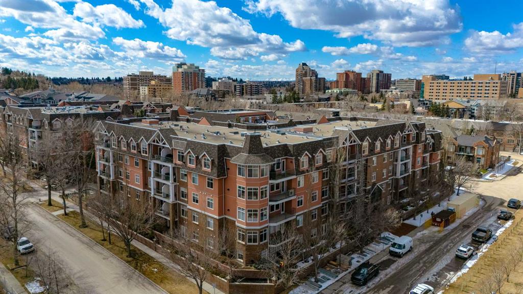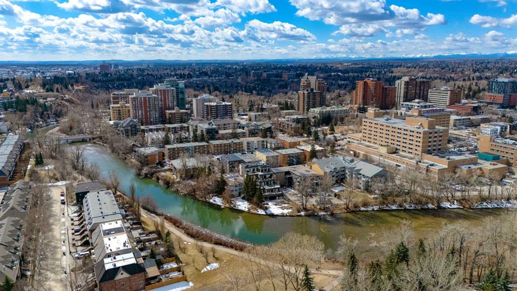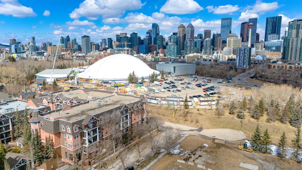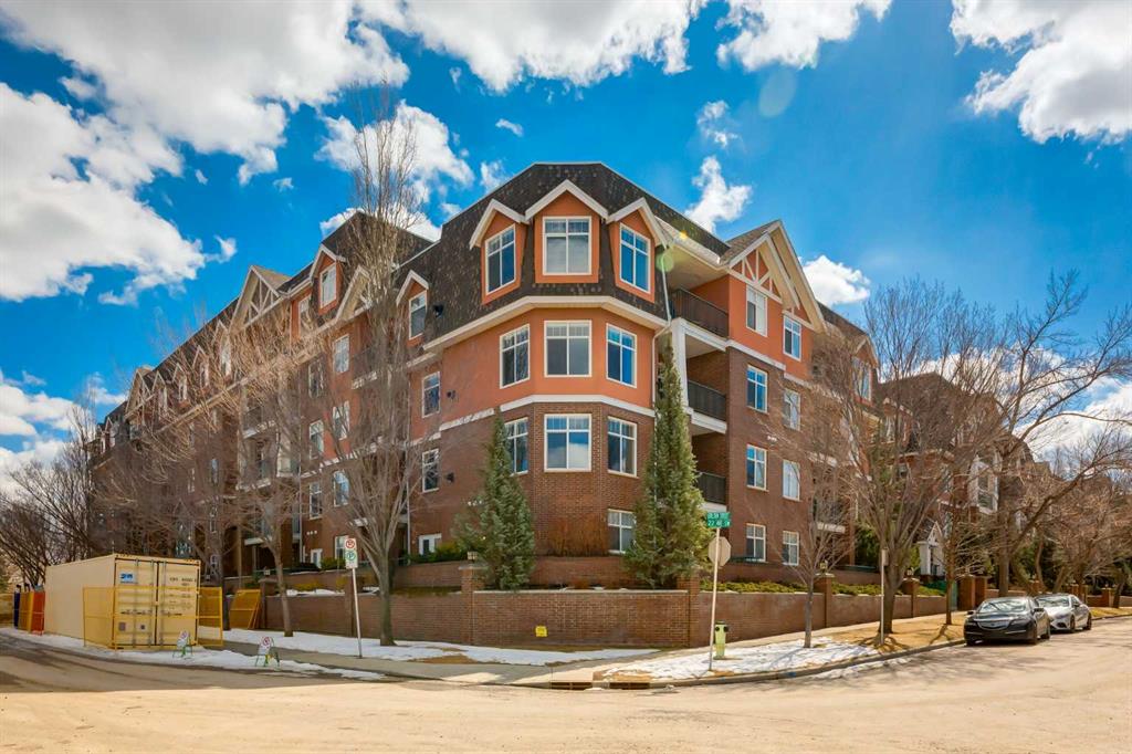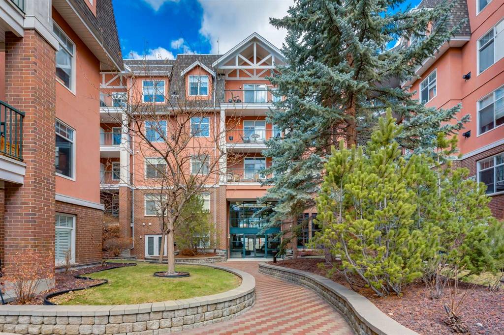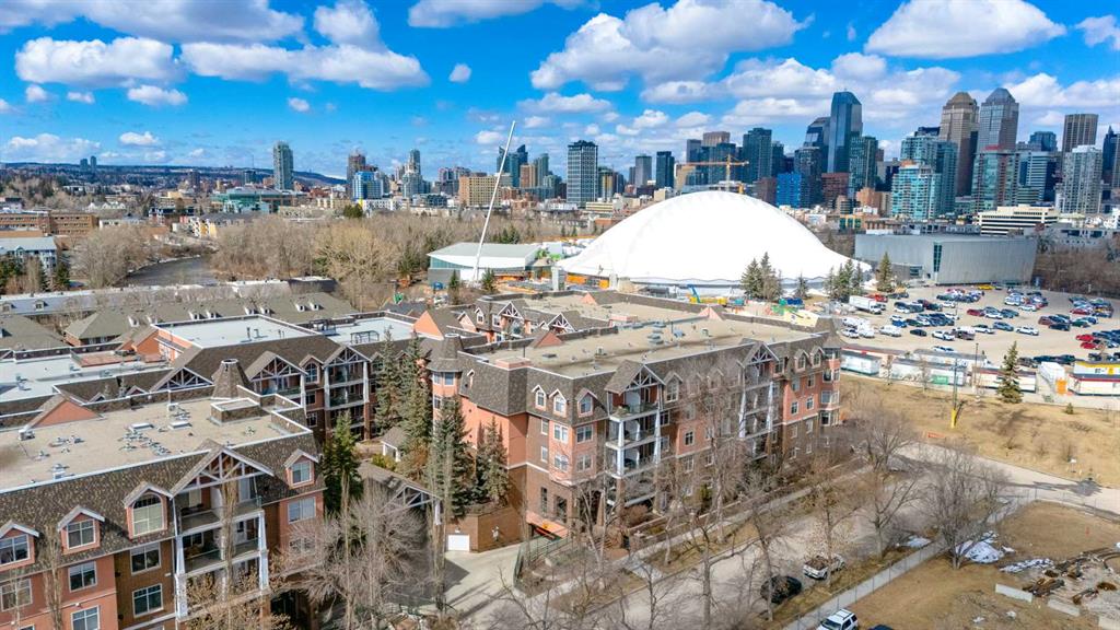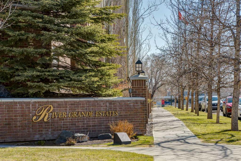 Welcome Home! Enjoy exceptional panoramic views of downtown Calgary from this stunning and stately third-floor condo, offering over 1,000 square feet of thoughtfully designed living space. Relax and unwind in the bright, open-concept living area featuring a cozy natural gas fireplace. Step outside to your private deck, which has a natural gas hookup perfect for year-round BBQing and entertaining. The well-appointed laundry room is conveniently located within the unit and includes a full-size washer, dryer and additional storage. The gourmet kitchen is designed for both function and style, showcasing stainless steel appliances, quartz countertops, and a two-tier breakfast bar. This home features two spacious bedrooms and two full bathrooms. The primary bedroom offers a private retreat with a walk-in closet and a luxurious ensuite complete with dual sinks, a separate shower and a full-size soaker Jacuzzi tub.The second bedroom includes a custom-built Murphy bed with an integrated desk which is ideal for guests, a home office or flexible living space. Additional upgrades include a built-in alarm and speaker system (8 speakers with dual volume controls), fresh paint in the bedrooms and living area (2026), a new washer (2025) and a new microwave (2026). The River Grande Estates complex is designed for comfortable living and is a community featuring a beautiful, peaceful courtyard, library, games and recreation room with a pool table, two underground car wash bays and indoor visitor parking. Parking is simple and secure with your titled, heated underground parking stall. This home also includes an assigned storage locker and bicycle storage is available for a small fee. Located in the highly desirable Erlton community, this amazing inner-city location offers parks, pathways and convenient access to downtown Calgary. You are within walking distance of the MNP Community & Sport Centre, featuring a pool, gym, and indoor track, as well as downtown, the Saddledome, Stampede Grounds, Calgary Tower and LRT access. Move-in ready. Call today to view your next home.