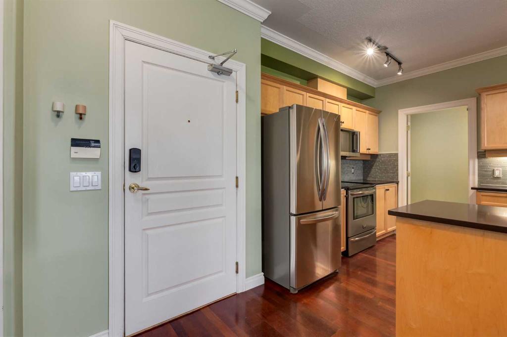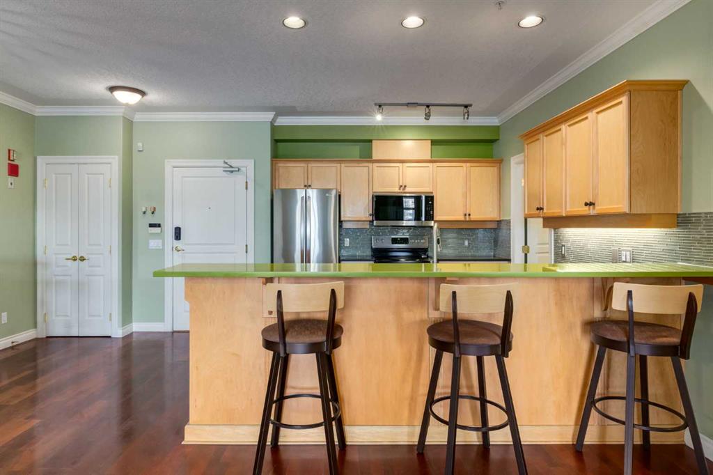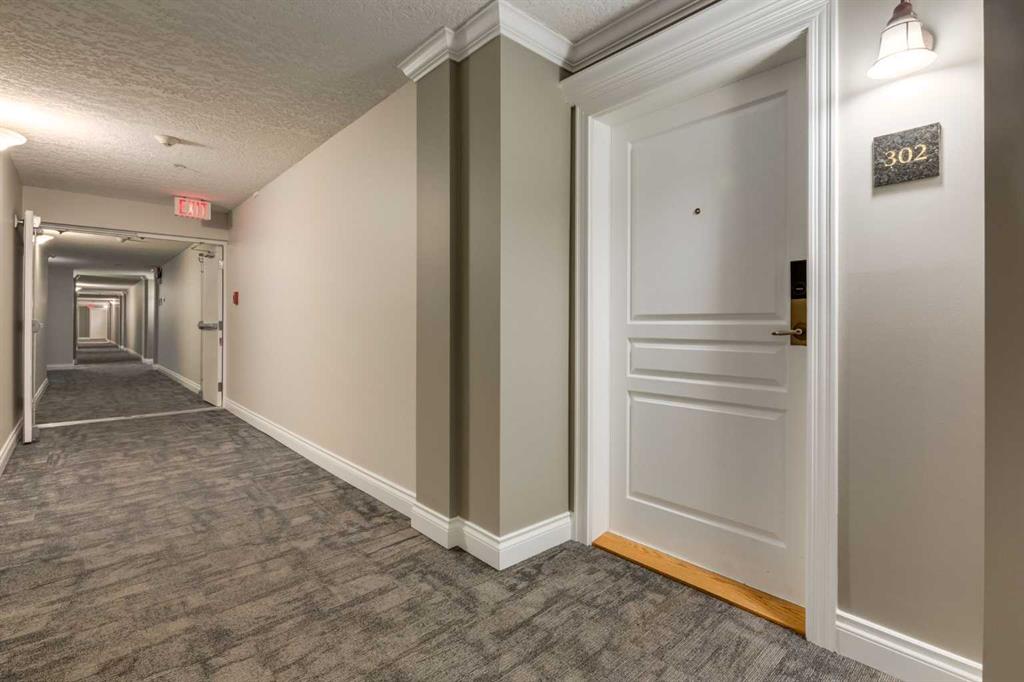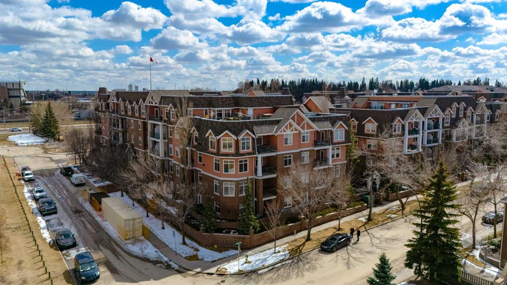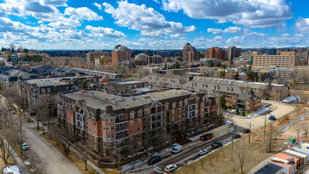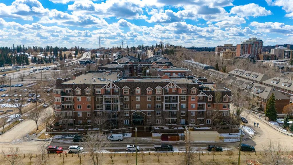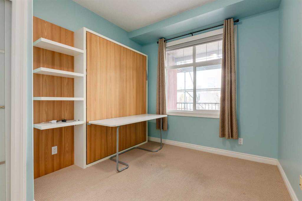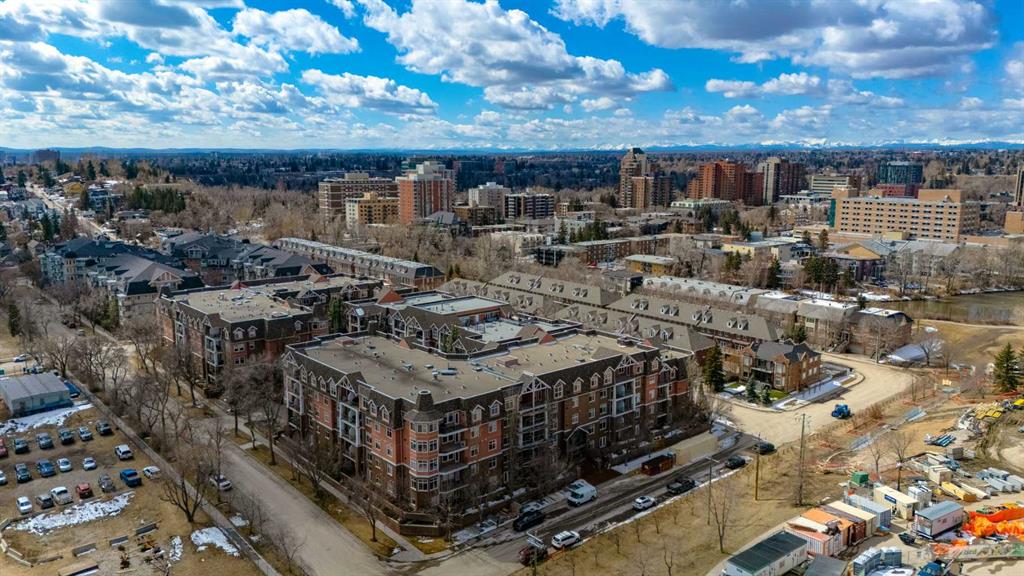 Welcome Home! Enjoy exceptional panoramic views of downtown Calgary from this stunning and stately third-floor condo, offering over 1,000 square feet of thoughtfully designed living space. Relax and unwind in the bright, open-concept living area featuring a cozy natural gas fireplace. Step outside to your private deck, which has a natural gas hookup perfect for year-round BBQing and entertaining. The well-appointed laundry room is conveniently located within the unit and includes a full-size washer, dryer and additional storage. The gourmet kitchen is designed for both function and style, showcasing stainless steel appliances, quartz countertops, and a two-tier breakfast bar. This home features two spacious bedrooms and two full bathrooms. The primary bedroom offers a private retreat with a walk-in closet and a luxurious ensuite complete with dual sinks, a separate shower and a full-size soaker Jacuzzi tub.The second bedroom includes a custom-built Murphy bed with an integrated desk which is ideal for guests, a home office or flexible living space. Additional upgrades include a built-in alarm and speaker system (8 speakers with dual volume controls), fresh paint in the bedrooms and living area (2026), a new washer (2025) and a new microwave (2026). The River Grande Estates complex is designed for comfortable living and is a community featuring a beautiful, peaceful courtyard, library, games and recreation room with a pool table, two underground car wash bays and indoor visitor parking. Parking is simple and secure with your titled, heated underground parking stall. This home also includes an assigned storage locker and bicycle storage is available for a small fee. Located in the highly desirable Erlton community, this amazing inner-city location offers parks, pathways and convenient access to downtown Calgary. You are within walking distance of the MNP Community & Sport Centre, featuring a pool, gym, and indoor track, as well as downtown, the Saddledome, Stampede Grounds, Calgary Tower and LRT access. Move-in ready. Call today to view your next home.