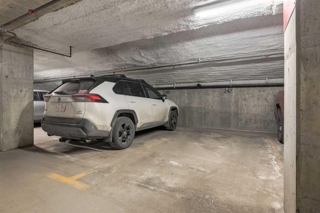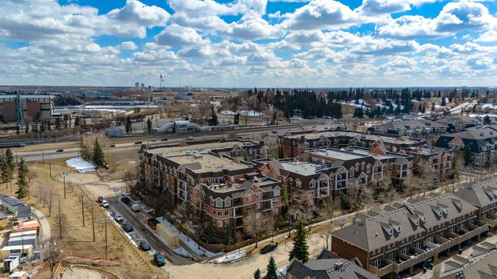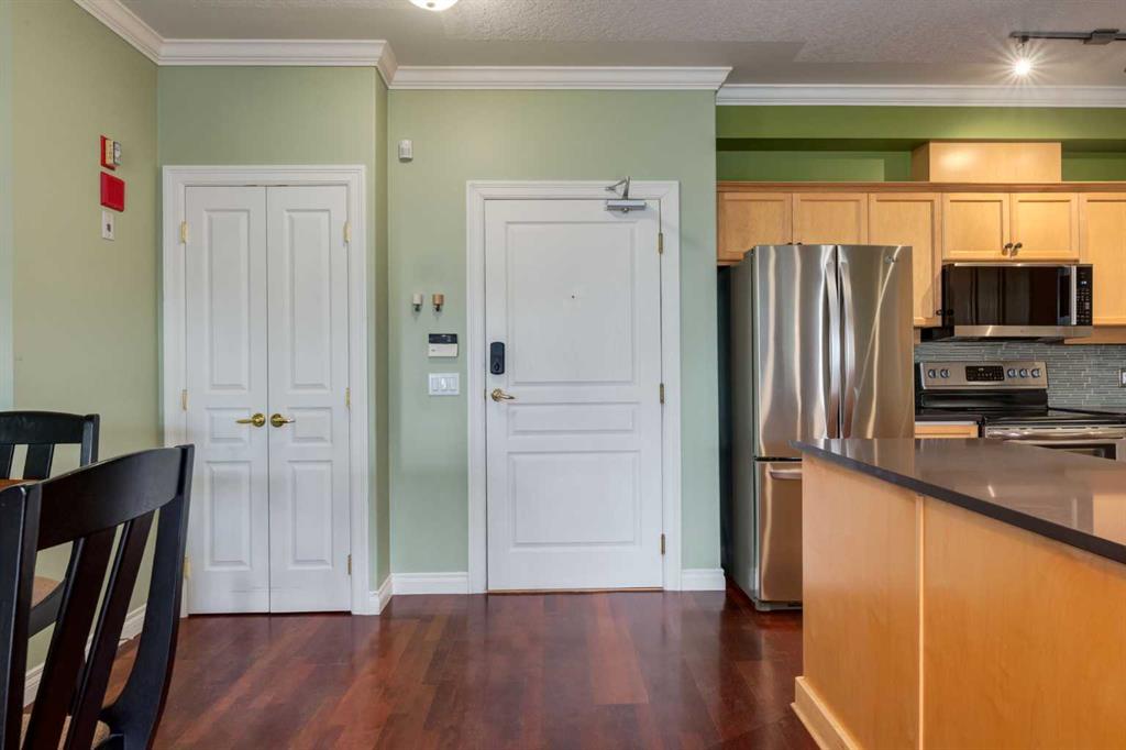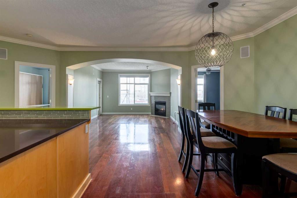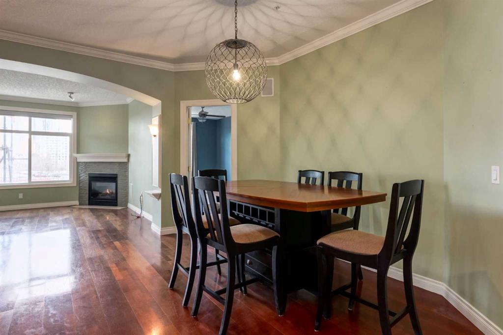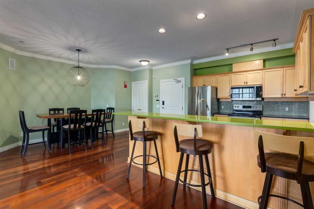 Welcome Home! Enjoy exceptional panoramic views of downtown Calgary from this stunning and stately third-floor condo, offering over 1,000 square feet of thoughtfully designed living space. Relax and unwind in the bright, open-concept living area featuring a cozy natural gas fireplace. Step outside to your private deck, which has a natural gas hookup perfect for year-round BBQing and entertaining. The well-appointed laundry room is conveniently located within the unit and includes a full-size washer, dryer and additional storage. The gourmet kitchen is designed for both function and style, showcasing stainless steel appliances, quartz countertops, and a two-tier breakfast bar. This home features two spacious bedrooms and two full bathrooms. The primary bedroom offers a private retreat with a walk-in closet and a luxurious ensuite complete with dual sinks, a separate shower and a full-size soaker Jacuzzi tub.The second bedroom includes a custom-built Murphy bed with an integrated desk which is ideal for guests, a home office or flexible living space. Additional upgrades include a built-in alarm and speaker system (8 speakers with dual volume controls), fresh paint in the bedrooms and living area (2026), a new washer (2025) and a new microwave (2026). The River Grande Estates complex is designed for comfortable living and is a community featuring a beautiful, peaceful courtyard, library, games and recreation room with a pool table, two underground car wash bays and indoor visitor parking. Parking is simple and secure with your titled, heated underground parking stall. This home also includes an assigned storage locker and bicycle storage is available for a small fee. Located in the highly desirable Erlton community, this amazing inner-city location offers parks, pathways and convenient access to downtown Calgary. You are within walking distance of the MNP Community & Sport Centre, featuring a pool, gym, and indoor track, as well as downtown, the Saddledome, Stampede Grounds, Calgary Tower and LRT access. Move-in ready. Call today to view your next home.