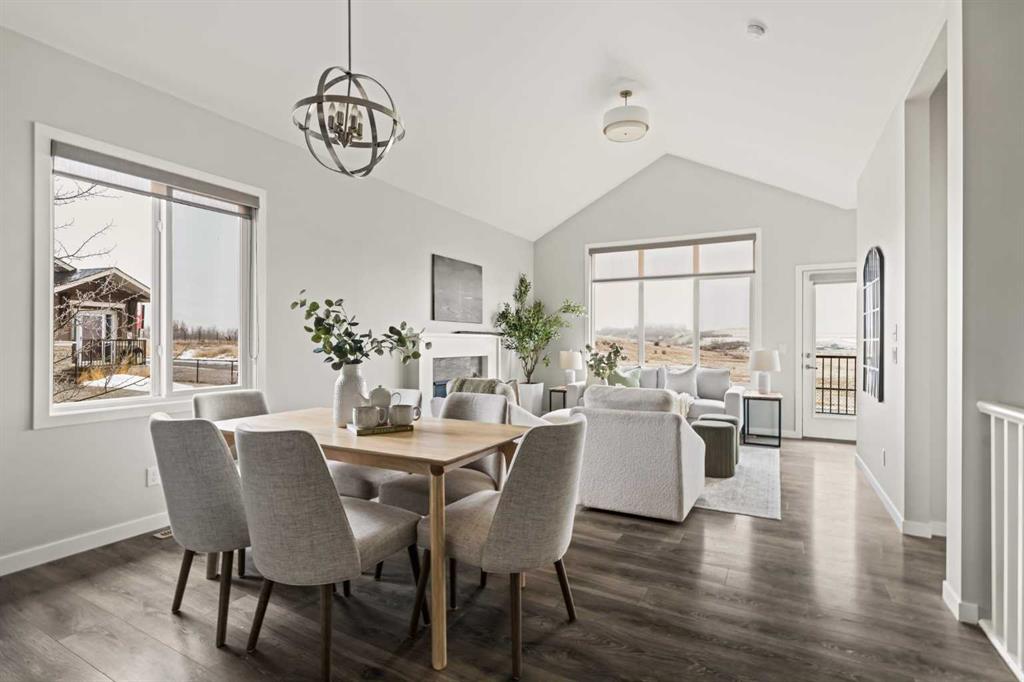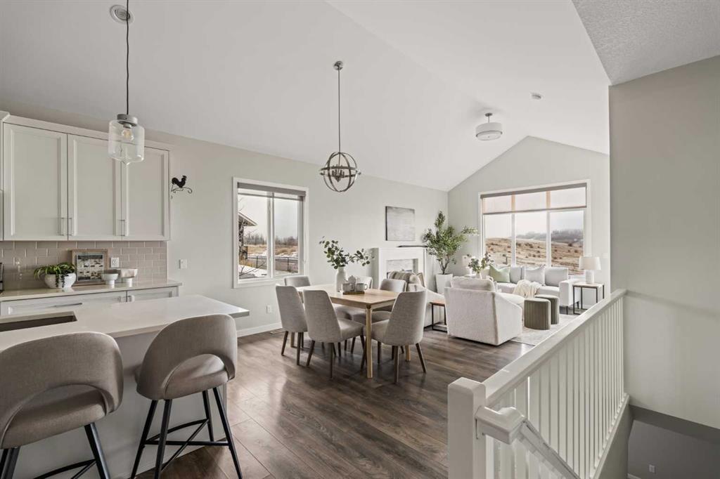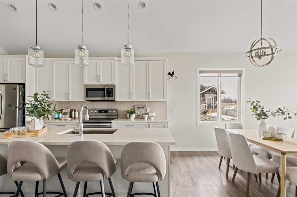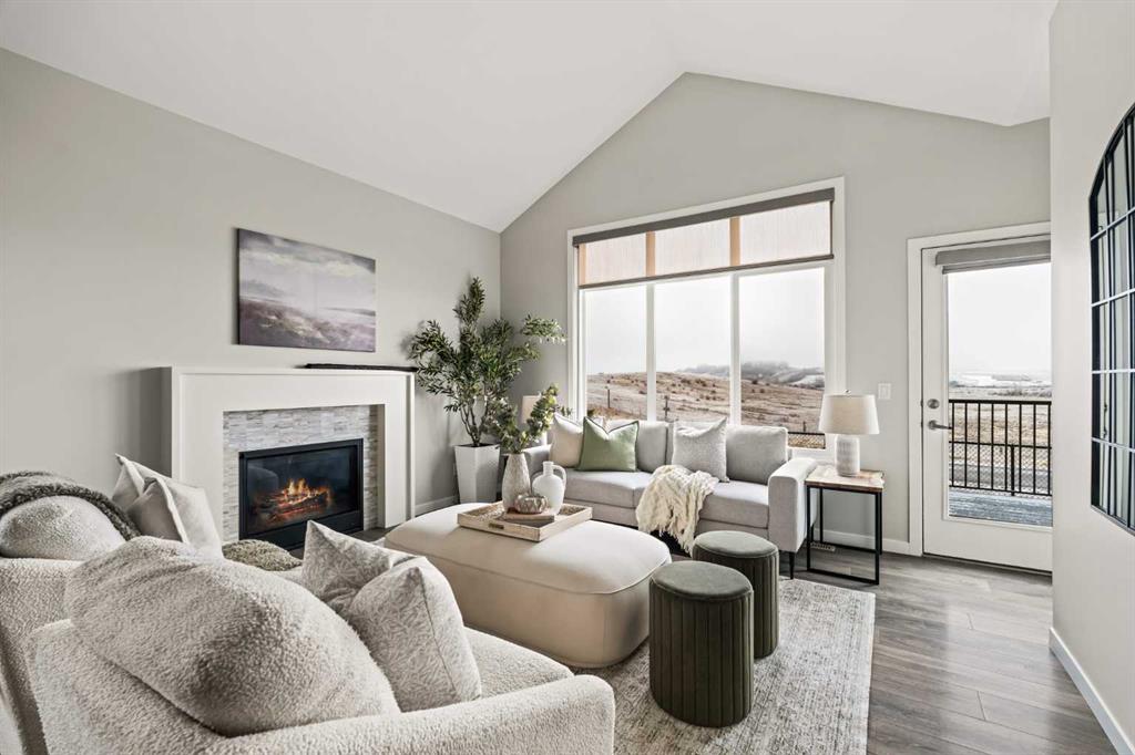 This beautifully maintained original-owner bungalow villa offers the perfect blend of elevated design and effortless living - ideal for downsizers, snowbirds, or anyone seeking a lock-and-leave lifestyle without compromise. Tucked into a quiet, small-town setting with no neighbours behind, this corner unit home delivers exceptional privacy and a peaceful backdrop, best enjoyed from the sunny south-facing backyard with viewings overlooking the pasture. Featuring 2 living areas, 3 bedrooms, 2.5 bathrooms and over 2,300 sq. ft. of developed living space, this property ensures you can easily host family and friends while creating the lifestyle you're looking for. Inside, vaulted ceilings and resilient laminate flooring create a bright, airy atmosphere throughout the main level. The open-concept design is anchored by a stylish, timeless white kitchen featuring quartz countertops, a subway tile backsplash and a suite of stainless steel appliances. A large central island provides additional dining and prep space and a large pantry ensures ample storage. The kitchen seamlessly connects to the dining area and inviting living room making this the perfect space for entertaining. The expansive main living space is anchored by a central gas fireplace with a tile surround and mantle and a wall of south-facing windows provides breathtaking views all year long. The large primary suite spans ~13'x13', offering ample space for a full bedroom suite and unobstructed views overlooking the green space behind. The primary suite includes a private ensuite featuring dual sinks, a walk-in shower, a private water closet, and a walk-in closet. The main level is complete with a conveniently located laundry room and a two-piece powder room, ensuring you can enjoy single-level living every day. The professionally developed lower level greets you with an expansive ~13'x26' recreation room that has ample space for a TV-area, home gym and games area - the options are endless! The lower level includes two bedrooms, a full bathroom, and ample storage. This home has brand-new carpet throughout and has been freshly painted, making it fully move-in ready! Completing the home is a private double attached garage that enhances both convenience and lifestyle - offering secure access, additional storage, and true lock-and-leave functionality - perfect for seasonal living or travel. Situated on one of the most desirable lots in the entire development, this incredible opportunity offers optimal natural light, a large south-facing deck with views and no neighbours behind and central A/C to keep you cool all summer long. It's perfect for those wanting to downsize without compromise. Start enjoying a maintenance-free lifestyle now in the desirable new community of Fireside, just minutes from countless amenities and a short drive to the mountains!