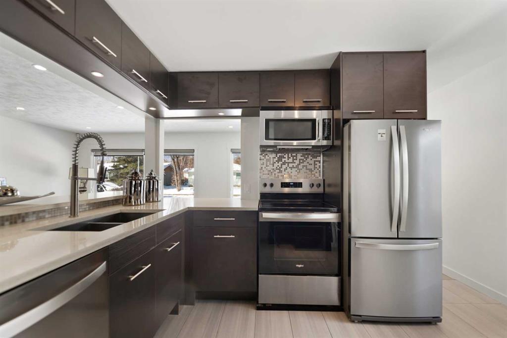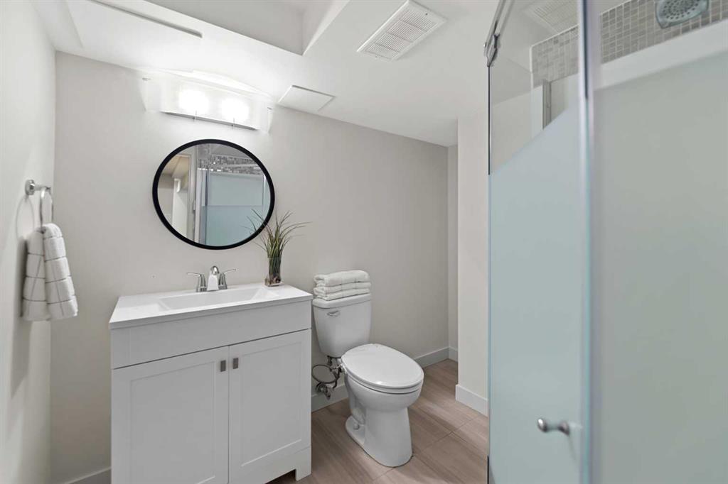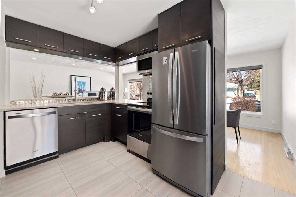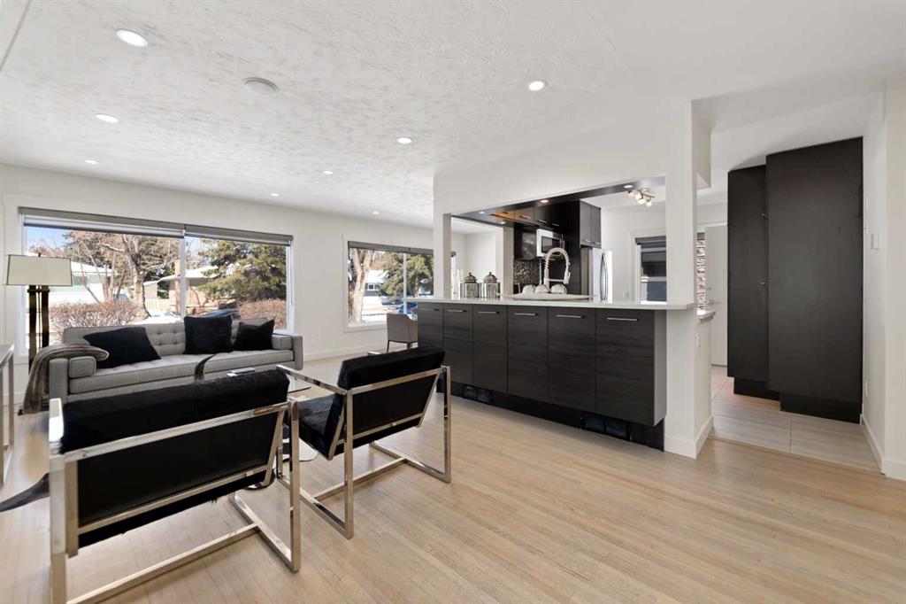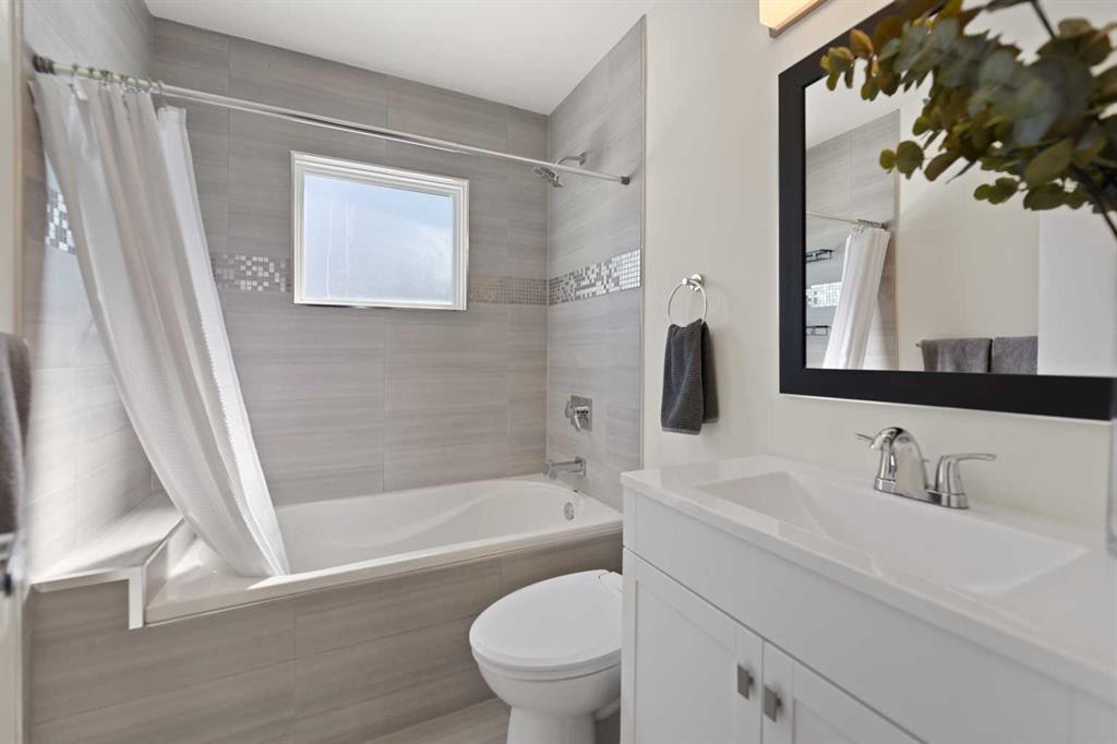 Welcome to this beautifully refreshed and updated bungalow where timeless charm meets modern comfort, nestled on a quiet tree-lined street with inviting curb appeal and abundant natural light throughout. Freshly painted and featuring large updated windows, gorgeous stained original hardwood floors, and an open-concept living and dining area perfect for everyday living and entertaining. The updated kitchen offers stainless steel appliances, ample quartz counter space, and stylish functional finishes. The spacious primary suite provides a serene retreat with a private ensuite featuring dual sinks, quartz vanity, glass shower, and excellent built-in closet space. Two additional main floor bedrooms offer flexibility for family, guests, or a home office, with one bedroom conveniently hosting the main floor washer and dryer. A second full bathroom includes a soaker tub and quartz counters. The lower level features a 1-bedroom illegal basement suite ideal for a mortgage helper or in-law accommodation, currently configured as one home but easily separated, complete with open island kitchen, large living and dining area, separate laundry, one bedroom, and full bath. The side entrance off the kitchen leads to a perfect BBQ area and fully fenced backyard. The single attached garage features a newly poured concrete floor, with front driveway parking for at least two additional vehicles. Additional upgrades include fresh paint (2026), central A/C (2023), hot water tank (2020), newer roof (2018), furnace (2017), upgraded attic insulation (2020), and more. Ideally located close to schools, parks, shopping, and transit including the LRT, this move-in-ready home offers excellent value and income potential in a desirable established neighbourhood.
