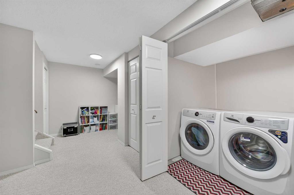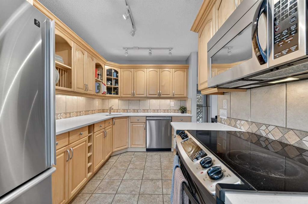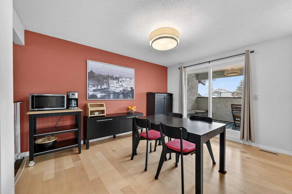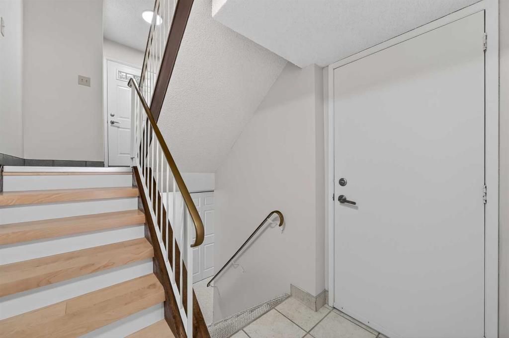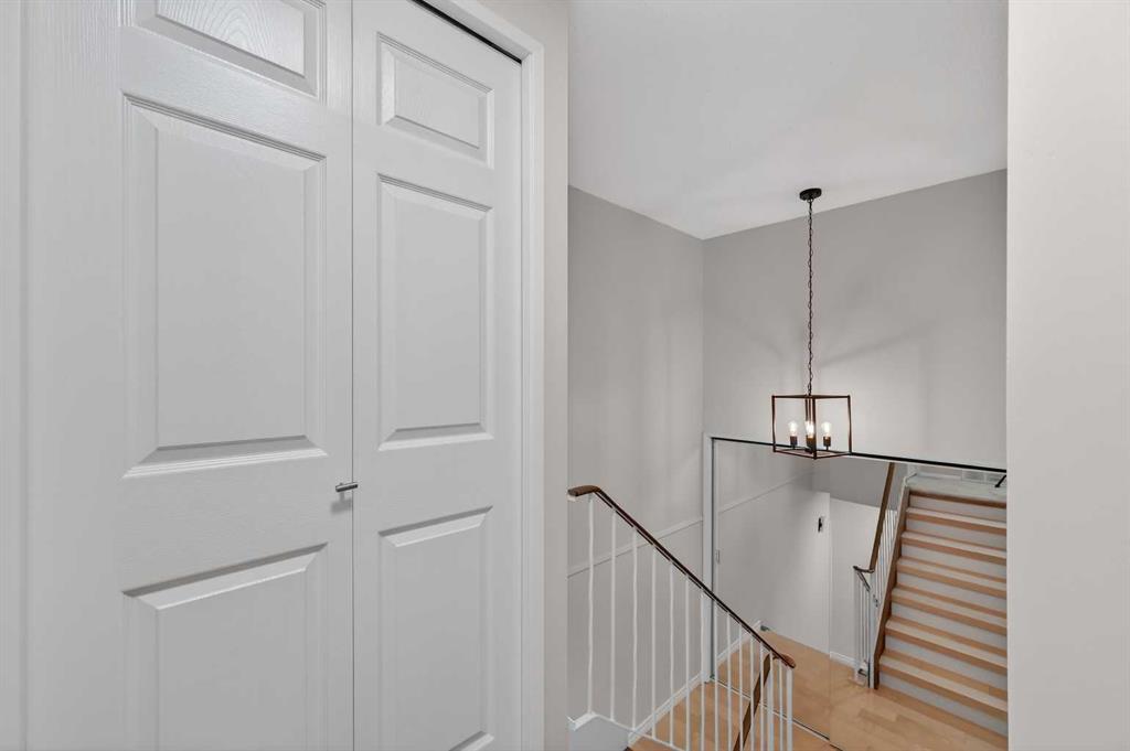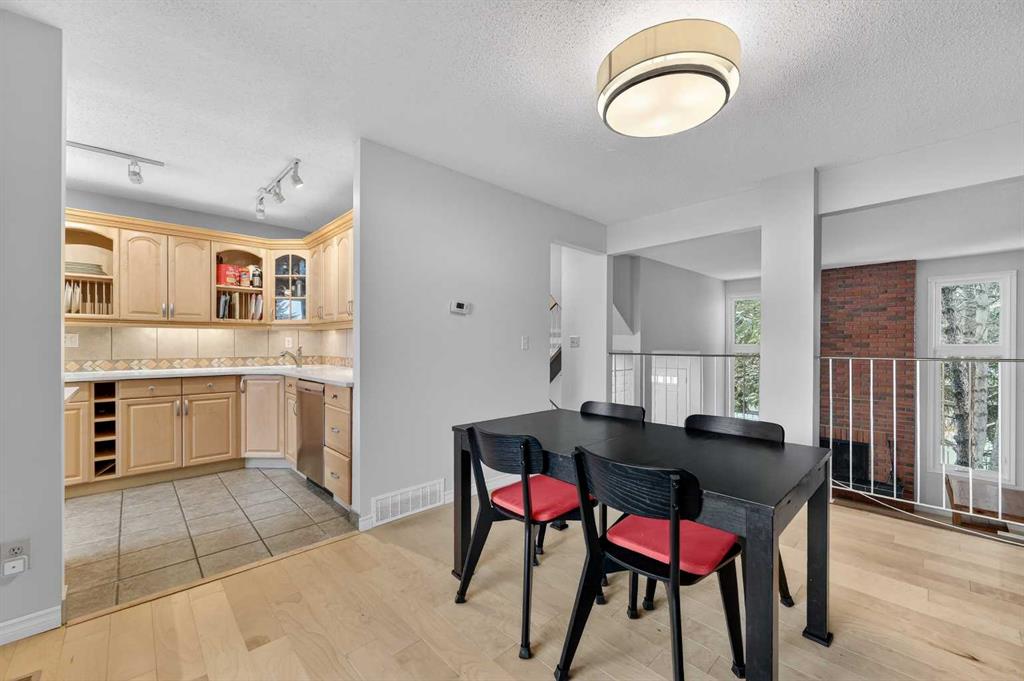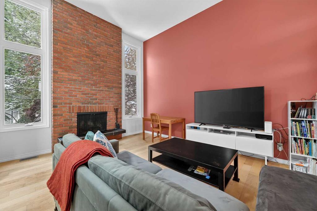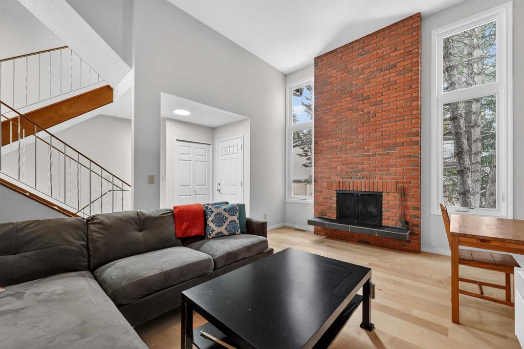 ** OPEN HOUSE SAT Apr 11, 2-4pm *** WEST facing END unit with COVERED front BALCONY in coveted 5400 Dalhousie! UPDATED and clean with a fully finished basement, this unit has so much to offer. TILE front foyer is SPACIOUS with lots of room for mudroom gear. GREAT ROOM with cathedral ceiling, NEW engineered HARDWOOD flooring, WOOD burning fireplace, stunning brick masonry floor to ceiling, SLATE hearth, ALL NEW 3pane WINDOWS (throughout!), great gathering space, with door to your very PRIVATE backyard with PATH behind. Engineered HARDWOOD continues in upper DINING room with lots of room for large table, hutch or curio cabinet. RENOVATED kitchen with MAPLE cabinets, PULLOUT pantry, QUARTZ countertops, new SINK, HEATED FLOORS, STAINLESS STEEL appliances w/NEW DISHWASHER (2025), UNDER COUNTER lighting, LOADS of storage. Pause and TAKE IN the COVERED WEST balcony, one of a handful in the complex, with MOUNTAIN VIEW. 2-piece powder room with HEATED floor. UPPER level has LARGE PRIMARY bedroom, sitting amongst tree tops from double windows view over the backyard, DOUBLE closets for all your things, 2ND bedroom with BIG closet and WEST VIEW. FAMILY BATH with SOAKER tub, MAPLE vanity with ADDED banks of STORAGE, black hardware. Deep LINEN CLOSET holds more than just linens! FINISHED basement is bonus FLEX space and includes NEW Electrolux w/d LAUNDRY (Aug 2025, done under permit). NEW HWT (2024), Patio doors (2024), Windows (2025), RE-INSULATED attic (2024), NEW bathroom fans (2024). All this with a SINGLE ATTACHED GARAGE with direct entry into your home, an ABUNDANCE of AMENITIES including indoor pool, fitness, racquetball court, gym, party space, deck with view of COP, sauna, games room, kitchen. Walking distance to shops, Dalhousie LRT station, schools and community association! This home stays warm in winter and cool in summer in a complex that offers so much for families!
