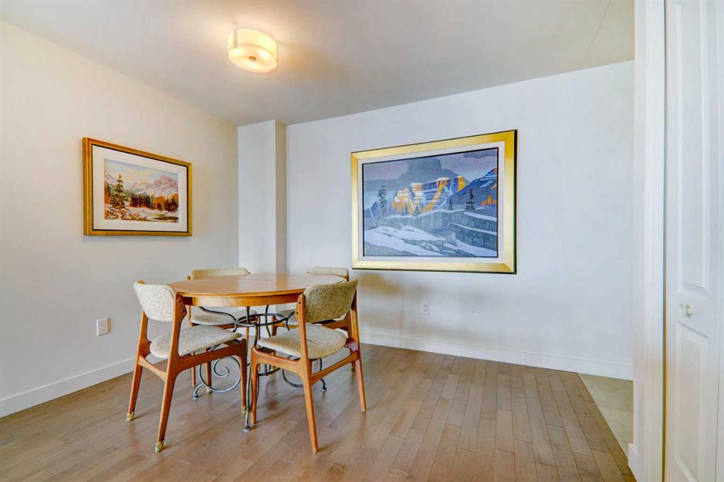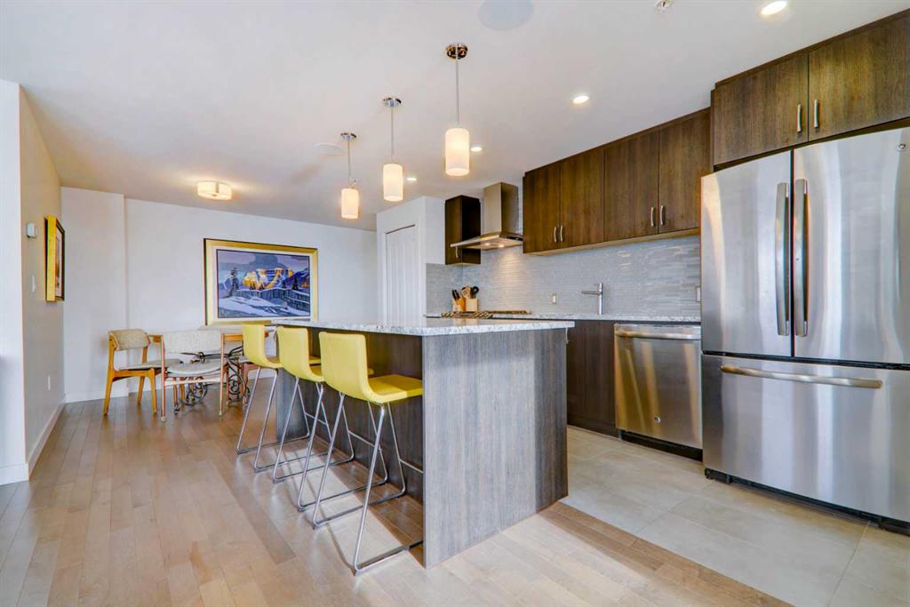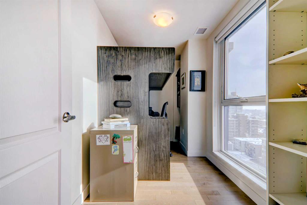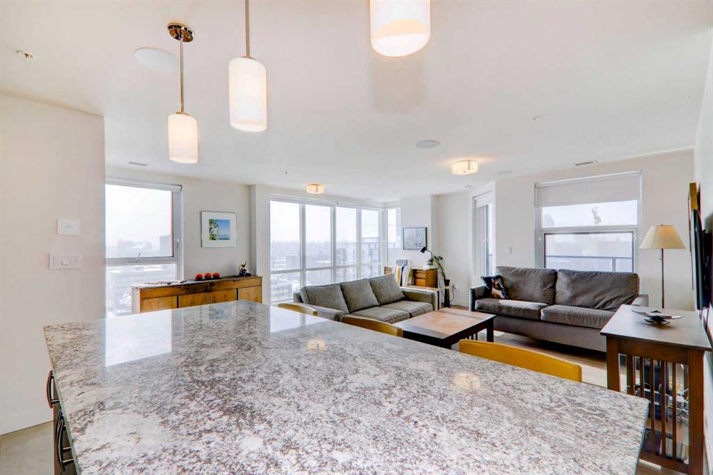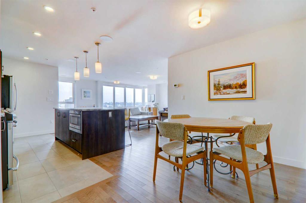 Step into elevated inner-city living with this beautifully appointed 2-bedroom, 2.5-bathroom residence in the heart of Calgary’s vibrant Beltline. Perched on the 14th floor, this corner unit showcases sweeping panoramic views—capturing the Downtown skyline, Rocky Mountains, and Memorial Park through expansive floor-to-ceiling windows. Offering 1,279 sq. ft. of air-conditioned space, the home blends upscale finishes with a thoughtfully designed open-concept layout. The kitchen is both stylish and functional, anchored by a large granite island and complemented by premium stainless steel appliances, including a gas range. Full-height espresso cabinetry with under-cabinet lighting adds warmth and sophistication. The dining area is perfectly suited for entertaining, while the bright living room extends onto a west-facing balcony—ideal for evening sunsets and summer grilling with the gas BBQ hookup. A versatile den featuring a built-in Murphy bed and drop-leaf desk provides the perfect work-from-home setup or guest space. Both bedrooms offer walk-in closets with custom organizers and private, spa-inspired 4-piece ensuites. The primary retreat includes its own balcony with serene southern exposure, while the second bedroom is generously sized and equally well-appointed. Additional highlights include hardwood flooring, a convenient 2-piece powder room, and in-suite laundry. This unit also comes with tandem titled underground heated parking and a dedicated storage locker. Residents of Park Point enjoy exceptional amenities, including a fully equipped fitness centre, outdoor terrace, resident lounge, recreation room, guest suite, bike storage, and ample underground visitor parking with EV charging. Professional management and secure access offer true lock-and-leave convenience. Set in one of Calgary’s most desirable urban locations, you’re just steps from Central Memorial Park, the energy of 17th Avenue, 4th Street dining and nightlife, and the evolving entertainment district. With easy access to the LRT, Stampede Grounds, MNP Community & Sport Centre, river pathways, and more, this is city living at its finest—refined, connected, and ready for its next chapter.