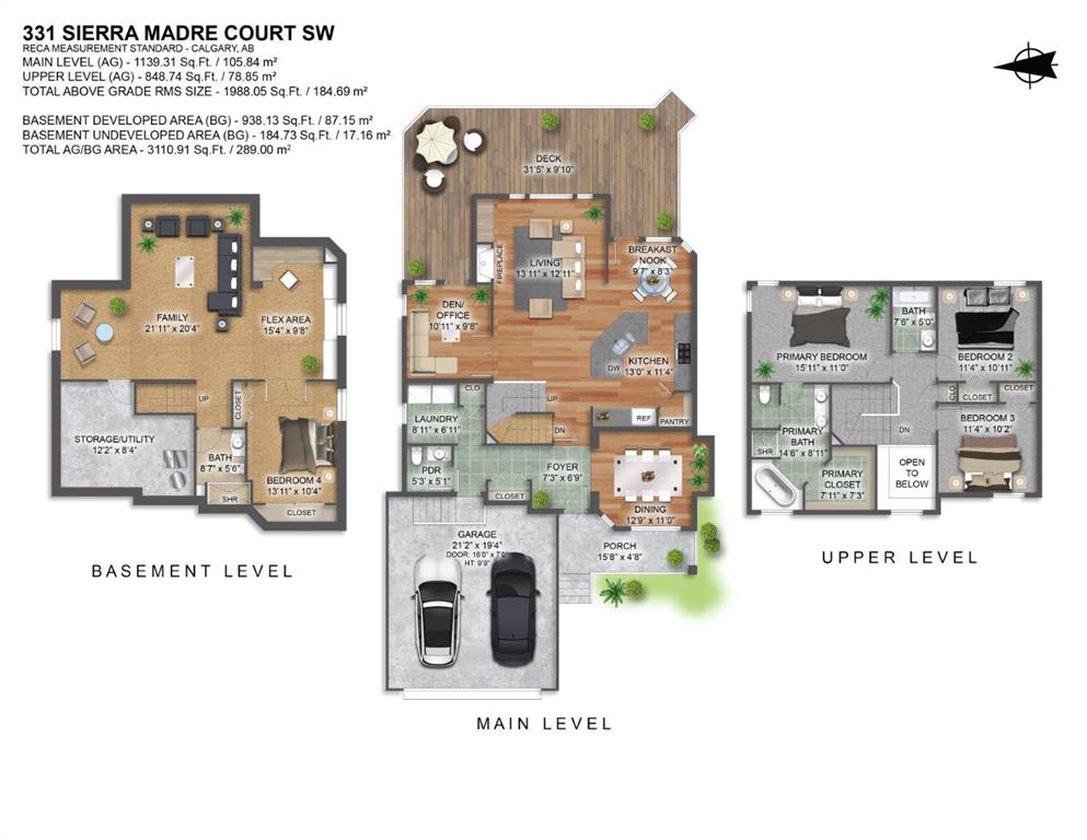 Prime Location in Signal Hill – Backing onto Green Space! Tucked away at the end of a quiet cul-de-sac, this well-maintained and upgraded 2-storey home offers over 2,900 sq. ft. of developed living space, exceptional privacy, and direct backing onto green space. Ideally located close to Westhills Towne Centre, schools, the recreation centre, downtown, and with easy access to major routes, this home combines convenience with a peaceful setting. The functional main floor, spanning over 1,100 sq. ft., features a fully upgraded kitchen with quartz countertops and stainless steel appliances, along with a formal dining room, den, breakfast nook, and a bright living room with vaulted ceilings and a cozy gas fireplace. An external solar screen blind enhances comfort and efficiency by covering the large windows. A laundry room and powder room complete this level. Step outside to a newly built deck overlooking a large, well-maintained pie-shaped lot—perfect for outdoor activities and entertaining. The charming front porch offers the ideal spot to relax and enjoy evening sunsets. Upstairs, the spacious primary suite includes a large ensuite with a corner soaker jetted tub, separate shower, and double vanity. Two additional generously sized bedrooms and a full bathroom complete the upper level. The fully finished basement provides even more living space with a massive recreation area featuring built-in desk and shelving, a fourth bedroom with an egress window, and a full bathroom. Recent updates such as fresh paint throughout, triple-pane windows, quartz countertops, and stainless steel appliances further showcase the pride of ownership in this exceptional home. Please click the Virtual Tours for more details!