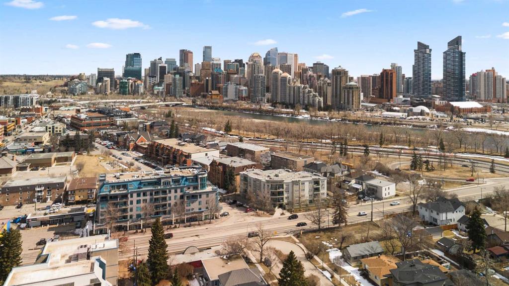 Rare opportunity to live in privacy on the quiet east side of Kensington Mews!! DOWNTOWN VIEWS, and over 700 sf. of patio space....one of the largest in the area! Exceptional unit has been meticulously maintained by longtime owners. Updated features include new paint throughout, granite counters, custom window coverings, AC units in living room and master bedroom, new composite decking on patio. Floorplan is excellent with room for dining, casual eating on the breakfast bar, tons of seating in living room, corner fireplace, laundry/ pantry.....massive primary bedroom with east facing reading nook and large closets, second bedroom includes murphy bed and converts handily to office.....4 piece bath with cheater door into master. Living room opens to gorgeous patio with gas BBQ hookup. Host your entire family and friends!! This CONCRETE building is quiet and cool! Building also includes titled parking stall, lots of visitor parking, secure storage room, locked bike room and well-equipped gym. Well managed condo corporation with low monthly fees....pet friendly with no weight restriction with approval. Stroll outside your door along the river pathways, down the street in Kensington to all restaurants, pubs, cafes, hop on the LRT or walk 10 minutes downtown to work, get groceries, walk over to The Plaza Theatre.....location of this building is stellar at 96 walk score and 99 bike score. Calgary's coveted inner NW communities offer a lifestyle like no other!! It's a 10!!!