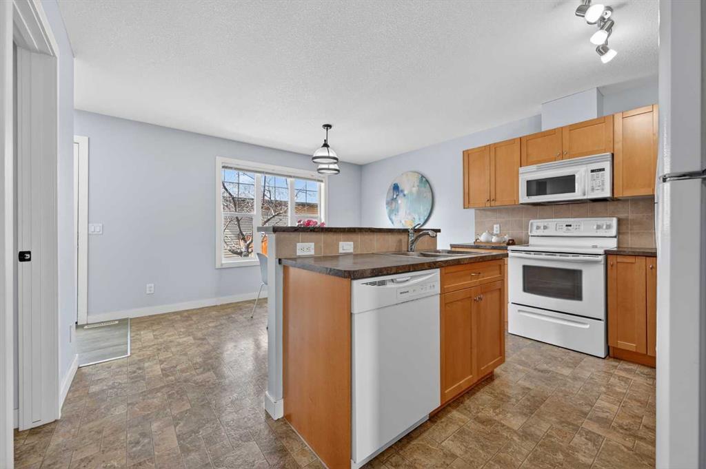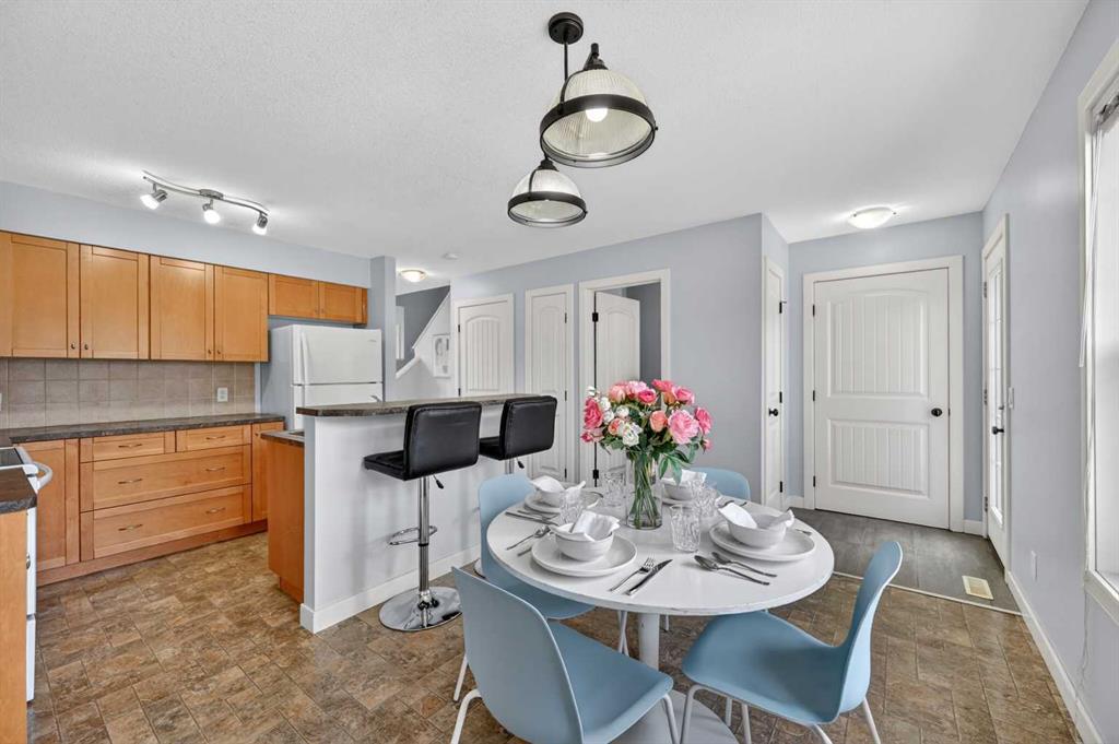 This spacious 2 bedroom, 2.5 bath townhouse is ideally located in desirable Evergreen, directly facing a large public park and featuring a private, fenced west-facing backyard, perfect for enjoying afternoon sun. The main floor offers a bright and functional layout with a welcoming living room, convenient two-piece bath, and a generous kitchen and dining area complete with a large breakfast bar, ideal for entertaining. Upstairs, you’ll find two well sized bedrooms, including a primary retreat with a full four-piece ensuite, plus an additional four-piece bathroom for added convenience. A versatile bonus room on the upper level provides the perfect space for a TV room, home office, or cozy retreat. The unfinished basement offers excellent potential for future development and includes a bathroom rough-in, providing added convenience and flexibility to customize the space to suit your needs. Enjoy the comfort of a double detached garage. All of this in a fantastic location close to shopping, public transit, schools, everyday amenities, and easy access to Stoney Trail.