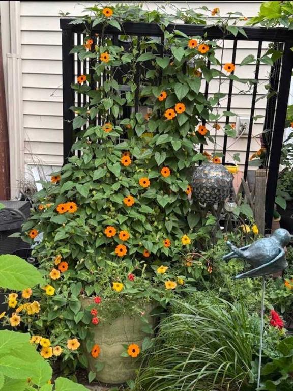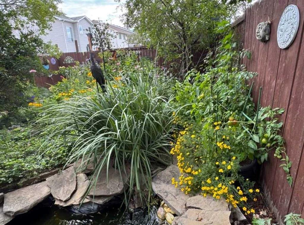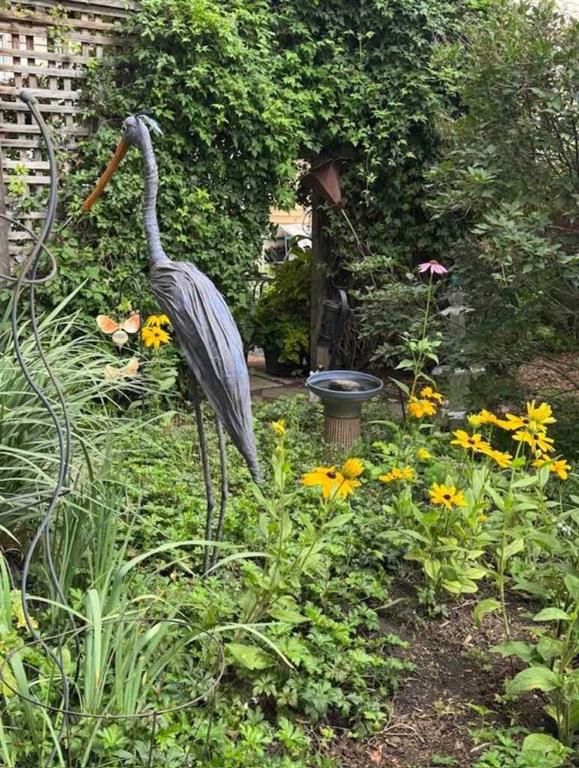Outdoors, the backyard is truly something special. Inspired by an English garden, it features lush perennials and a charming pond water feature, creating a serene and private retreat. Whether you’re enjoying a quiet evening or hosting guests, this space is sure to impress.
