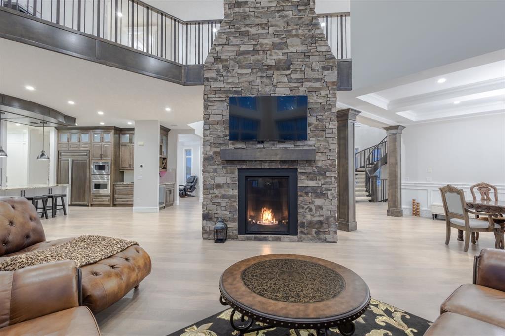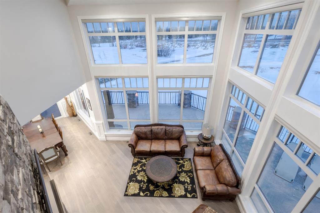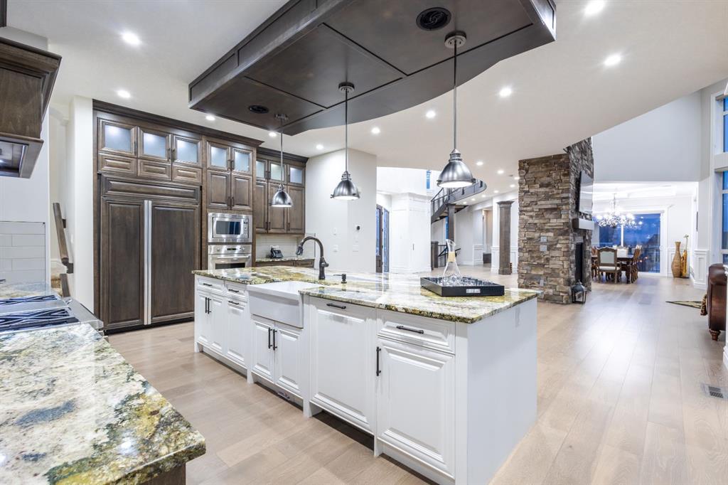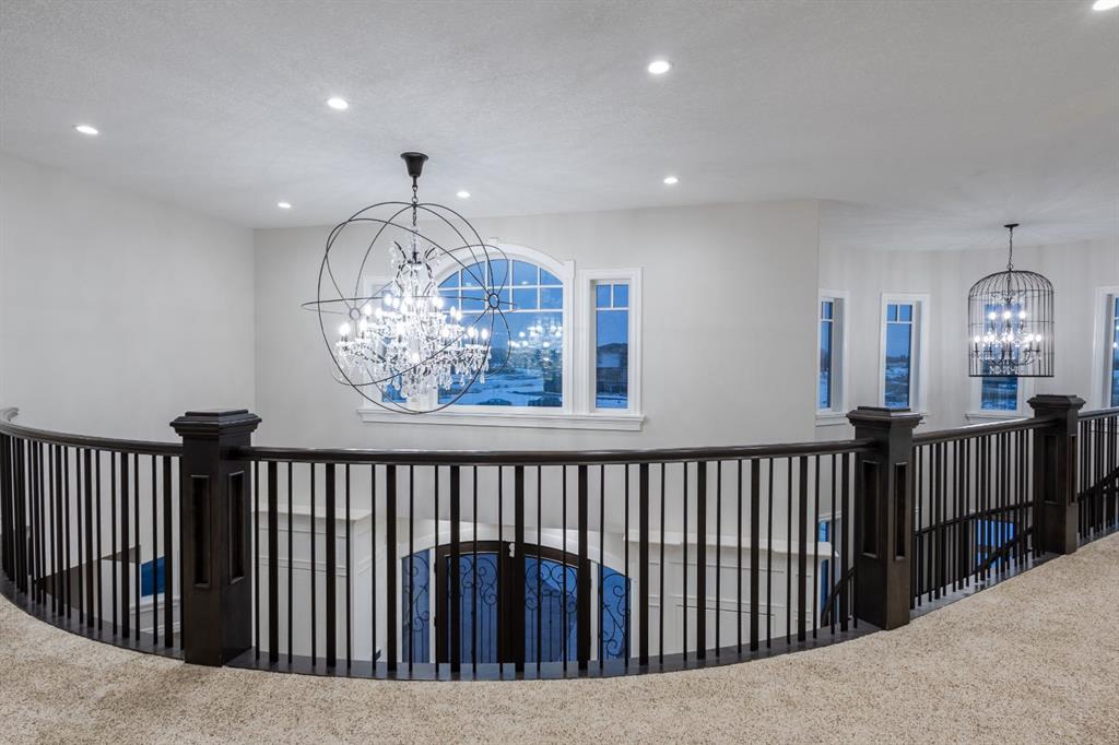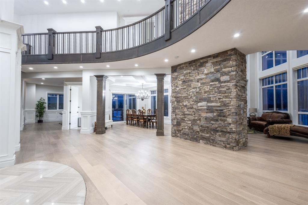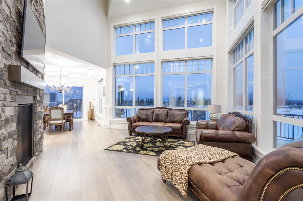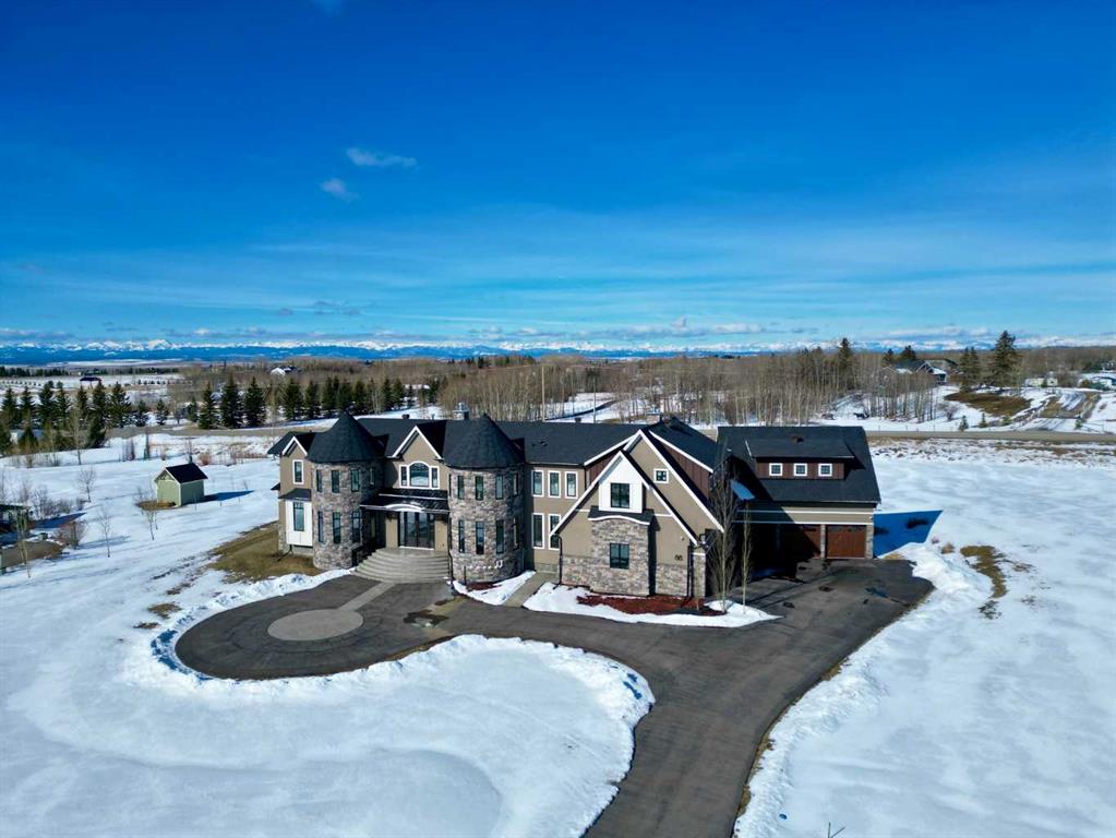 Located on two acres in the heart of prestigious Bearspaw, this exceptional custom-built estate offers over 7,000 square feet of refined living space, blending timeless elegance with modern luxury. From the moment you arrive, the grand entrance makes a lasting impression with soaring open-to-below ceilings, a breathtaking sense of scale, and stunning west-facing views that stretch toward the mountains. Expansive windows throughout the home flood the interior with natural light, enhancing the open-concept design and creating a seamless connection to the surrounding landscape. The chef-inspired kitchen is both beautiful and functional, featuring rich granite countertops, stainless steel appliances, generous bar seating, and a fully equipped spice kitchen—perfect for entertaining or everyday living. Thoughtful design continues with a convenient 2-piece bathroom on the main level. Just beyond, the living room is a true showpiece, anchored by a striking gas fireplace with stone surround and wooden mantel, while panoramic west and mountain views create an unforgettable backdrop. Step outside to the expansive west-facing wraparound deck, offering both covered and open-air spaces designed for relaxation and entertaining. With its private setting and sweeping mountain vistas, this outdoor retreat is truly one of a kind. Upstairs, the home continues to impress with an open-to-below design and a remarkable abundance of windows that showcase the incredible views. In addition to the primary retreat, there are four spacious bedrooms, two well-appointed bathrooms, and a thoughtfully designed laundry room complete with built-in cabinetry and a sink. A dedicated storage room adds even more practicality to this level. The primary suite is a luxurious sanctuary, featuring a double-sided gas fireplace, a spacious walk-in closet with custom built-ins, and a lavish 6-piece ensuite with a soaking tub, dual vanities, and premium finishes throughout. Step out onto your private balcony to take in the mountain views, or enjoy the attached flex space—perfect as an art studio, lounge, or private retreat. The fully developed walkout basement is designed for both entertainment and wellness. Enjoy movie nights in the dedicated theatre area with built-in sound system, host gatherings at the wet bar with custom built-ins, or relax in the sauna after a workout in the home gym. This level also includes in-floor heating, two additional bedrooms, a 3-piece bathroom, and direct access to the backyard. Dual staircases provide convenient and elegant access throughout the home, while features such as a water softener enhance everyday comfort. Car enthusiasts and hobbyists will appreciate the impressive heated six-car garage with ample space for storage and projects. With its unparalleled craftsmanship, luxurious finishes, and breathtaking setting with views of the northern lights and just minutes from the city, this extraordinary Bearspaw estate offers a lifestyle of sophistication and natural beauty.