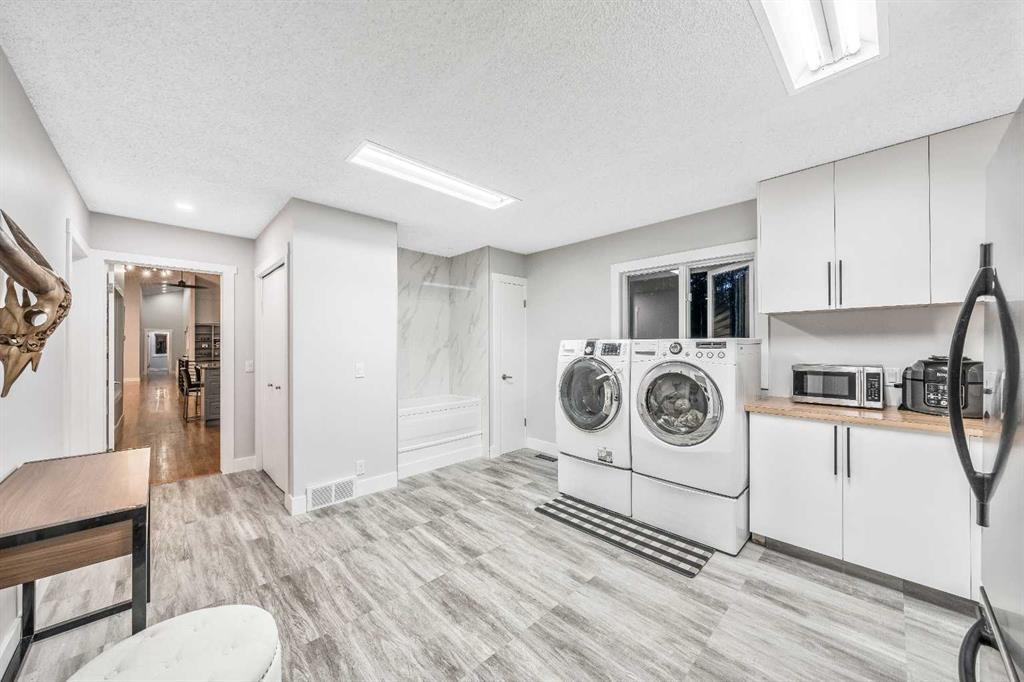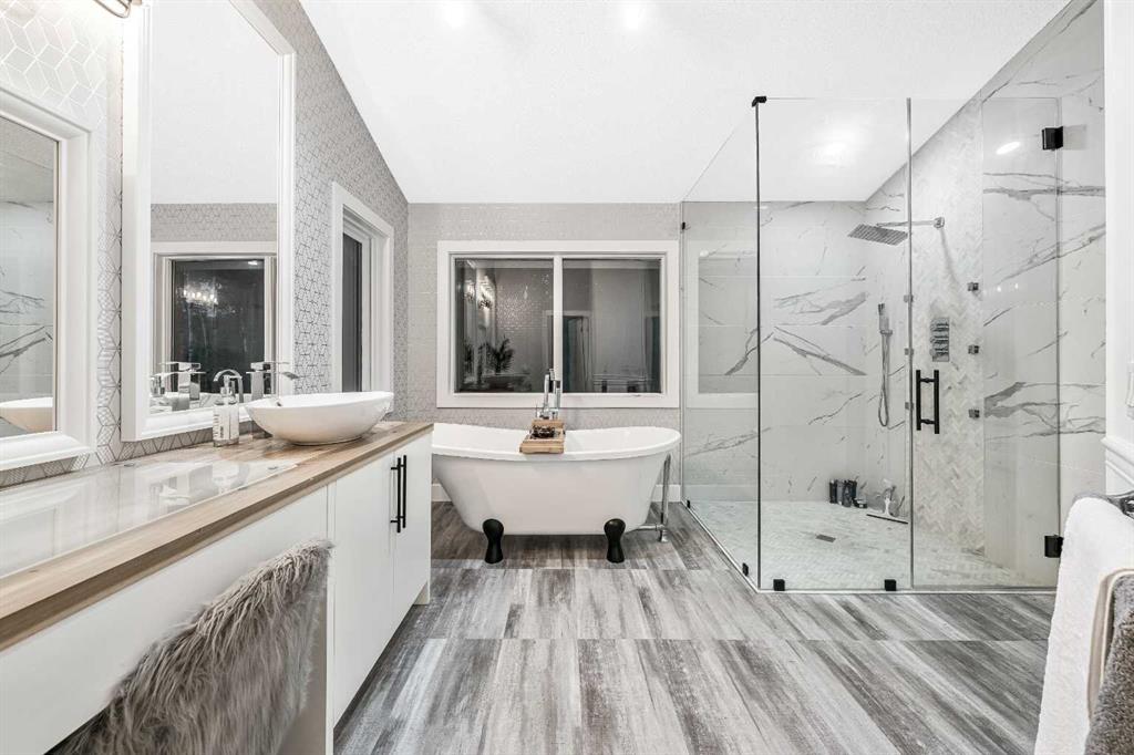 The north end of the main floor includes two generously sized bedrooms, a 4-piece bathroom, and the luxurious primary suite. The primary bedroom provides access to the back deck and features a spa-like 5-piece ensuite with a huge shower, soaker tub, and double sinks.