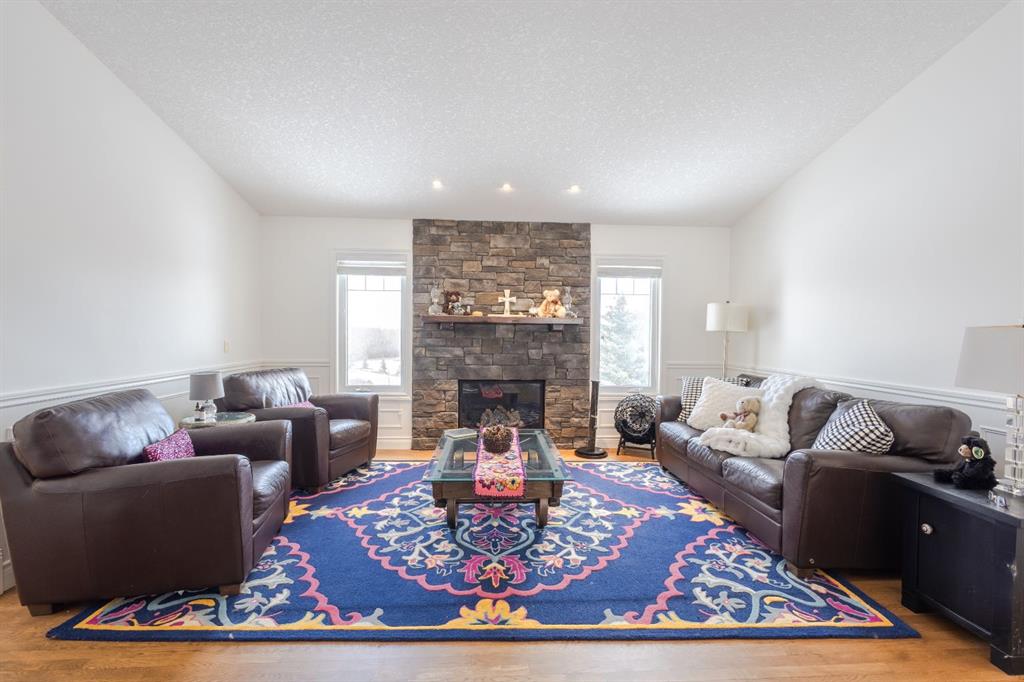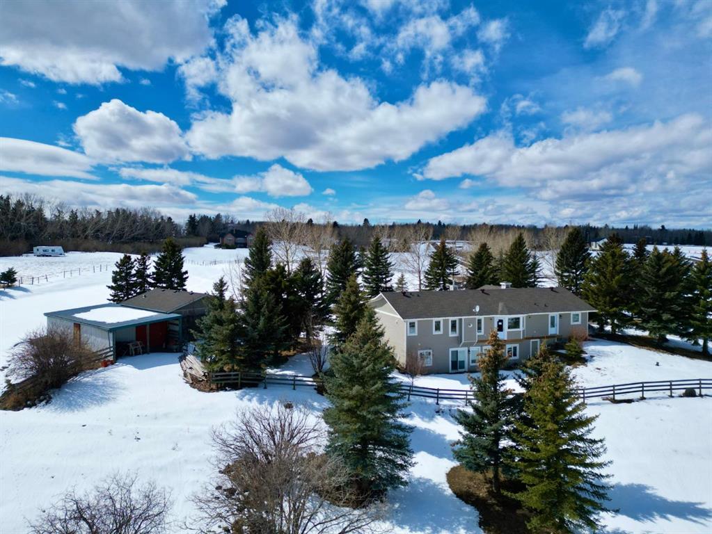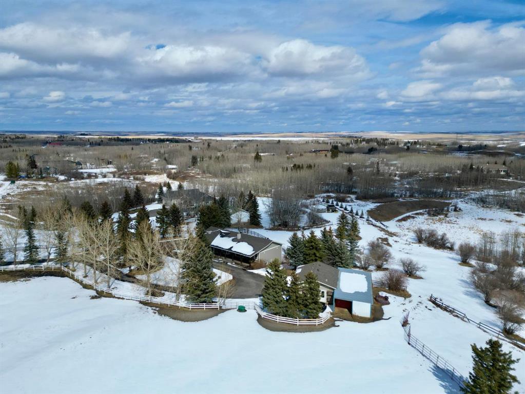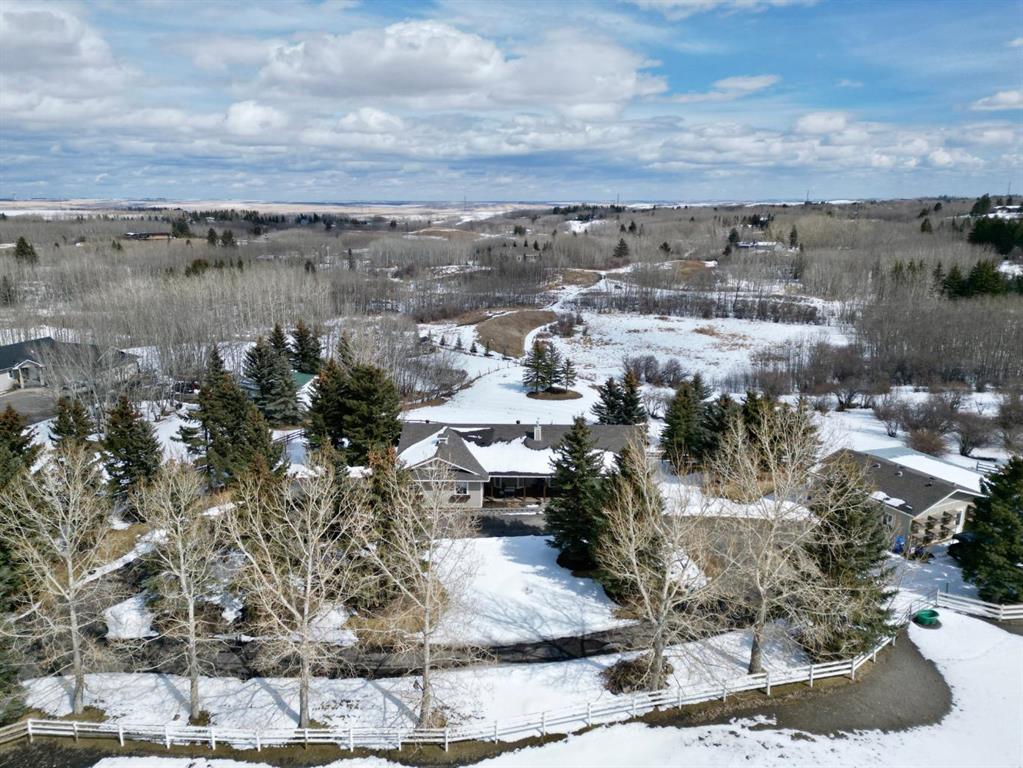Nestled on a breathtaking 5.46 acre parcel, this exceptional acreage property offers the perfect blend of natural beauty, functional space, and refined comfort. Boasting incredible curb appeal, the home welcomes you with a charming, expansive front porch—an ideal spot to relax and take in the peaceful surroundings. Thoughtfully designed front garden beds add character, while a massive wraparound driveway provides convenience and an impressive sense of arrival. The property itself is truly remarkable, featuring gently rolling hills, mature trees, and fencing that enhances both privacy and usability. Adding unique value, the acreage is home to Bearspaw’s Poshpaws Luxury Cat Resort, a well-appointed space complete with its own 2-piece bathroom and a functional kitchenette equipped with a dishwasher, fridge, microwave, and sink. Inside, the heart of the home is the stunning kitchen, designed for both everyday living and entertaining. It features a large central island with breakfast bar seating, sleek quartz countertops, stainless steel appliances, and a gas range stove for the home chef. A window above the sink frames picturesque views of the front yard, while a spacious pantry ensures ample storage. Adjacent to the kitchen, the bright and inviting eating nook is filled with natural light and offers a seamless, open-concept flow—ideal for casual meals and family gatherings. The living room is equally impressive, highlighted by a vaulted ceiling that enhances the sense of space, along with a cozy gas fireplace complete with a mantle and elegant stone surround. The primary bedroom is a peaceful retreat, generously sized and overlooking the private backyard. The luxurious 5-piece ensuite includes a dual vanity, stand-alone shower, and a walk-in closet, creating a spa-like experience at home. A convenient main floor laundry room adds practicality, featuring a sink and abundant counter space for organization. The fully developed walkout basement is bright and welcoming, with large windows and direct access to the backyard. It offers a spacious family room, two additional bedrooms, and a shared 4-piece bathroom. A dedicated gym space provides flexibility and can easily be converted into a fourth bedroom with its own walk-in closet. Additional features include two furnaces, a water softener, central vacuum system, and a new septic tank—ensuring comfort and peace of mind. This extraordinary property delivers the tranquility of country living with thoughtful amenities and endless potential.