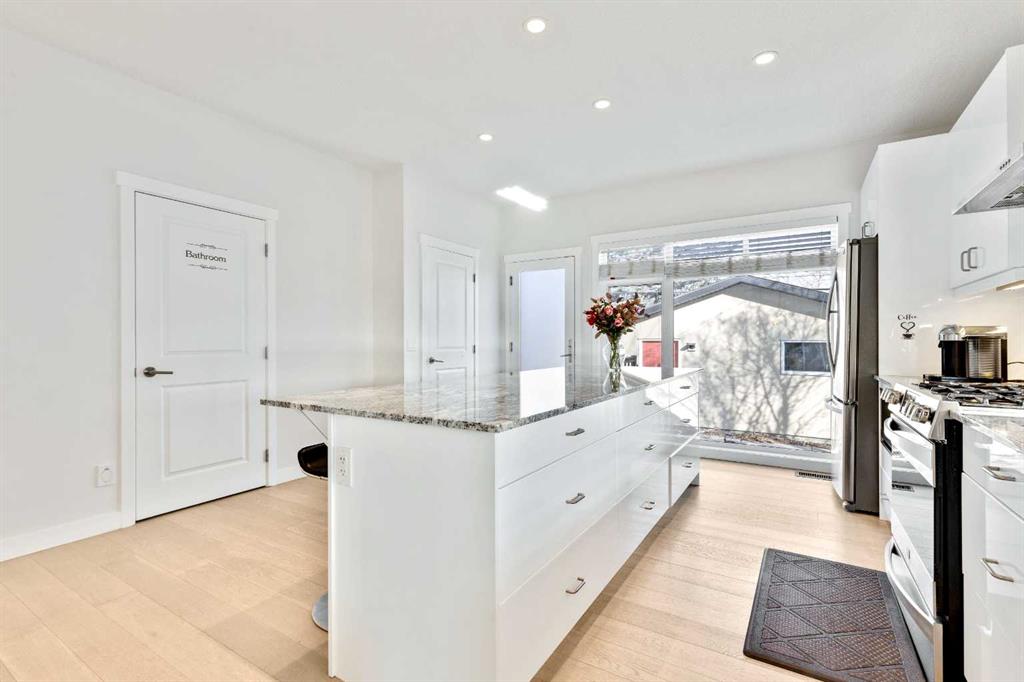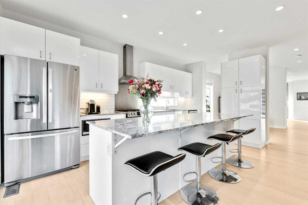 Just steps away from West Confederation Park, this custom-designed two-story home offers a rare blend of modern sophistication and Parkside tranquility. This fully detached residence was meticulously built with an unwavering attention to detail, offering peace, quiet, and abundance of natural light. Upon entry, you are greeted by an expansive open-concept living room featuring 9' ceilings, engineered hardwood floors, and a sleek electric fireplace. The heart of the home is a central dining area that transitions seamlessly into a white-on-white chef’s kitchen. Designed for both function and style, the kitchen boasts under-cabinet lighting, granite countertops, a massive island with a breakfast bar, and a premium appliance package with a gas range. The upper level is bathed in sunlight, thanks to a well-placed hallway skylight. The expansive master suite serves as a true sanctuary, featuring a unique private balcony—perfect for a morning coffee or an afternoon read. The suite is completed by a walk-in closet and a spa-like 5-piece ensuite equipped with a jet tub, dual vanities, and its own skylight. Two additional bedrooms, a 4-piece main bath, and a dedicated laundry room provide ample space for family or guests. The finished lower level continues the theme of light and space, offering a large family room with a sizable window, a 3-piece bathroom, and a spacious fourth bedroom. Perfectly situated near the University of Calgary, the C-Train, and premium local shopping, this home places you at the center of everything while maintaining the serenity of a park-adjacent lifestyle.