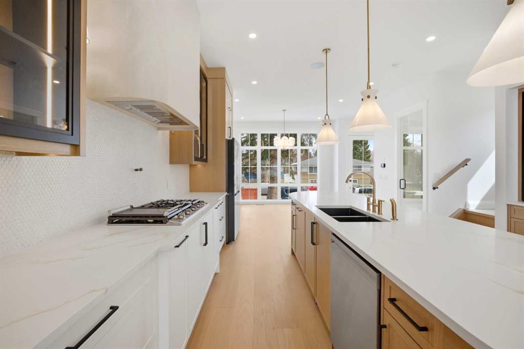From the moment you step inside, you’ll be impressed by the attention to detail and high-end finishings throughout. The main floor is designed with both functionality and style in mind, featuring a bright and open-concept layout. The spacious living room is perfect for relaxing or hosting guests, seamlessly flowing into the dining area and a stunning L-shaped kitchen. The kitchen is equipped with built-in appliances, sleek cabinetry, premium countertops, and modern fixtures, making it a true centerpiece of the home.