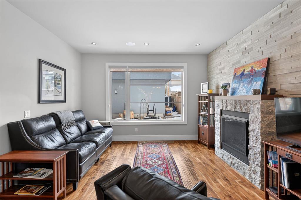 hardwood floors. A striking full-height natural stone feature wall frames the fireplace and