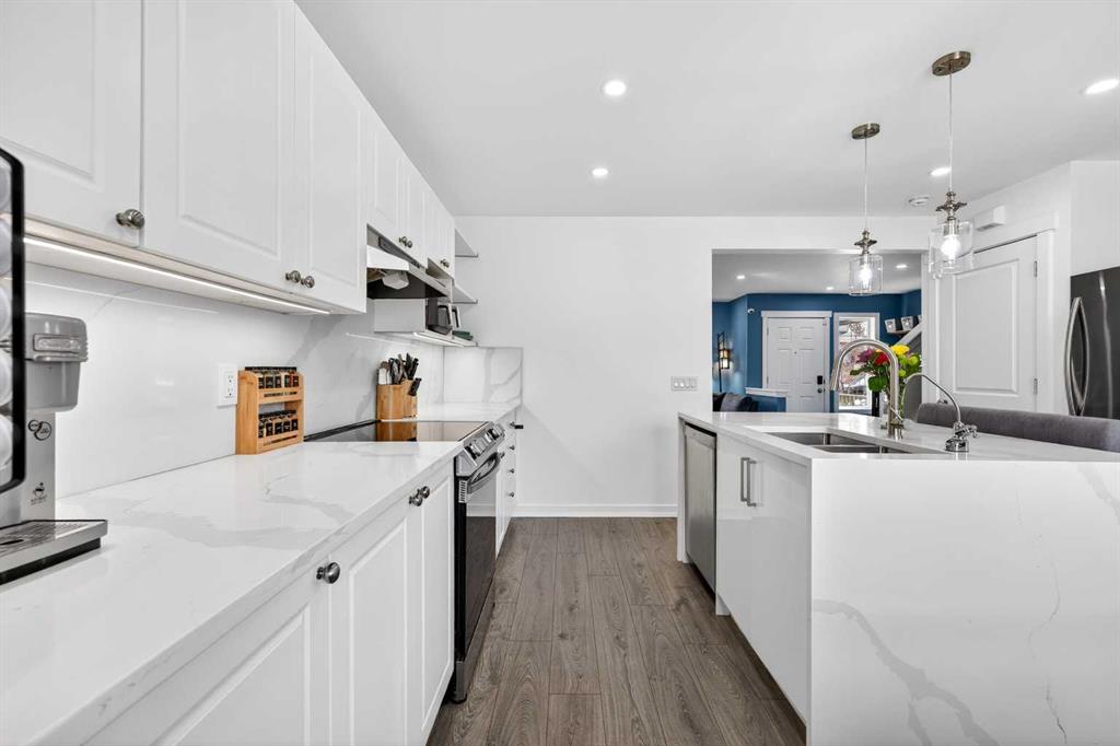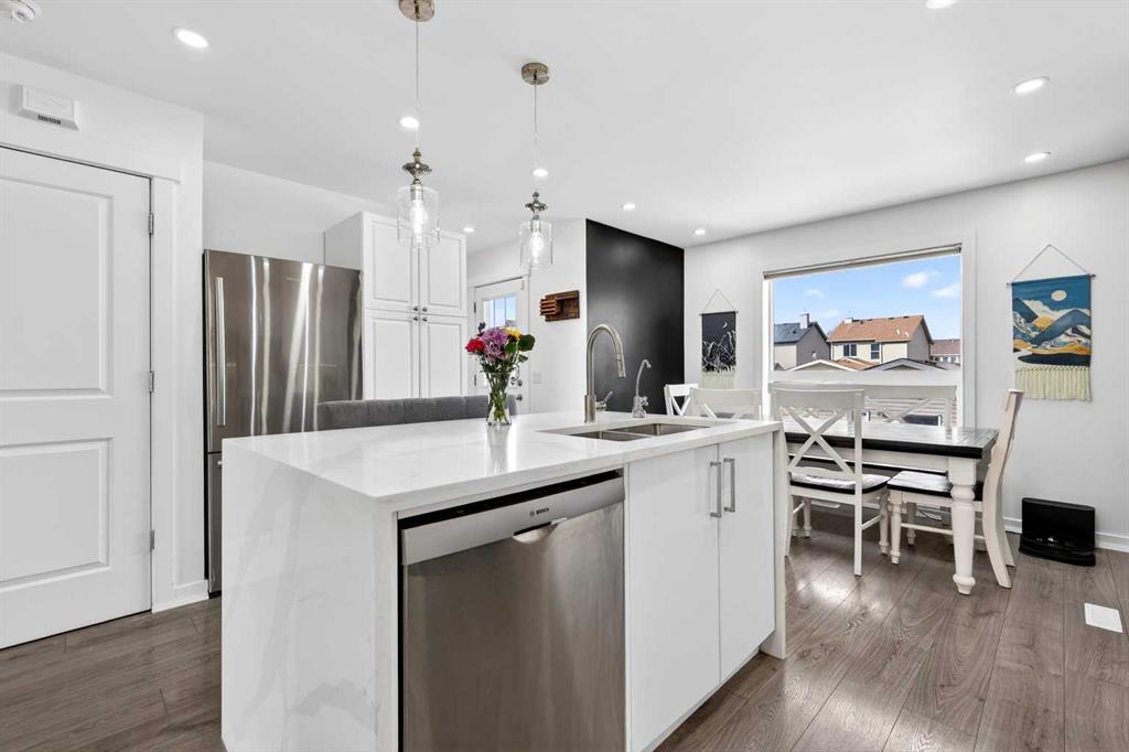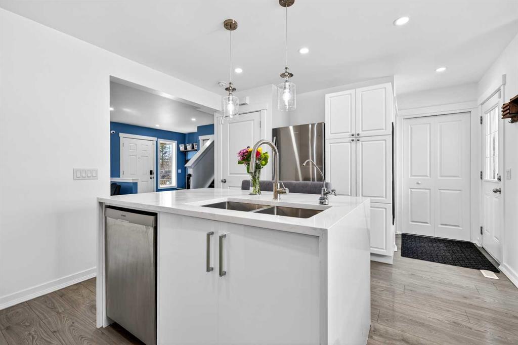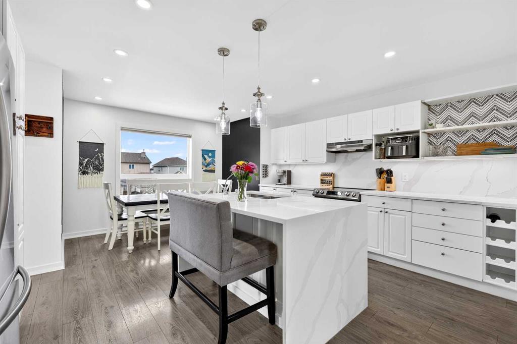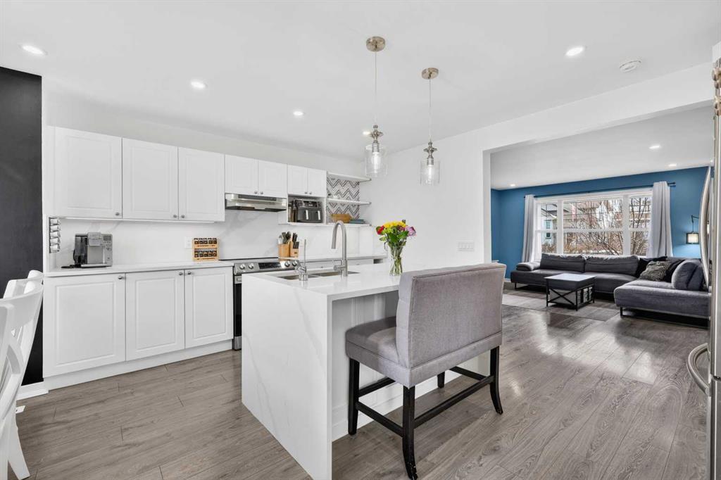 Open House Sunday April 12th 11:00 am - 1:00pm. Start each day on the expansive south-facing front porch where sunshine and neighborhood charm set a welcoming tone. Positioned kitty-corner to a green space and a walking path, this move-in ready home blends everyday comfort with immediate access to outdoor enjoyment. Step inside to an open-concept main level where durable laminate flooring and added pot lighting enhance both function and brightness. Relaxation is invited in the living area where oversized windows draw natural light inward, shaping a comfortable setting suited to quiet evenings or time spent with guests. Effortlessly prepare meals in the beautiful, chef’s dream kitchen where quartz counters, a waterfall island and stainless-steel appliances bring together style and practicality. Hosting is simplified in the adjacent dining area that keeps conversation flowing while maintaining clear sightlines across the main level. Daily routines are easily organized at the rear mudroom, where a privately tucked away powder room lets you easily clean up upon entry. The laminate flooring carries through to the upper level with no carpet, contributing to easy maintenance and a cohesive look. At the end of the day, recharge in the primary retreat that accommodates a walk-in closet and a private ensuite for a true owner’s escape. Two additional bedrooms introduce flexibility for family living, overnight visitors or a dedicated workspace, while a full 4-piece bathroom completes the upper level. Plan future possibilities in the unfinished basement that presents generous storage along with space ready for customization. Enjoy time spent outdoors on the large 2-tier deck that encourages barbecues and seasonal downtime while the fenced yard gives kids and pets room to play freely. Park vehicles securely in the double detached garage accessed from the paved back lane, adding everyday convenience. Phenomenally located within walking distance to nearby shops, pathways and parks while quick connections to schools and Yankee Valley Boulevard support an easy commute. Truly an outstanding location for this beautiful, move-in ready home!