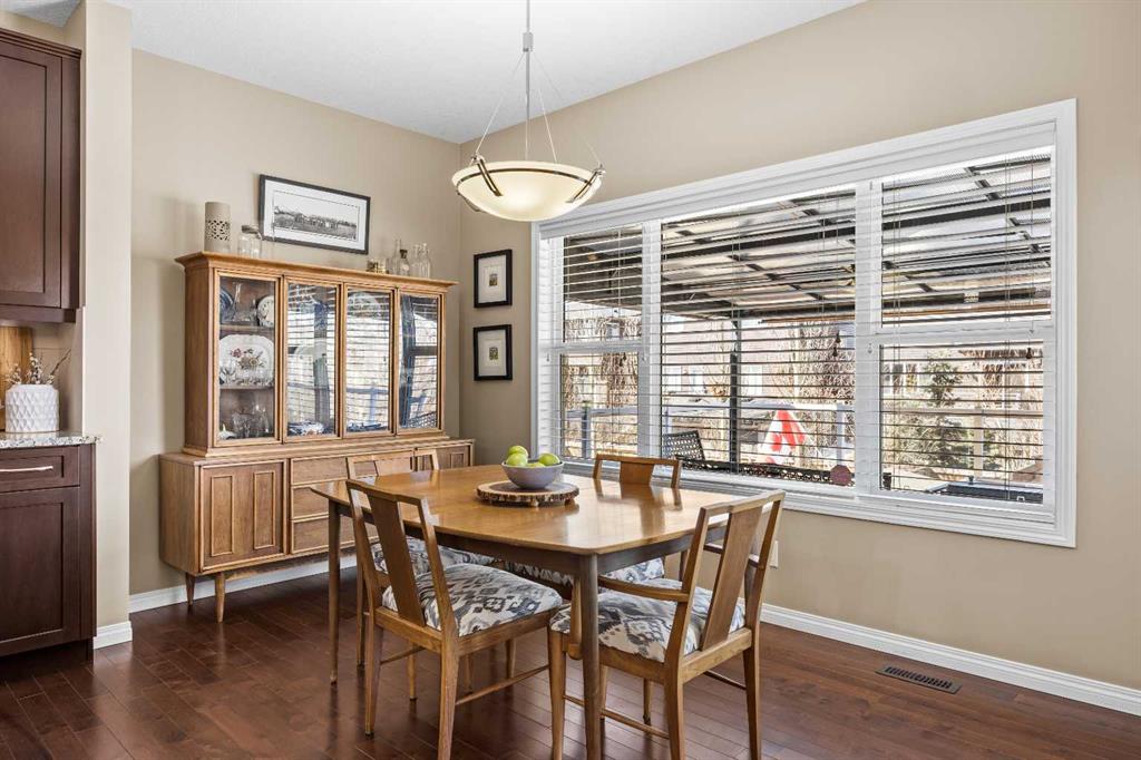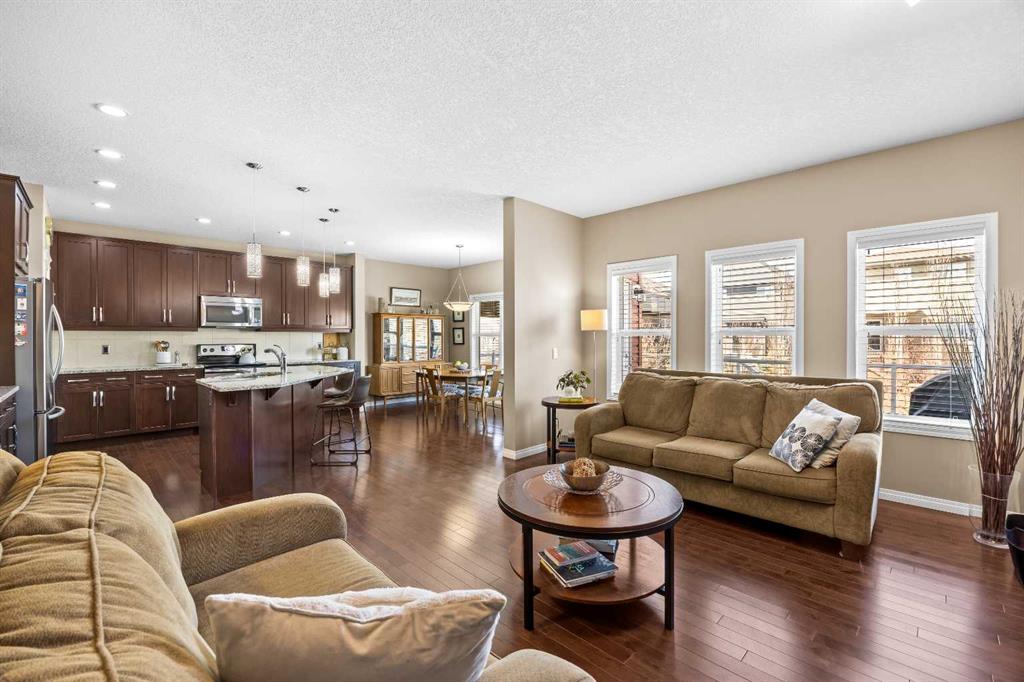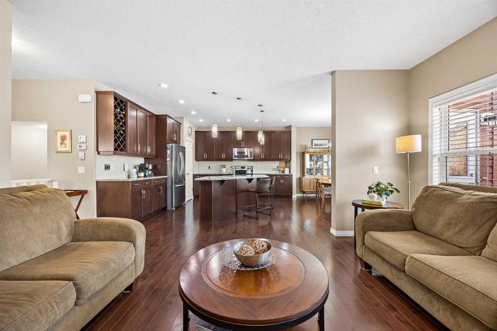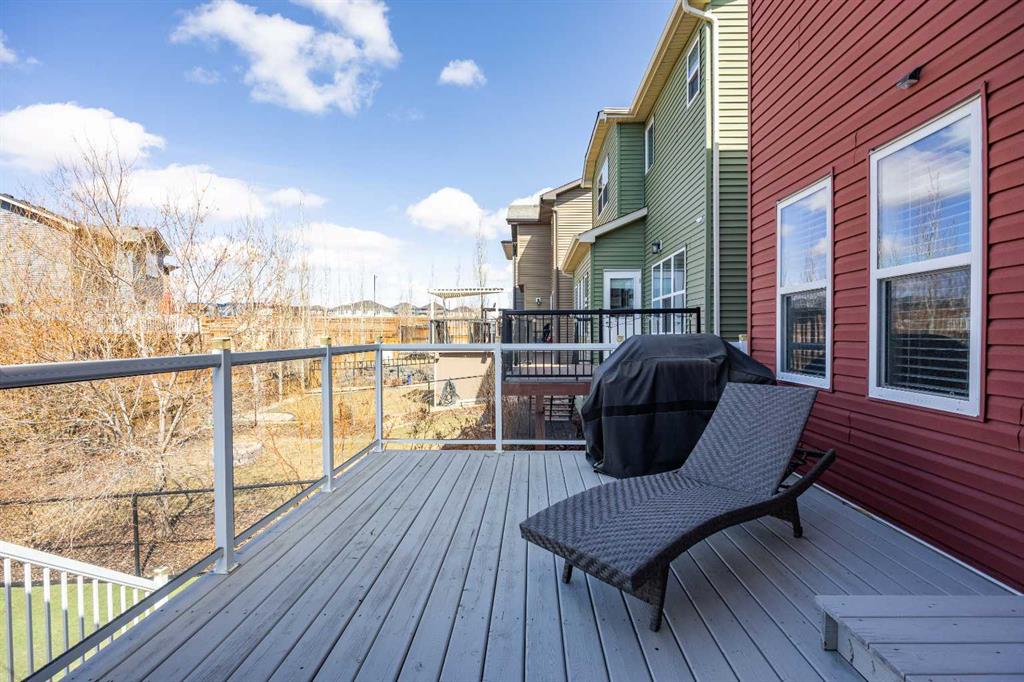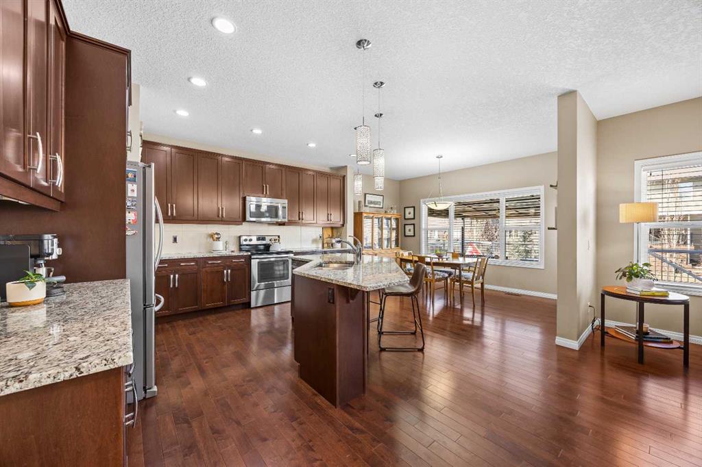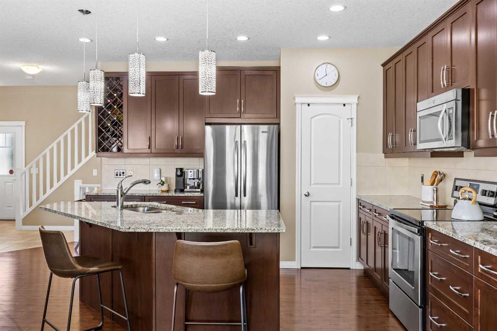 Open House Saturday, April 11, 2:30-4:30. This home has a great layout and outdoor space with low-maintenance turf backyard designed for easy living, complete with rock features, a full-width deck with pergola and BBQ gas line, and your very own putting green—perfect for relaxing evenings or entertaining friends. Inside offers a bright, open-concept main floor featuring hardwood floors, generous kitchen with granite countertops, stainless steel appliances, a walk-in pantry, and a large one-level island. The dining area is large enough for a big table and buffet. The living room features a gas fireplace with TV mount above. The steps down into mudroom and half-bath area give a touch of unique architechture. Upstairs offers a thoughtfully designed layout with two bedrooms at the front—both with walk-in closets—a full main bath, central bonus room and laundry, and a spacious primary suite at the back featuring a large walk-in closet and a 5-piece ensuite. The fully finished basement provides a wide open rec room, a third full bathroom, and the flexibility to easily add a fourth bedroom if desired, along with excellent storage throughout. The oversized heated garage is extended in depth, making it ideal for trucks or additional workspace. With air conditioning, pride of ownership throughout, a location just minutes to D’Arcy Ranch Golf Club, plus parks, pathways, playgrounds, and your own putting green in the back yard, this home has much to offer!