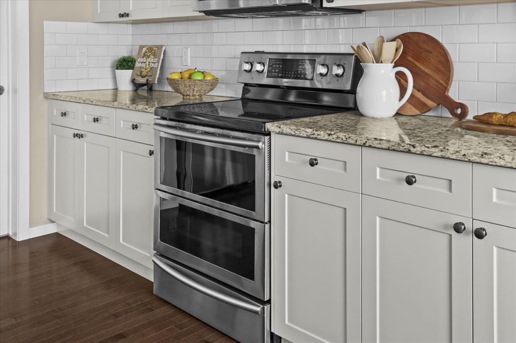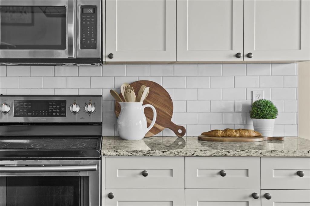 Inside, natural light moves effortlessly through the main floor, lending a warmth that settles in the moment you step inside. The kitchen is generous without ever feeling overstated; timeless white shaker cabinets, quartz countertops, classic subway tile, and stainless-steel appliances anchored together with ease. The breakfast nook and walk-through pantry sit right where you need them, adding to the rhythm of everyday life. Just beyond, the living room unfolds beneath soaring vaulted ceilings, and a home office sits tucked away, allowing the entire main floor to breathe as one, unhurried and connected.