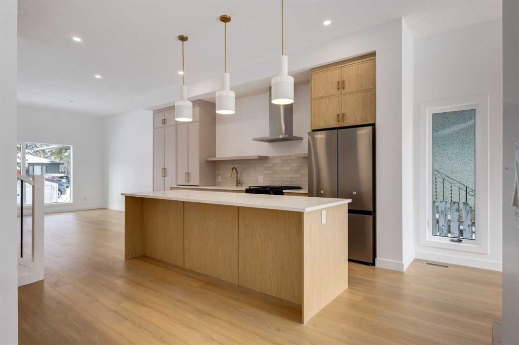 Inside, the home offers over 2,400 sq.ft. of finished living space with 3 bedrooms above grade & a 4th bedroom in the basement with large sunshine windows, along with 3.5 bathrooms. The main floor features flexible living with interchangeable dining, living, and den spaces, a custom fireplace, full height cabinetry, quartz counter-tops, stainless appliances, and luxury hard surface flooring throughout main/upper levels. The primary suite includes a private patio & spa inspired ensuite with walk-in shower and freestanding tub. The lower level includes a custom designed bar & spacious media room, ideal for entertaining. Large windows throughout the home fill the space with natural light, enhancing the modern & refined interior design. The exterior offers a generous backyard with a full custom deck and strong separation from neighbouring homes. Additional features include a detached double car garage, rough-in for air conditioning, a gas line for BBQ, and a durable exterior finished with Hardie board siding and corrugated metal accents. Located in the heart of Bowness, residents enjoy a vibrant community w/ access to a growing mix of local cafes, restaurants, and shops. With quick access to downtown and the mountains, this location offers an exceptional connected lifestyle.