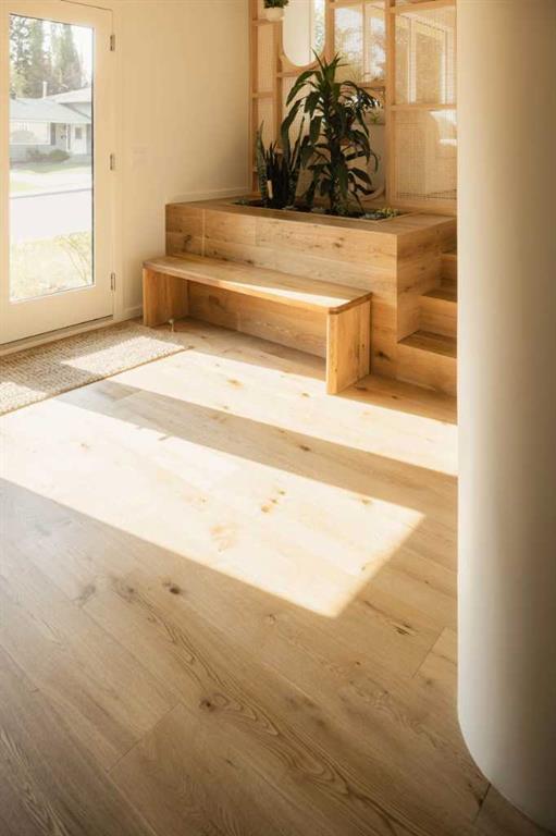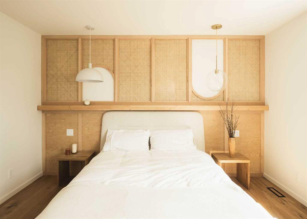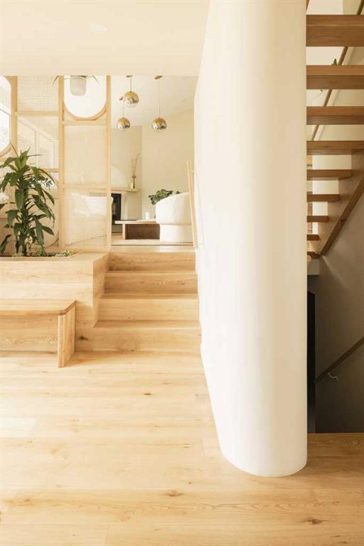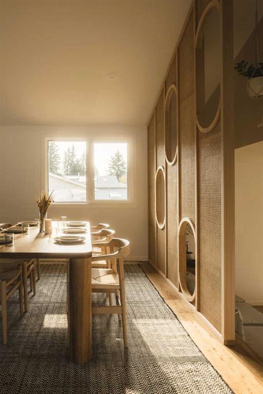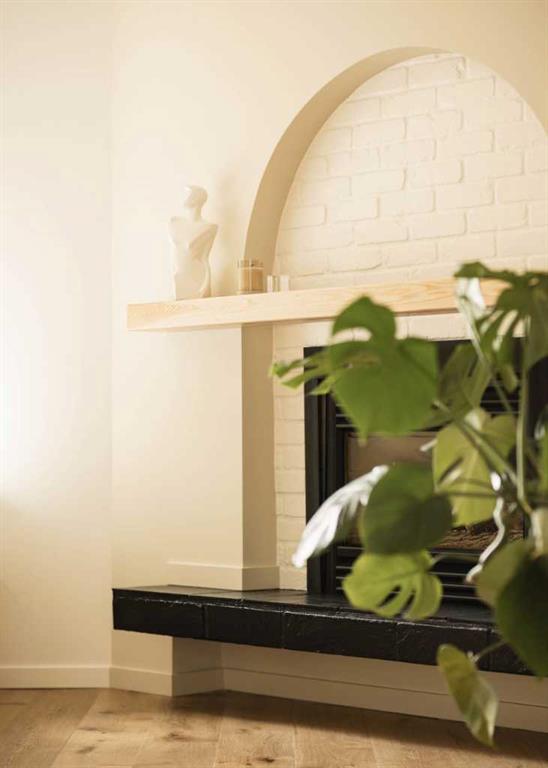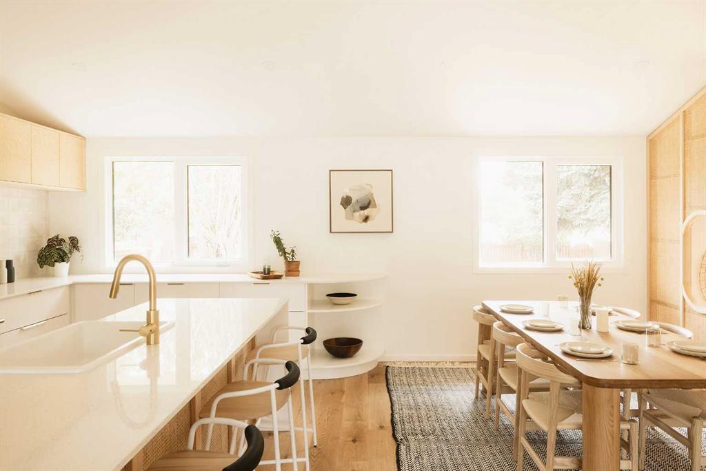 The design was led by Studio North, a Calgary-based firm known for creating spaces that are as functional as they are striking. The living area ceiling was vaulted to double height with curved geometry, flooding the home with light. Custom rattan millwork screens are featured throughout the home, beautiful and functional. Built-in planters bring greenery into the everyday. The original brick fireplace was transformed into a sculptural centrepiece. The kitchen is fully renovated with new cabinets and appliances, the primary bedroom has a new ensuite. Douglas fir, golden oak, and brass throughout. Nothing feels like an afterthought.
