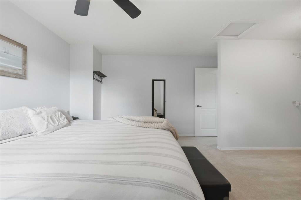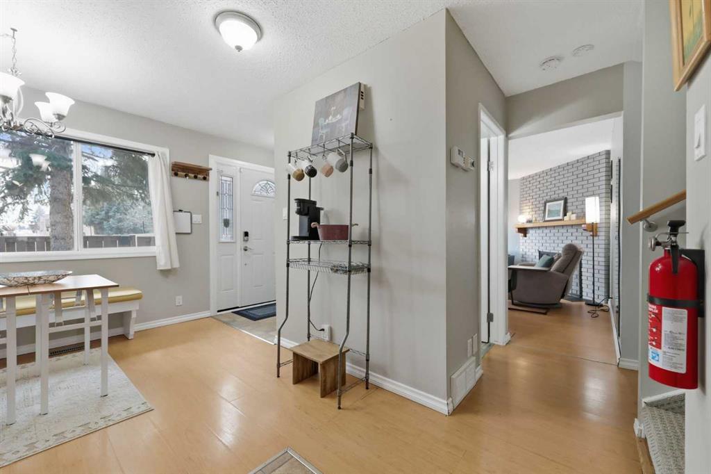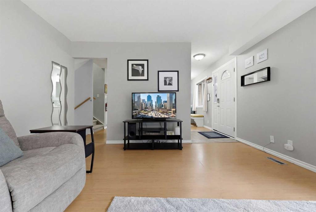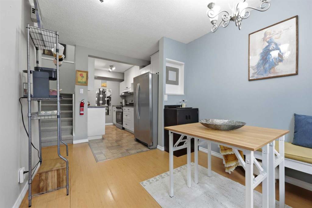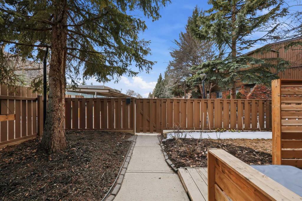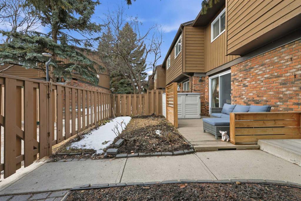 Affordable, sun-soaked, and full of character, this end-unit townhouse in the sought-after Prairie Meadows is a rare find. Priced to make the move from renting to owning finally feel within reach, this home checks every box without compromise. A private, gated yard sets it apart from every other unit in the complex, offering outdoor space that feels truly your own. The wood deck is made for summer evenings with friends, morning coffee, or simply soaking up the south-facing sun that pours through the windows and brightens every corner of the main floor throughout the day. Inside, the custom built-in bench in the dining nook is as functional as it is charming, the perfect spot to gather. The kitchen is practical and well-appointed with updated white shaker style cabinetry, generous counter space, and a new fridge (2023) and stove (2026). The living room is warm and anchored by a classic corner wood-burning fireplace, making cold Calgary winters something to look forward to. The half bath on the main floor completes this floor. Thoughtfully converted to a two-bedroom layout upstairs, both bedrooms are generously sized. The primary suite features a large walk-in closet. While the second bedroom offers flexible space - use it as a guest room, home office, or both. The full 5pc bathroom on this level delivers double sinks and excellent storage. The finished basement adds even more living space with a large recreation room and abundant storage throughout, a rare bonus at this price point. In-suite front-load laundry completes the lower level. Major mechanicals are already taken care of: furnace (2013), hot water tank (2019). This pet-friendly complex welcomes your four-legged family members, too. Move-in ready and waiting. Stop renting and start owning.