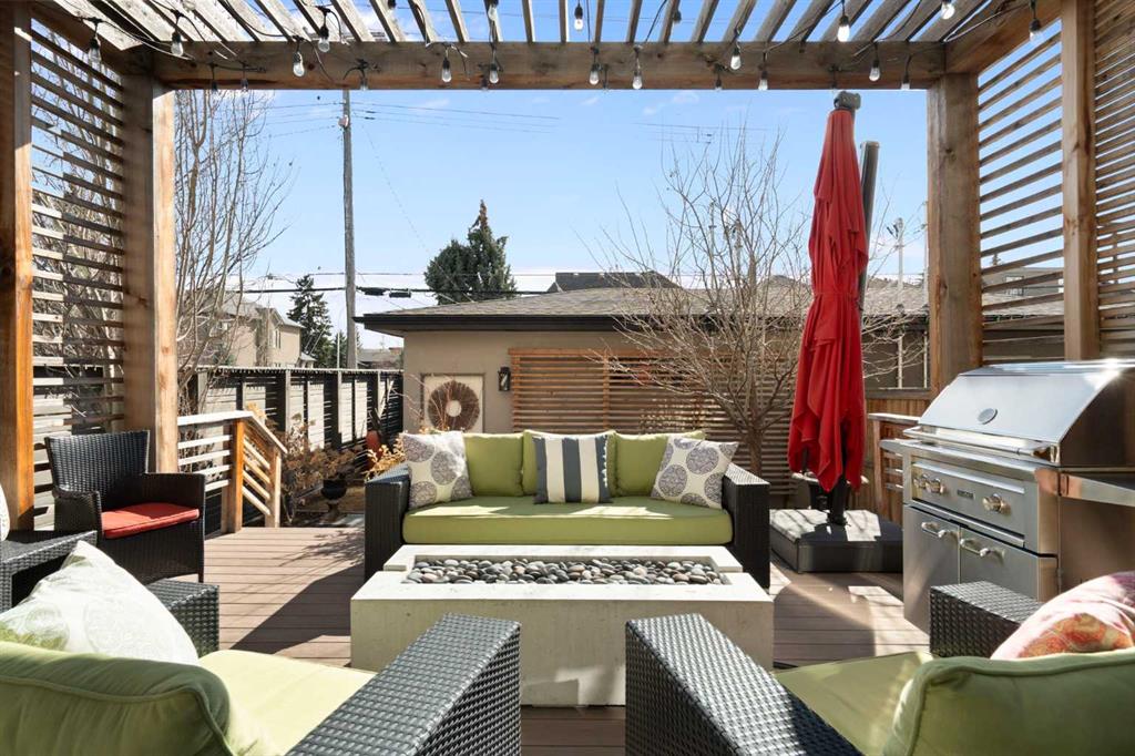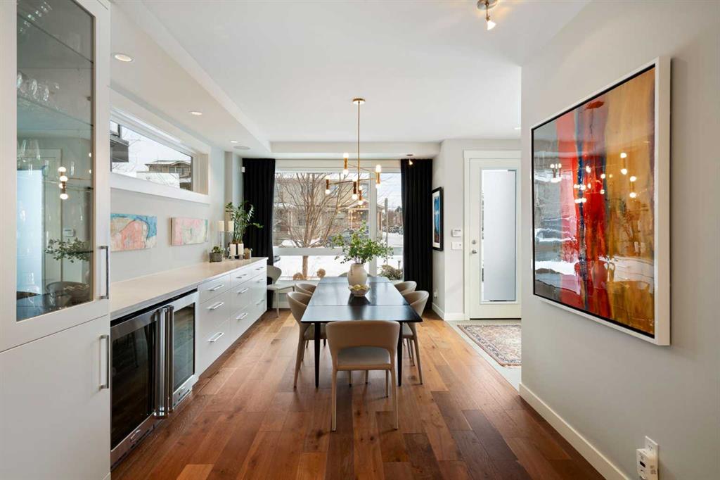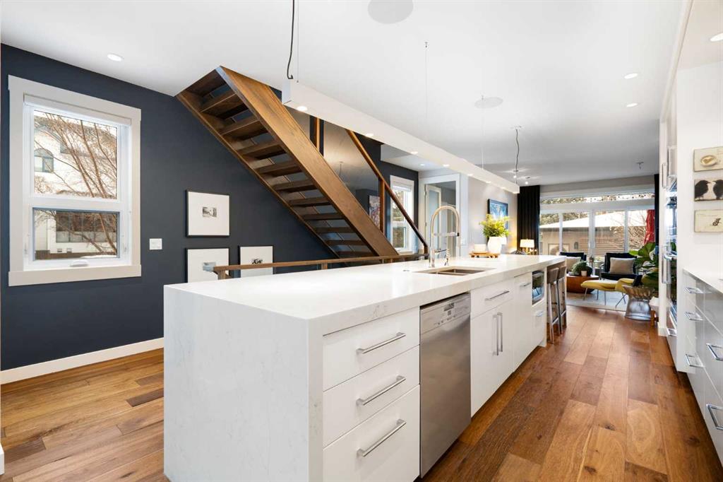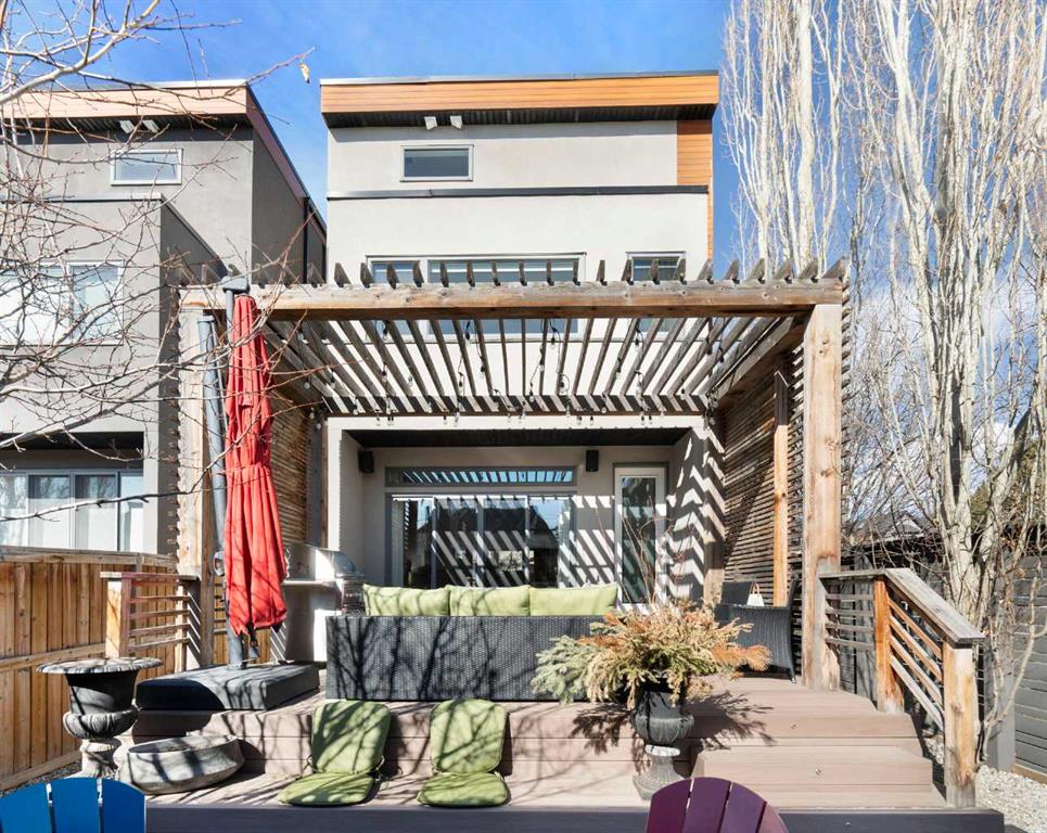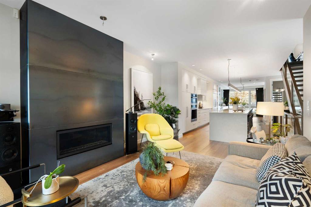 Welcome to 2201 Bowness Road NW, a rare and beautifully curated four-level home in one of West Hillhurst’s most sought-after pockets. Situated on a prime corner lot, this exceptional residence offers stunning downtown views, a sunny south-facing backyard, and over 3,700 sq. ft. of thoughtfully designed living space. Natural light pours through strategically placed oversized windows across every above-grade level, creating a bright and inviting atmosphere throughout. The main floor is a true showpiece, featuring engineered hardwood, striking open-riser wood staircases, and a statement raw metal gas fireplace. At the heart of the home is a nearly 16-foot waterfall island with built-in storage and integrated seating, perfectly paired with a chef-inspired kitchen complete with premium Sub-Zero, Miele, and JennAir appliances, custom cabinetry, and designer lighting. Sliding doors open seamlessly to the pergola-covered patio, extending the living space outdoors. The second level is ideal for family living, offering spacious secondary bedrooms, custom closet built-ins, a rare 6-piece bath with heated floors, a flexible bonus/family room, and access to the first upper deck. One of the bedrooms enjoys beautiful south-facing downtown views. The entire third level is dedicated to an exceptional primary retreat — a true private sanctuary. Enjoy your own covered balcony, wet bar and coffee station, custom open closet, and a luxurious 5-piece ensuite with heated tile floors, freestanding tub, and a stunning two-way fireplace. The fully developed basement offers 9-foot ceilings, a large recreation room with full wet bar, guest bedroom, full bathroom, and rough-in for in-floor heat. Outdoor spaces have been professionally curated with composite decking, pergola, mature landscaping, lighting, and rebuilt upper decks with vinyl decking and metal cladding. Additional features include air conditioning, zoned heating and cooling, Hunter Douglas blinds, built-in speakers, Vacuflo, Kinetico water system, security system, and insulated garage with Gladiator storage. A truly exceptional inner-city offering just minutes to downtown, Kensington, the Bow River pathways, and some of Calgary’s best amenities.