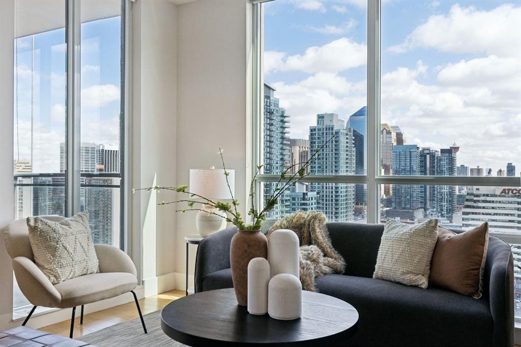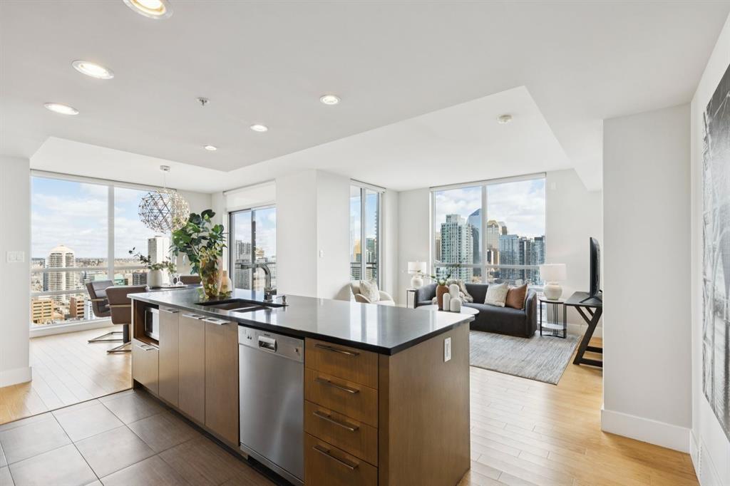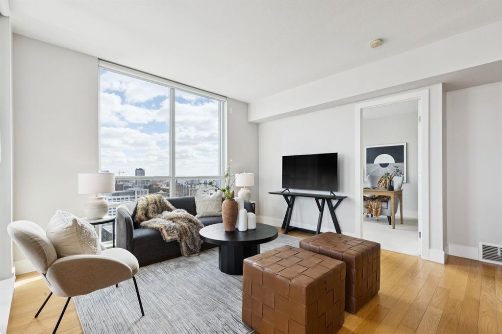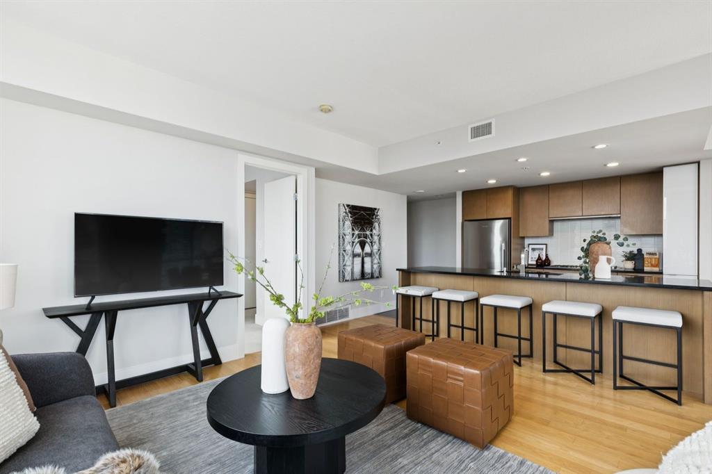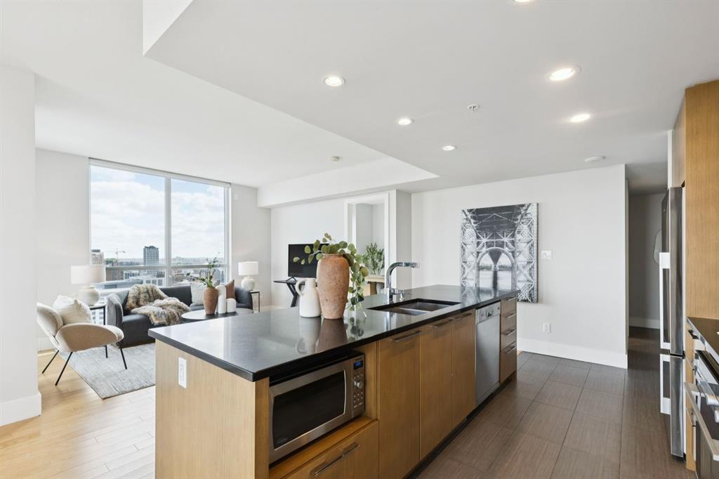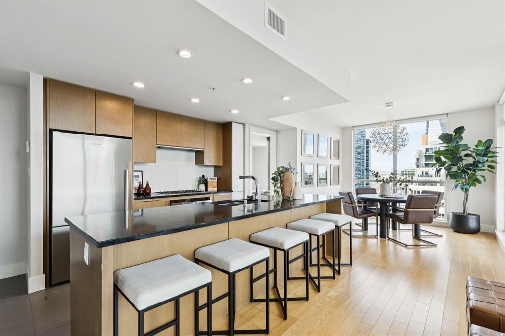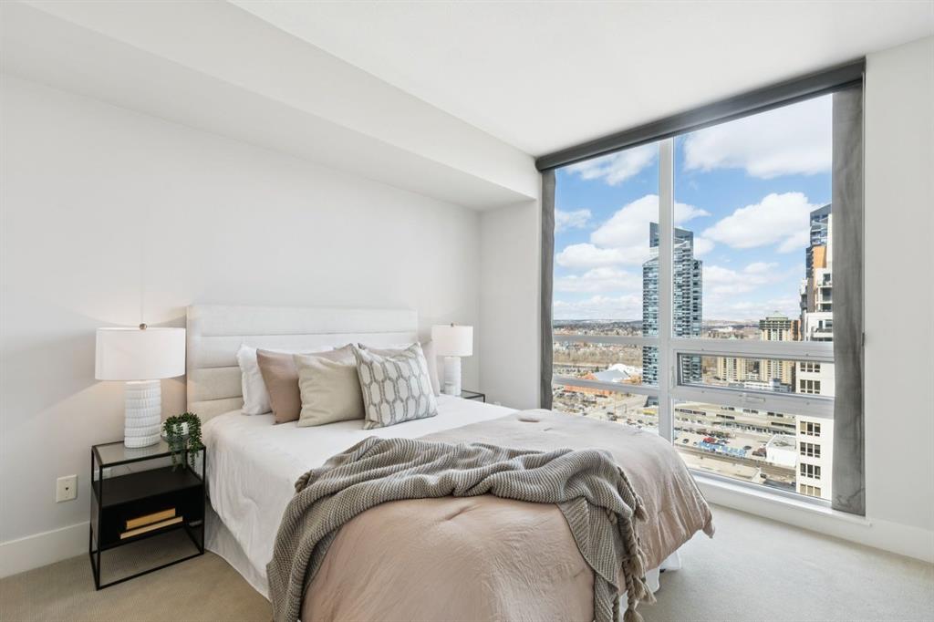 Experience elevated urban living in this stylish LUNA residence, where panoramic views stretch from the dazzling downtown skyline across North Hill, the Bow River valley, C.O.P., and out to the Rocky Mountains. Designed with one of the most sought after layouts, this bright and modern 2 bed/2 bath suite places the bedrooms on opposite sides for optimal privacy, with an open concept kitchen, living, and dining area at its heart. Flooded with natural light from floor-to-ceiling windows, the home exudes warmth while maintaining a sleek, contemporary aesthetic. The well equipped kitchen showcases warm wood cabinetry, black quartz counters, a glass backsplash, and premium stainless steel appliances including Fisher & Paykel refrigerator, gas cooktop, and oven, and a Blomberg dishwasher. A spacious island with seating flows seamlessly into the dining area, which opens onto a glass-railed balcony that's perfect for soaking in breathtaking panoramic views. The primary retreat offers a custom walk-through closet leading to a luxurious 5pc ensuite featuring in-floor heating, a deep soaker tub, and a separate shower. The second bedroom is equally well appointed with dual closets and convenient access to a 3pc cheater ensuite. Thoughtful touches like custom blackout blinds, air conditioning, in-suite laundry, and additional in-suite storage ensure everyday comfort and convenience. Residents of LUNA enjoy an exceptional array of amenities including a fully equipped gym, yoga studio, steam spa, party room, guest suites, concierge service, visitor parking, and a serene outdoor zen garden with fireplace. Located in the heart of the vibrant Beltline, you’re just steps from shopping, dining, the Bow River pathways, and everyday essentials. Complete with a storage locker (Level 3 #316) and underground parking (P1 #L28) this home offers the perfect blend of luxury, functionality, and unbeatable inner-city lifestyle.