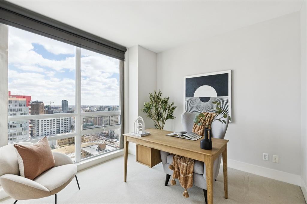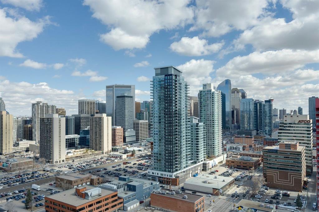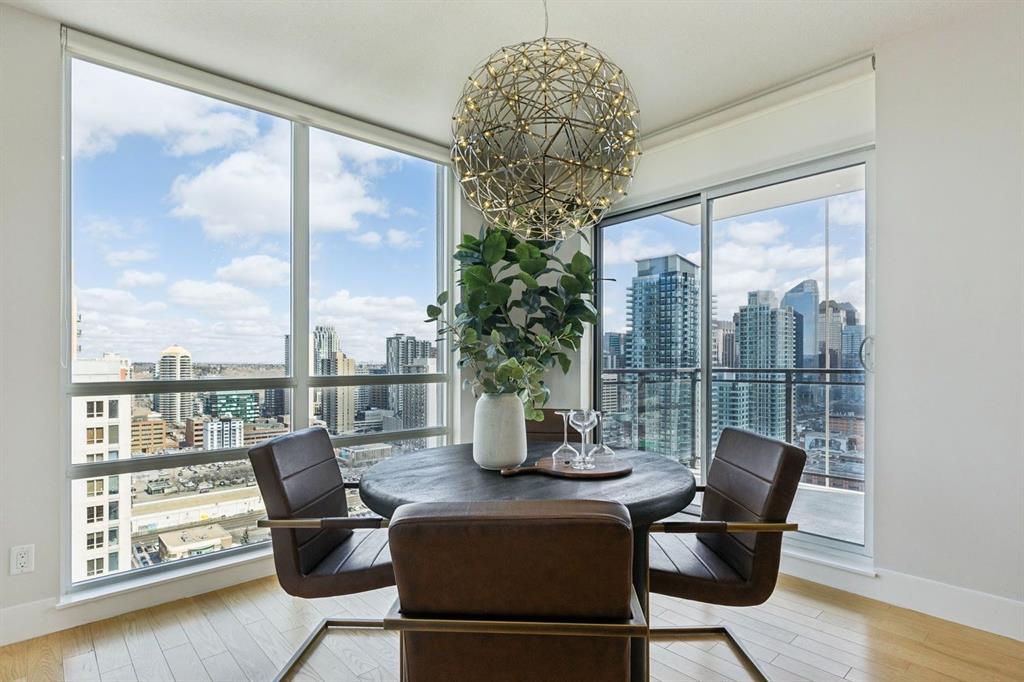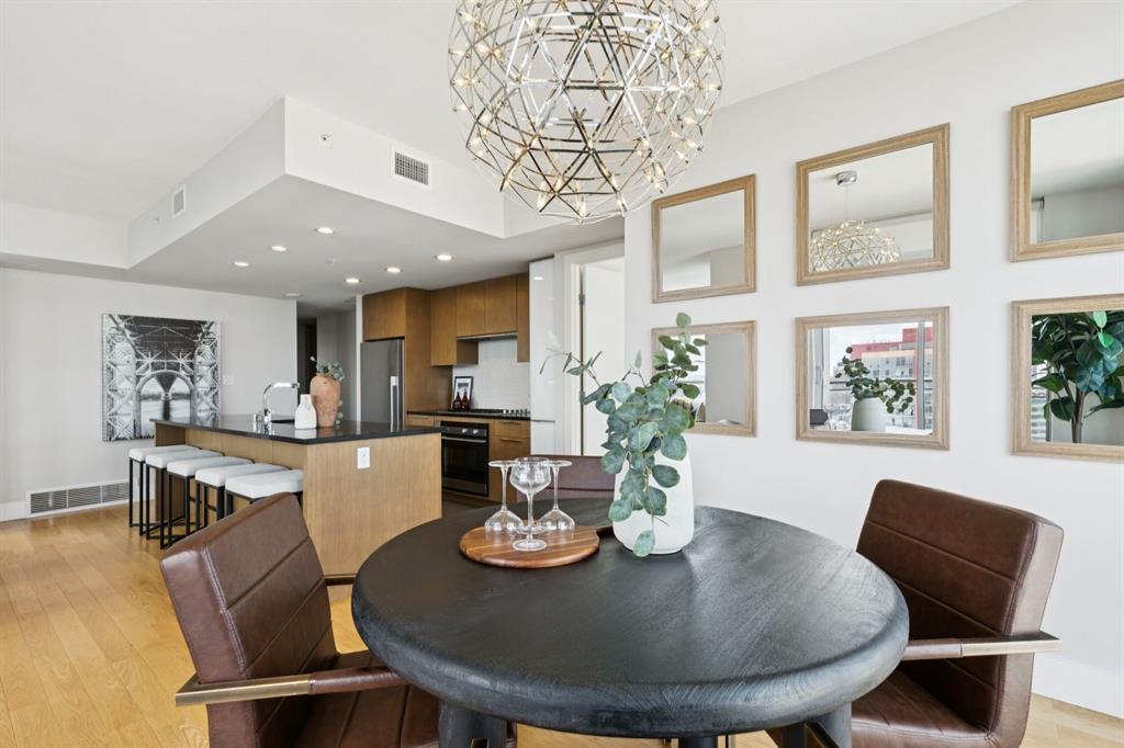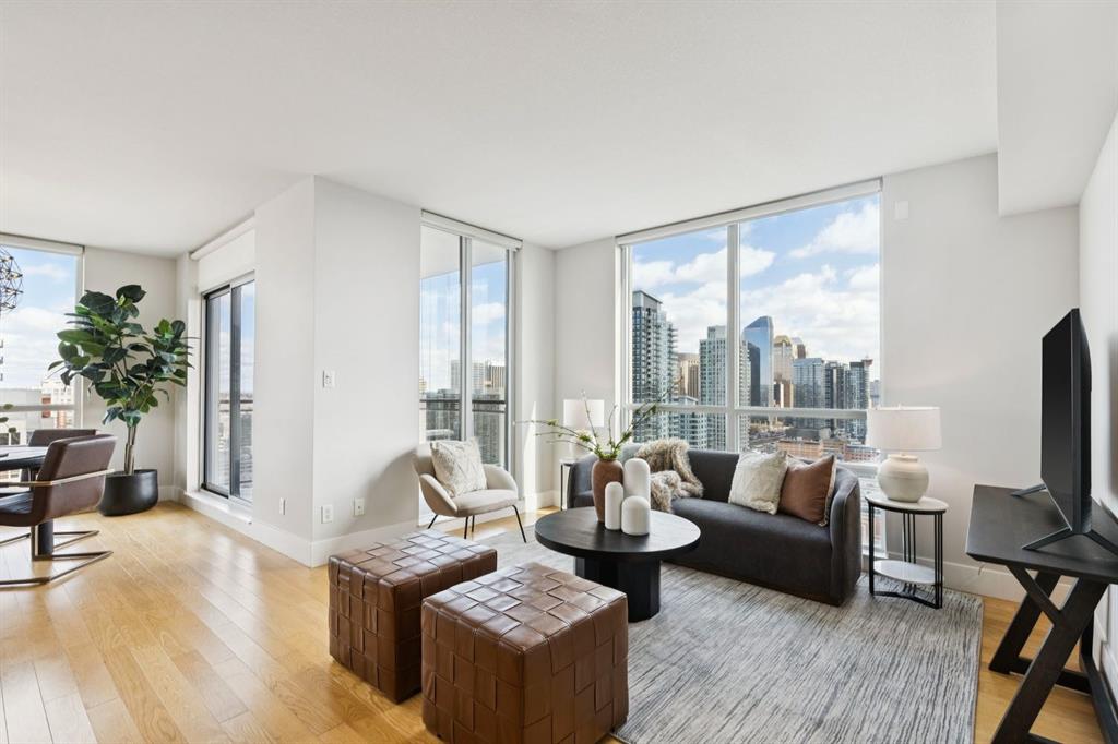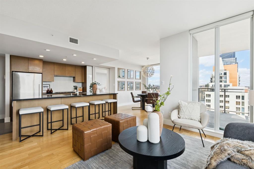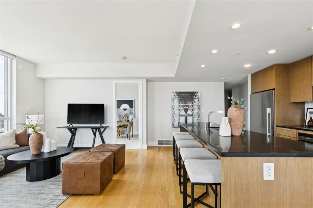 Experience elevated urban living in this stylish LUNA residence, where panoramic views stretch from the dazzling downtown skyline across North Hill, the Bow River valley, C.O.P., and out to the Rocky Mountains. Designed with one of the most sought after layouts, this bright and modern 2 bed/2 bath suite places the bedrooms on opposite sides for optimal privacy, with an open concept kitchen, living, and dining area at its heart. Flooded with natural light from floor-to-ceiling windows, the home exudes warmth while maintaining a sleek, contemporary aesthetic. The well equipped kitchen showcases warm wood cabinetry, black quartz counters, a glass backsplash, and premium stainless steel appliances including Fisher & Paykel refrigerator, gas cooktop, and oven, and a Blomberg dishwasher. A spacious island with seating flows seamlessly into the dining area, which opens onto a glass-railed balcony that's perfect for soaking in breathtaking panoramic views. The primary retreat offers a custom walk-through closet leading to a luxurious 5pc ensuite featuring in-floor heating, a deep soaker tub, and a separate shower. The second bedroom is equally well appointed with dual closets and convenient access to a 3pc cheater ensuite. Thoughtful touches like custom blackout blinds, air conditioning, in-suite laundry, and additional in-suite storage ensure everyday comfort and convenience. Residents of LUNA enjoy an exceptional array of amenities including a fully equipped gym, yoga studio, steam spa, party room, guest suites, concierge service, visitor parking, and a serene outdoor zen garden with fireplace. Located in the heart of the vibrant Beltline, you’re just steps from shopping, dining, the Bow River pathways, and everyday essentials. Complete with a storage locker (Level 3 #316) and underground parking (P1 #L28) this home offers the perfect blend of luxury, functionality, and unbeatable inner-city lifestyle.