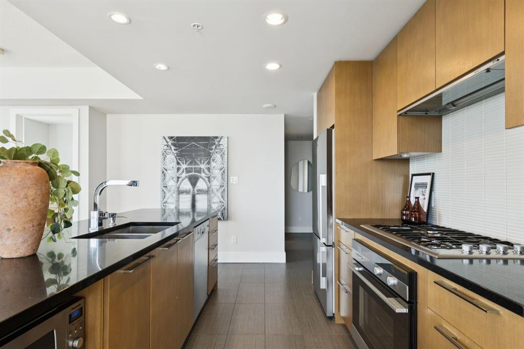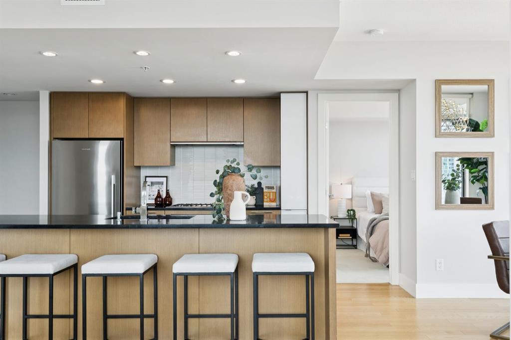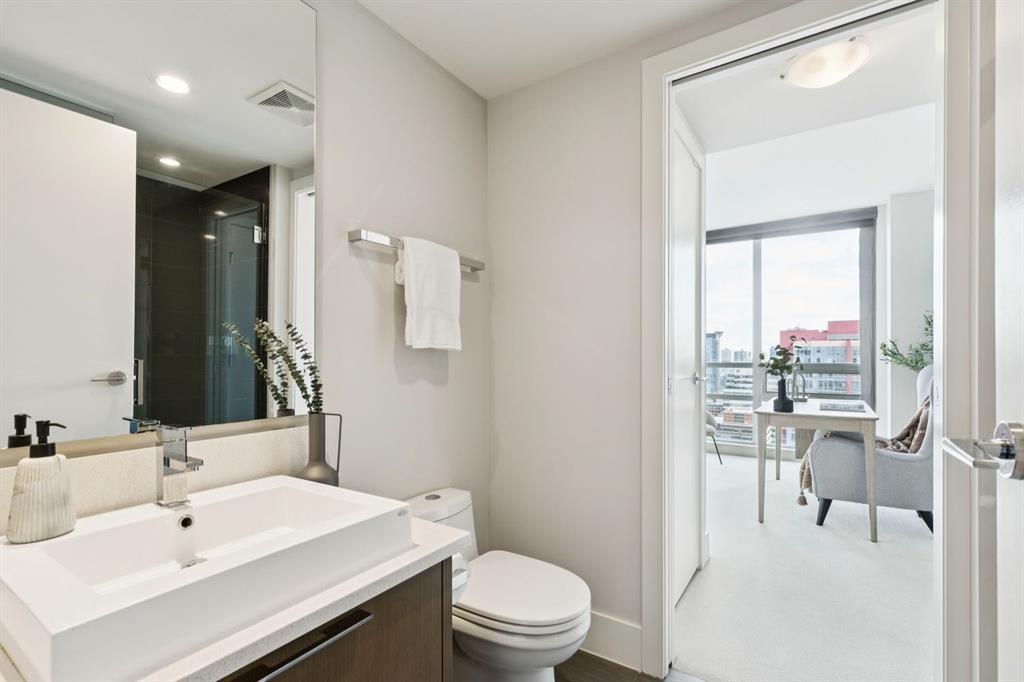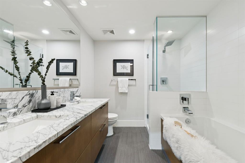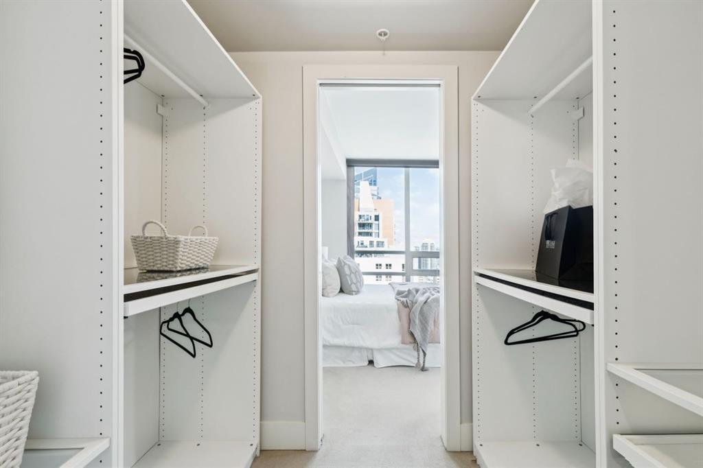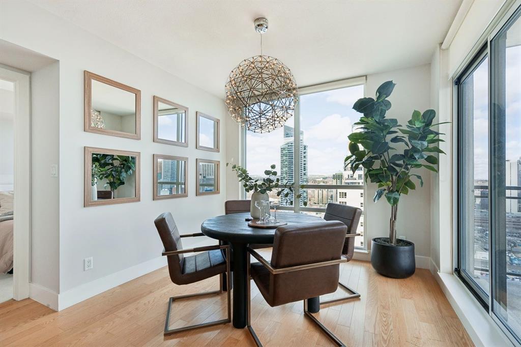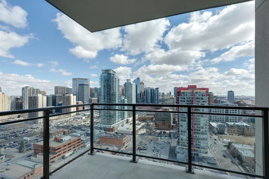 Experience elevated urban living in this stylish LUNA residence, where panoramic views stretch from the dazzling downtown skyline across North Hill, the Bow River valley, C.O.P., and out to the Rocky Mountains. Designed with one of the most sought after layouts, this bright and modern 2 bed/2 bath suite places the bedrooms on opposite sides for optimal privacy, with an open concept kitchen, living, and dining area at its heart. Flooded with natural light from floor-to-ceiling windows, the home exudes warmth while maintaining a sleek, contemporary aesthetic. The well equipped kitchen showcases warm wood cabinetry, black quartz counters, a glass backsplash, and premium stainless steel appliances including Fisher & Paykel refrigerator, gas cooktop, and oven, and a Blomberg dishwasher. A spacious island with seating flows seamlessly into the dining area, which opens onto a glass-railed balcony that's perfect for soaking in breathtaking panoramic views. The primary retreat offers a custom walk-through closet leading to a luxurious 5pc ensuite featuring in-floor heating, a deep soaker tub, and a separate shower. The second bedroom is equally well appointed with dual closets and convenient access to a 3pc cheater ensuite. Thoughtful touches like custom blackout blinds, air conditioning, in-suite laundry, and additional in-suite storage ensure everyday comfort and convenience. Residents of LUNA enjoy an exceptional array of amenities including a fully equipped gym, yoga studio, steam spa, party room, guest suites, concierge service, visitor parking, and a serene outdoor zen garden with fireplace. Located in the heart of the vibrant Beltline, you’re just steps from shopping, dining, the Bow River pathways, and everyday essentials. Complete with a storage locker (Level 3 #316) and underground parking (P1 #L28) this home offers the perfect blend of luxury, functionality, and unbeatable inner-city lifestyle.