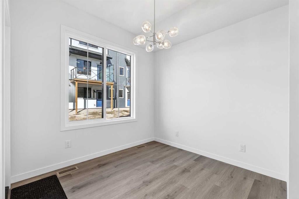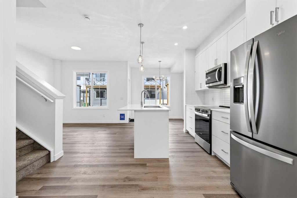 This fully finished two-storey townhome offers exceptional flexibility with four bedrooms and four bathrooms across three levels of developed living space. The main floor features a bright open-concept layout connecting the kitchen, dining area, and living room, creating a comfortable space for both everyday living and entertaining. The kitchen is beautifully finished with modern slab-style cabinetry featuring 42” upper cabinets, a full bank of drawers, soft-close doors, polished white quartz countertops, tile backsplash, stainless steel Whirlpool appliances, and a polished chrome Moen high-arc faucet with pull-down sprayer. Luxury vinyl plank flooring runs throughout the main living areas, bathrooms, and laundry room, while contemporary lighting selected by professional designers completes the modern interior.