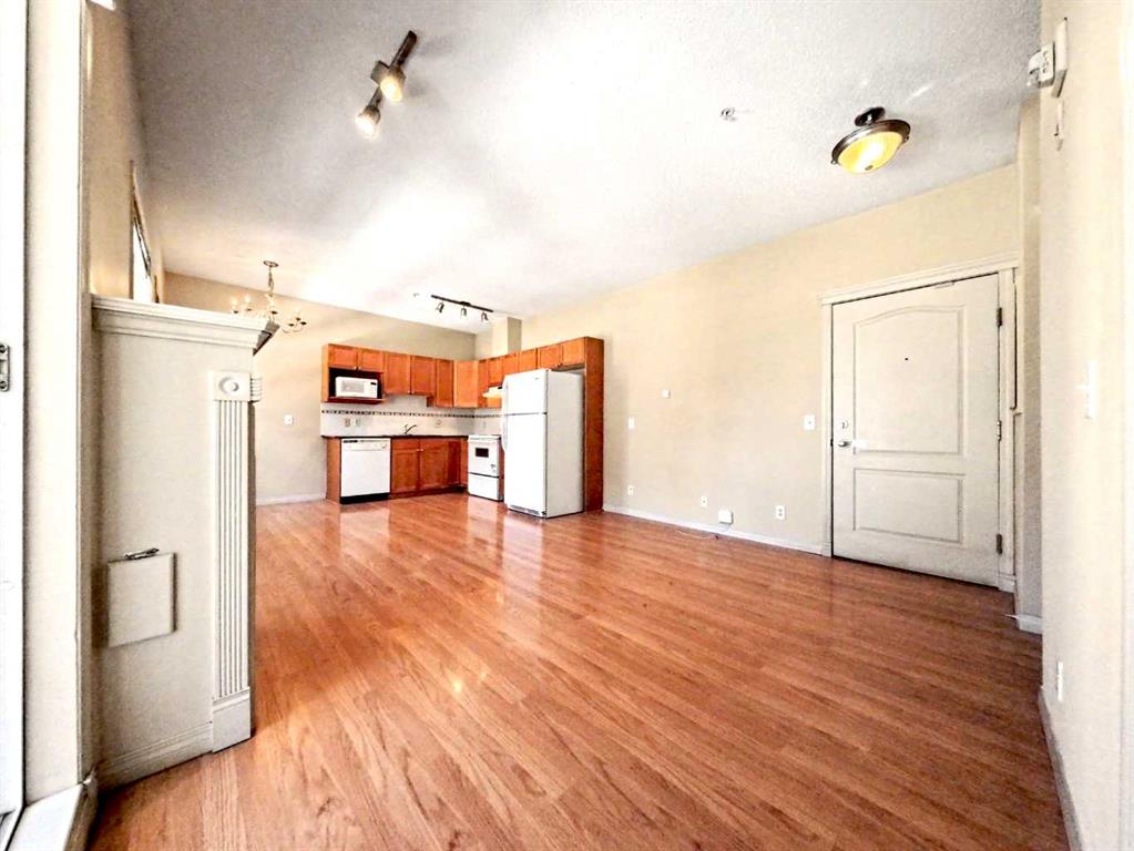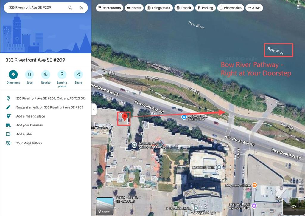 Concrete-construction downtown condo in a low-rise building directly on the Bow River — the pathway system is accessible from the building's front entrance, connecting to Prince's Island Park, St. Patrick's Island, and over 800 kilometres of Calgary's urban trail network. A practical choice for a downtown professional, a first-time buyer entering the market below the cost of renting, or an investor seeking a tenant-ready unit in a Walk Score 97 location. West-facing windows frame an open city view toward the downtown skyline, with afternoon light filling the open-concept layout. Nine-foot ceilings and in-floor radiant heating throughout — no forced-air noise, no ductwork, no dust — producing a warm, quiet space that feels substantially larger than its footprint. An electric fireplace anchors the living area, which opens to a private balcony. The kitchen includes a dishwasher, range, range hood, and refrigerator. In-suite laundry and elevator access. Heated underground parking and storage locker included. The condo contribution covers heat, water, sewer, building insurance, snow removal, heated underground parking, and reserve fund contributions — consolidating what would otherwise be six or seven separate monthly bills into one predictable payment. At this price point, monthly ownership costs including the condo contribution are comparable to current East Village one-bedroom rental rates. Continuously owner-occupied since the building's completion, with 25 years of professional management by Magnum York. The C-Train free fare zone is a six-minute walk. Real Canadian Superstore, the New Central Library, Stampede Park, and East Village's expanding collection of cafés, restaurants, and shops are all within walking distance.