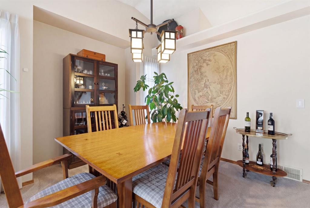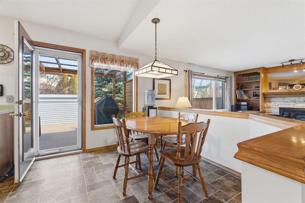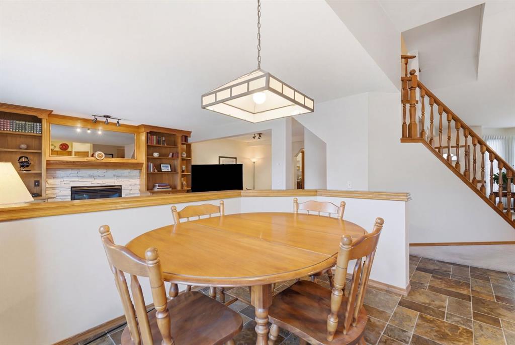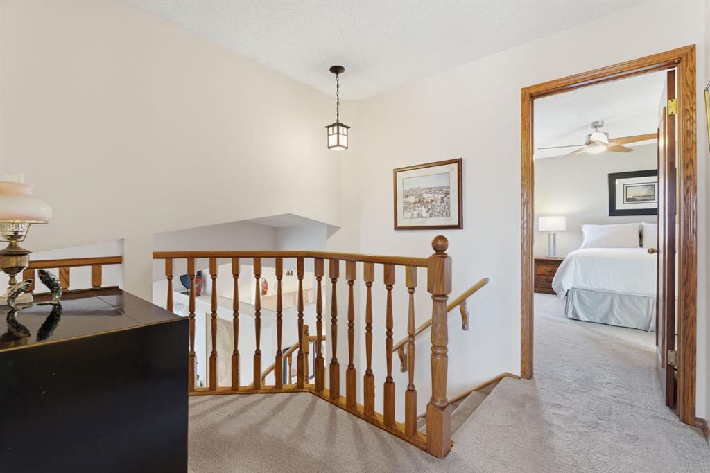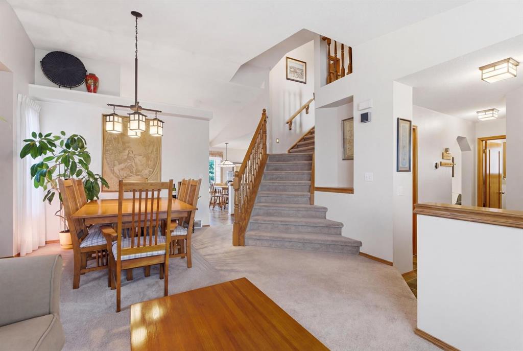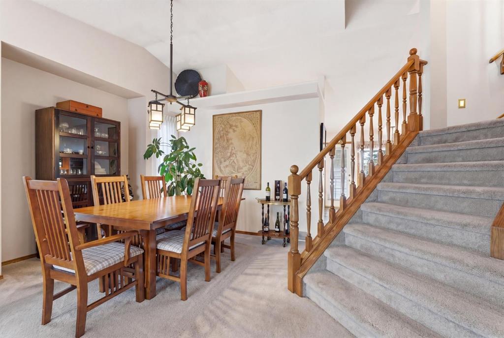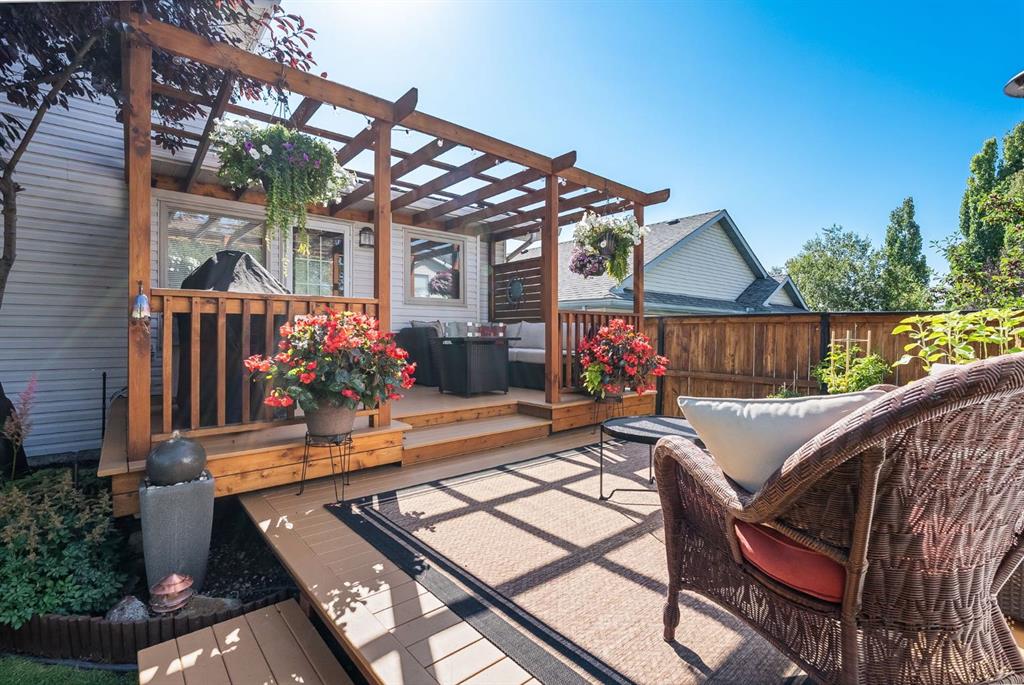 Welcome to this beautifully maintained home! Upon entering, you'll be greeted by soaring vaulted ceilings, modern light fixtures, and a stunning grand staircase. The formal living room features large windows draw in the natural light, while a well-sized dining room awaits just beyond. Adjacent to these areas is the “U-shaped” kitchen, complete with a corner pantry for extra storage, solid oak cabinets, and a sink that overlooks the gorgeous backyard. The kitchen flows into the breakfast nook with direct access to your private outdoor space. Outside is a true oasis, featuring a two-tier cedar deck with privacy screens, an outdoor shed, and an irrigation system—all enhanced by strategically placed landscape lighting and surrounded by mature trees. The main floor also includes a spacious living room, highlighted by a gas fireplace with custom built-ins and stone accents. Additionally, there is a den, a conveniently located main floor laundry room and a private powder room. Upstairs, the large primary bedroom boasts a walk-in closet and a spa-inspired ensuite with a separate shower, a luxurious jetted tub, and elegant stone counters. Two more generously sized bedrooms share a well-appointed four-piece main bath, also featuring stone counters. Enjoy the comforts of air conditioning, convenience of a smart thermostat, smart garage door, safety of security cameras and NO POLY B! Douglasdale Estates is a well-established family community with easy access to shopping, dining, Douglasdale Golf Club, parks, tennis courts, and scenic walking and biking paths that connect to the Bow River pathway system and Fish Creek Park. With quick access to Deerfoot Trail, commuting within the city is a breeze. The pride of ownership is evident throughout this home—schedule your showing today!