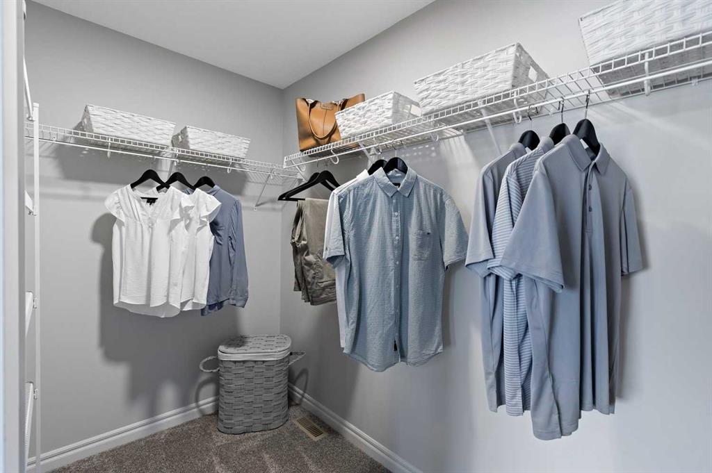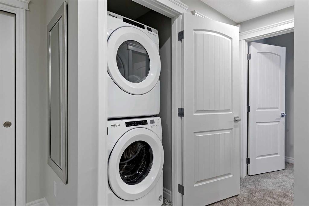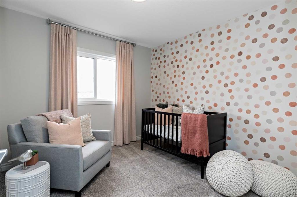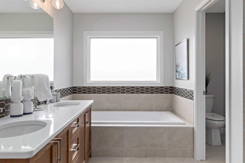 Upstairs, the home offers 5 bedrooms above grade, including dual primary suites, making it ideal for growing families. The main primary retreat features a spacious walk-in closet and a beautifully appointed ensuite with double vanity and soaking tub. Secondary bedrooms are generously sized, and the central loft/bonus room provides valuable additional living space. Tile flooring enhances the upper bathrooms and laundry room, while plush carpet adds comfort throughout the bedrooms and upper floor.