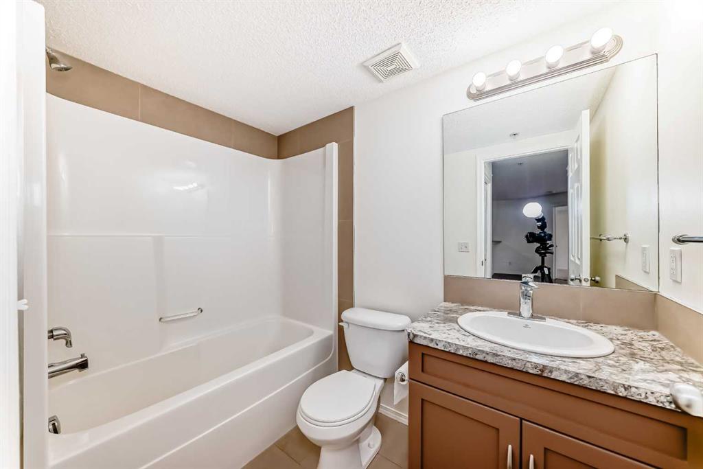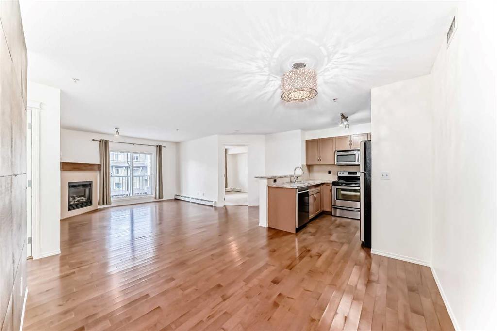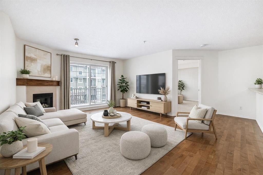 Welcome to Prestwick Place in McKenzie Towne—an updated, contemporary apartment-style condo offering 841 sq. ft. of comfortable, open-concept living just minutes to schools, parks, and shopping. Hardwood flooring flows through the main living space, where a bright open kitchen features stainless steel appliances, and an island. The spacious living room is anchored by a cozy fireplace with direct access to the balcony—perfect for morning coffee or evening downtime. The thoughtful layout includes two generous bedrooms, with the primary including a walk-in closet and 4-piece ensuite, plus a versatile den ideal for a home office or storage. Recent updates include fresh paint, new countertops, a newer dishwasher, and a newer microwave/hood fan. Finished with in-suite laundry. One indoor titled parking stall with a storage locker. Some photos have been virtually staged to give you an idea of what you can do with this great space. Condo fees: $461.43.